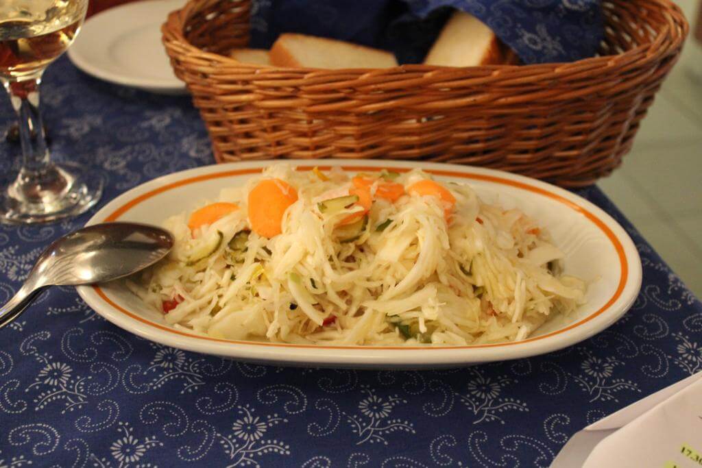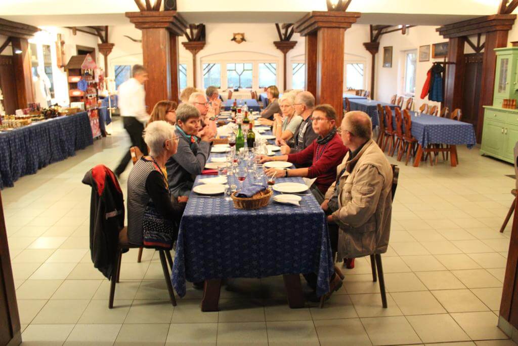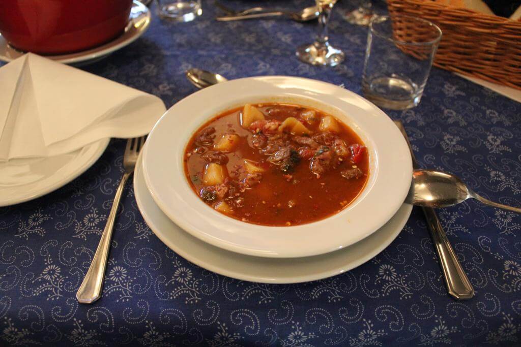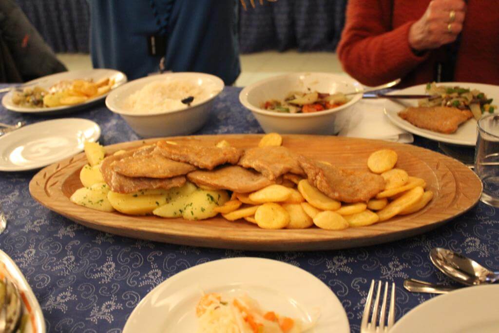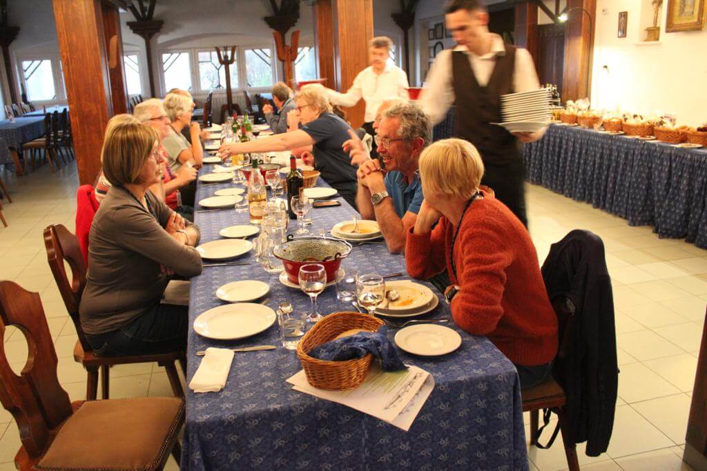 So viel Neues macht hungrig. Und so genießen wir unser Begrüßungsessen mit Kesselgulasch, Schweinebraten, Beilagen und Milchkuchen und ungarischem Wein.
