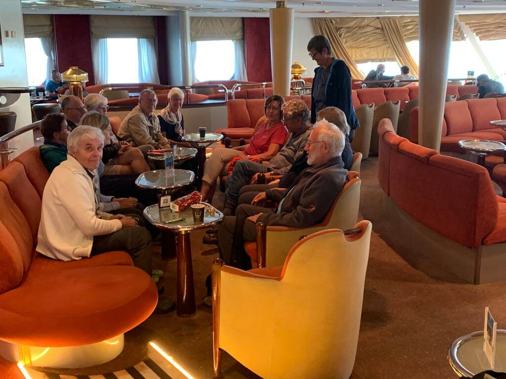 Die Nacht auf der Fähre war sehr angenehm, das Meer ist ruhig. Wir können gemütlich ausschlafen. Am Morgen kommt die Sonne durch. Wir treffen uns beim oder nach dem Frühstück und haben gute Sicht auf die italienische Halbinsel Gargano und die vorgelagerten Inseln. Mittags essen einige im Bordrestaurant. Danach machen die meisten ein Mittagsschläfchen im Wohnmobil.