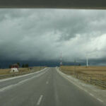 Von weitem sehen wir schon die Schlechtwetterfront auf uns zukommen. Bald fahren wir im Regen und die Temperatur fällt rapide.