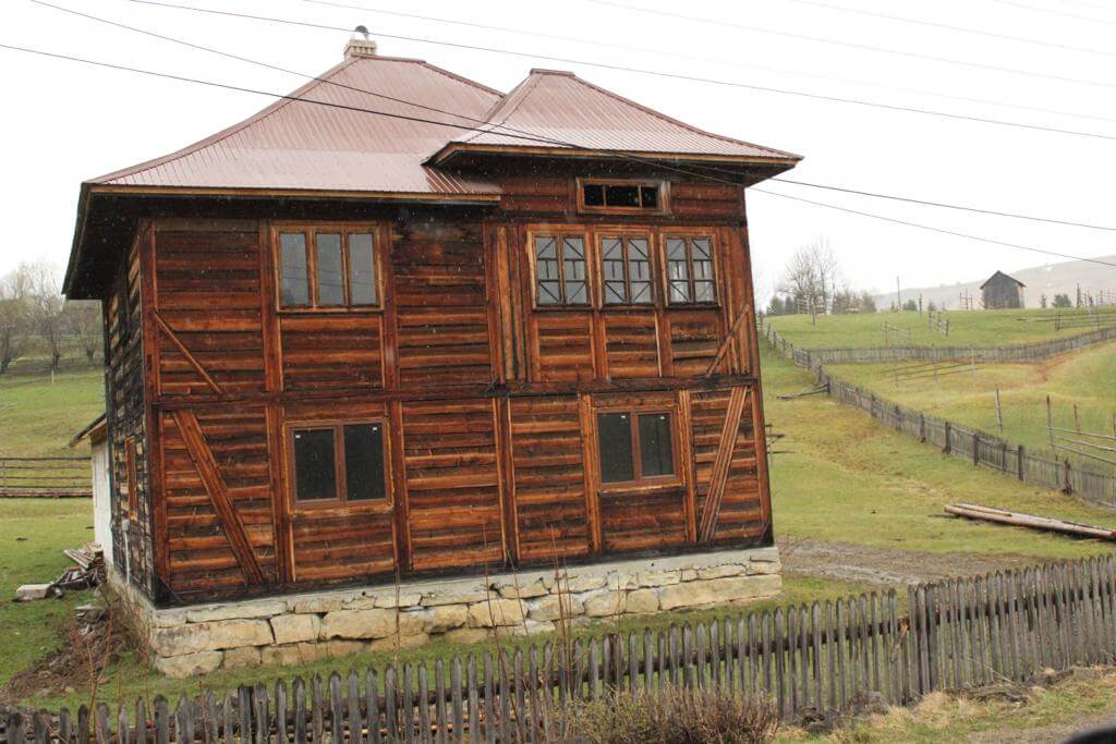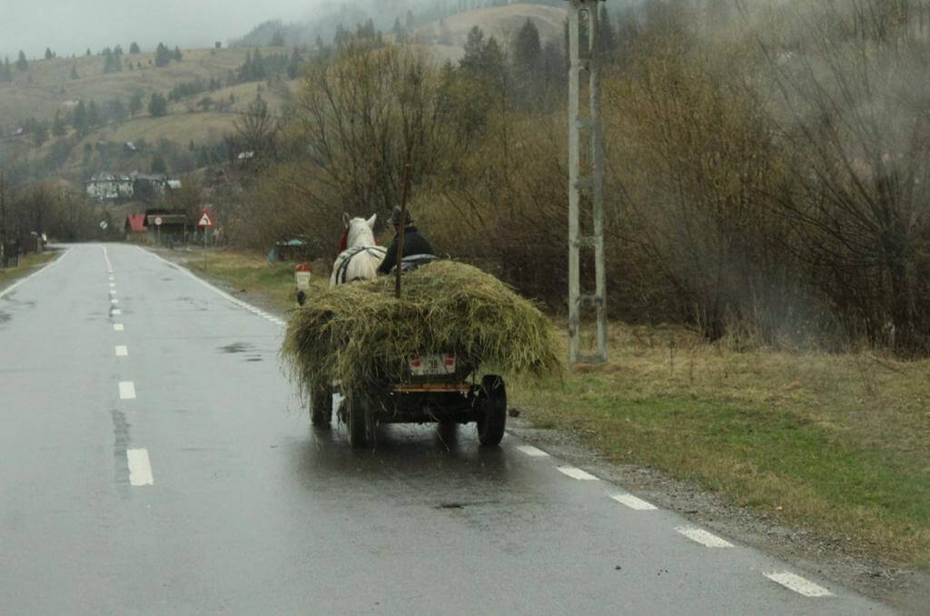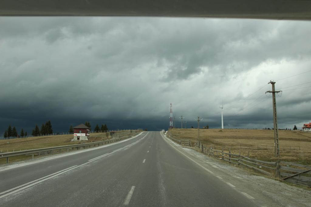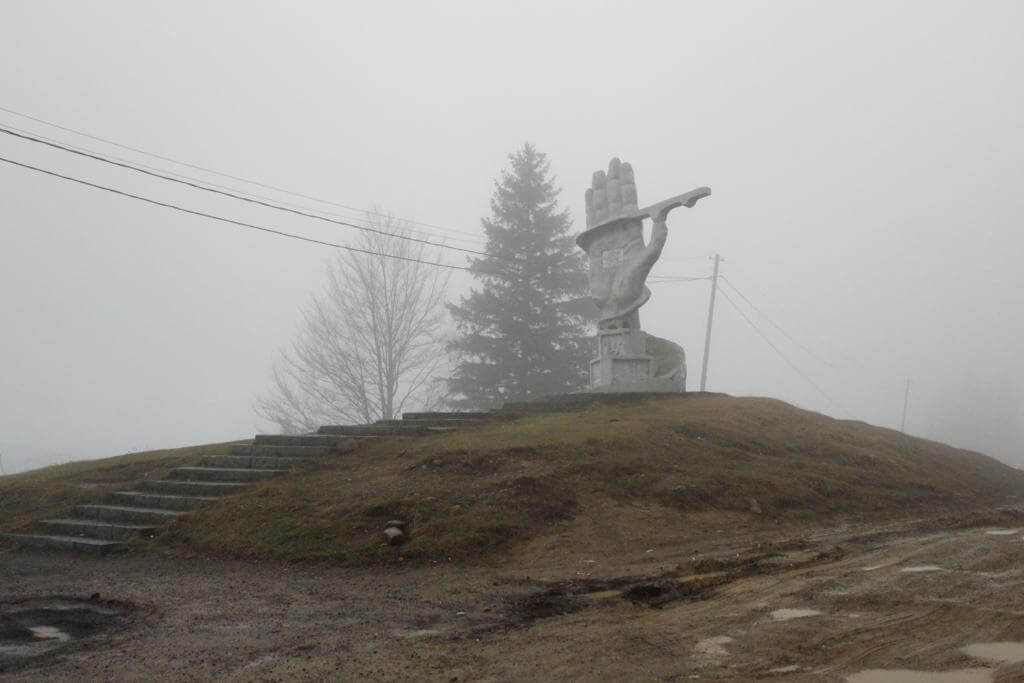 Wir zweigen auf eine kleine Gebirgsstraße ab und fahren in Serpentinen zum 1.109 m hohen Ciumarna-Pass. Oben sehen wir eine meterhohe Skulptur in Form einer Hand. Heute herrscht hier dichter Nebel. Dieses Denkmal aus den 1950er Jahren ist den Helden des Straßenbaus gewidmet, die damals mit einfachsten Mitteln diese Gebirgsstrasse gebaut haben.