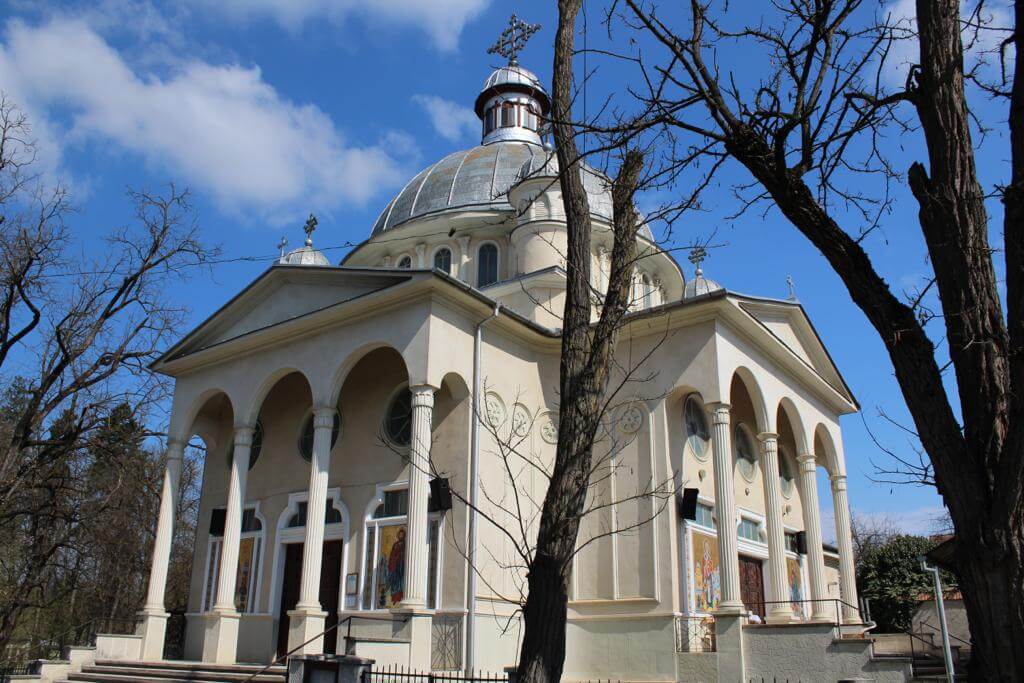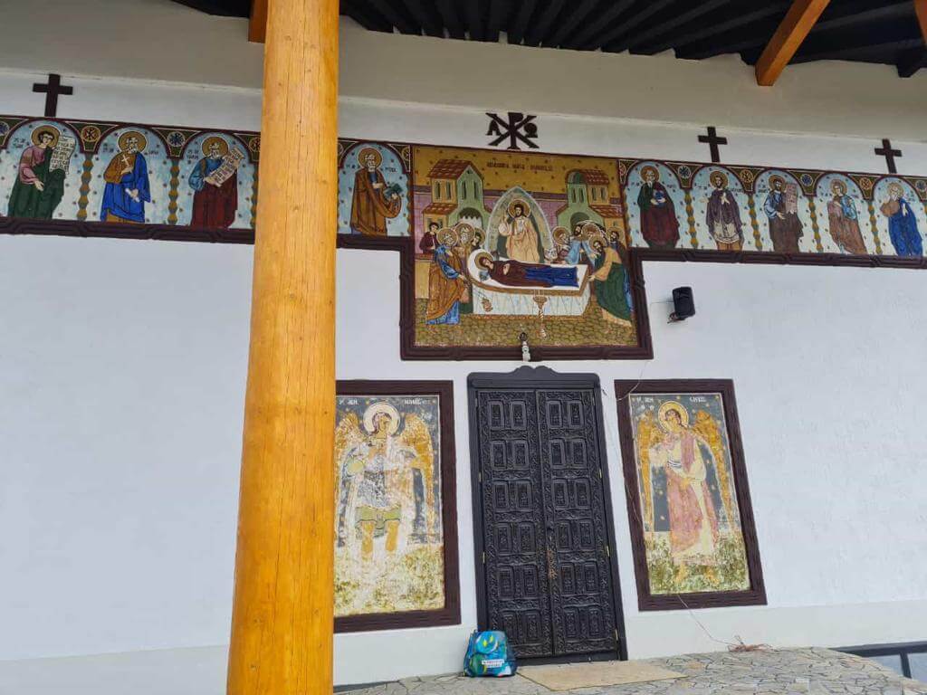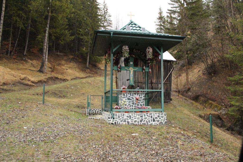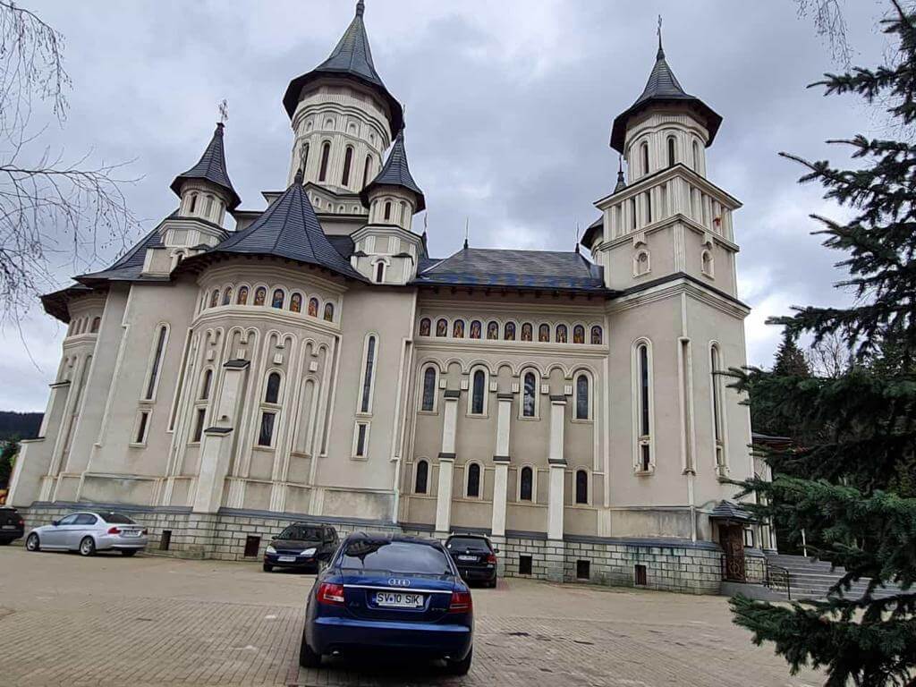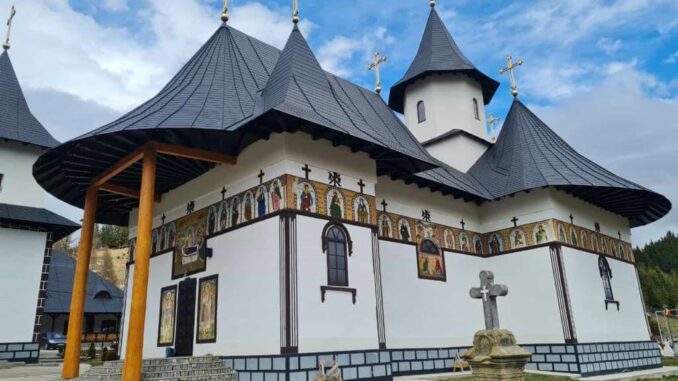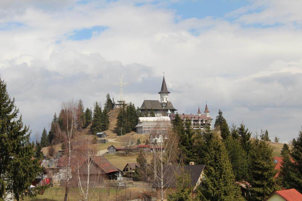 Von hier aus blicken wir auf das Nonnenkloster Piatra Fantanele, welches genau an dem Ort erbaut wurde, wo einst die älteste orthodoxe Kirche im Nordwesten Siebenbürgens stand. Von weitem sieht man schon das im Jahr 2010 errichtete und nachts beleuchtete 31 m hohe Metallkreuz.