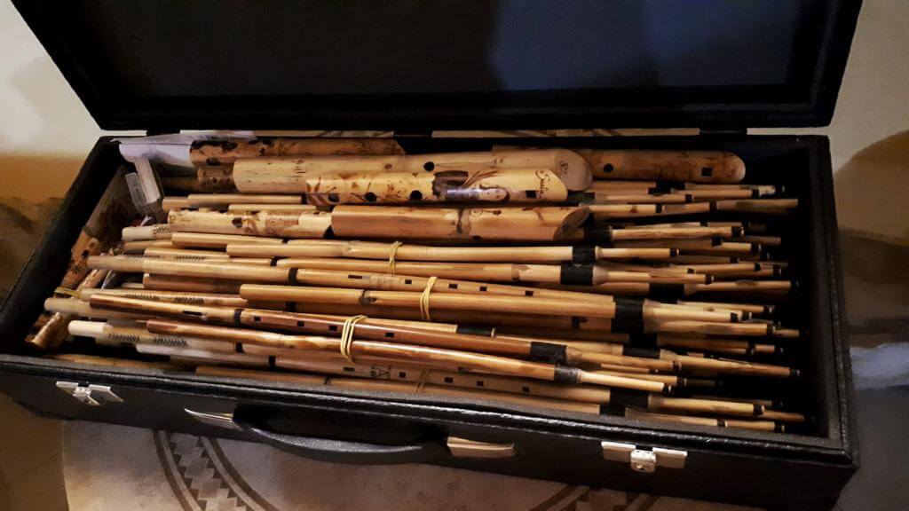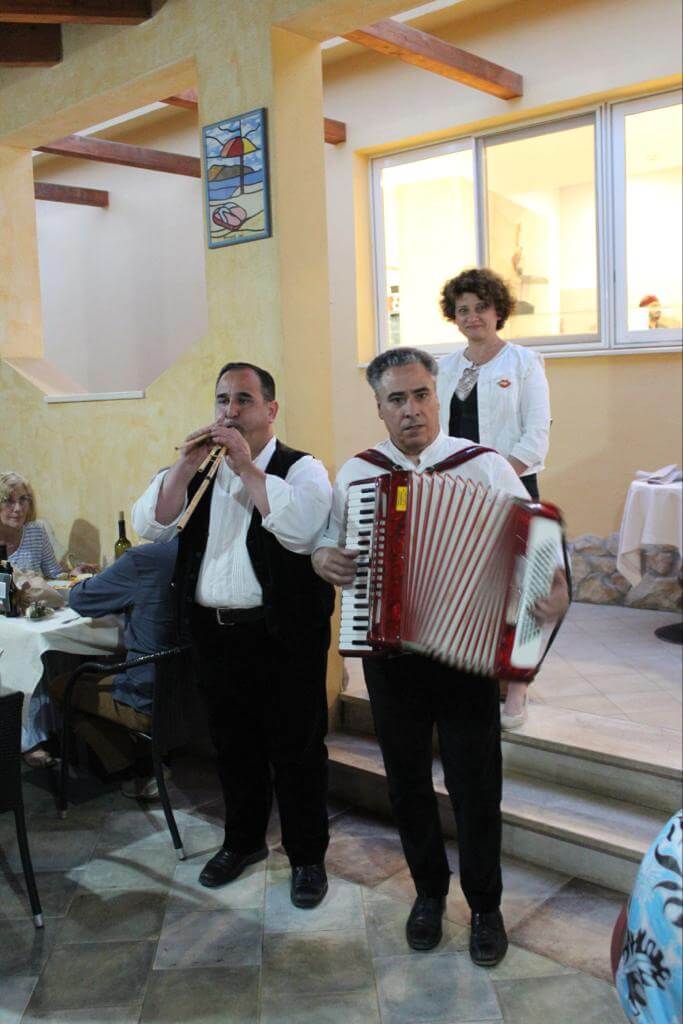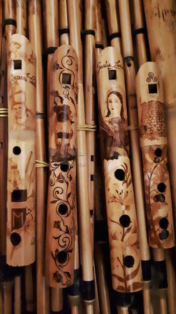 Dazu spielen Musiker auf Akkordeon und Launeddas, ein typisch sardisches Blasinstrument, sardische Lieder.