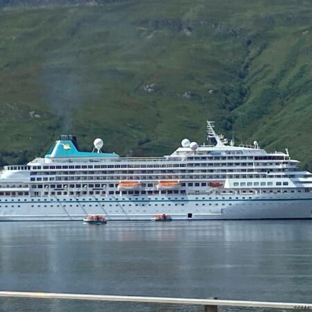 Wir erreichen Fort William und decken uns nochmals mit Lebensmitteln ein. Es muss viel Fisch für morgen eingekauft werden. Außerdem liegt hier im Fjord ein Kreuzfahrtschiff, aus dem gerade die Passagiere ausgebootet werden.