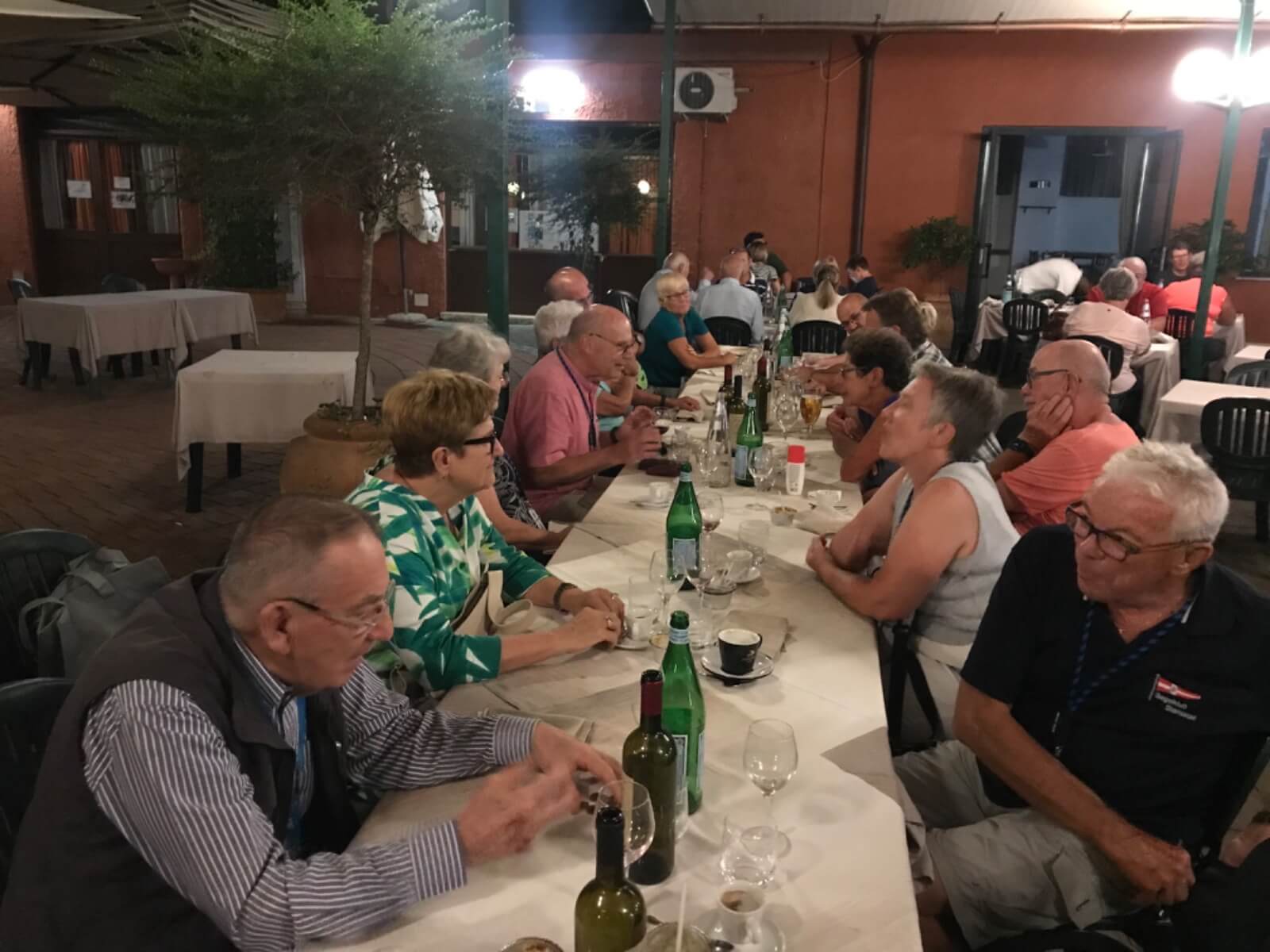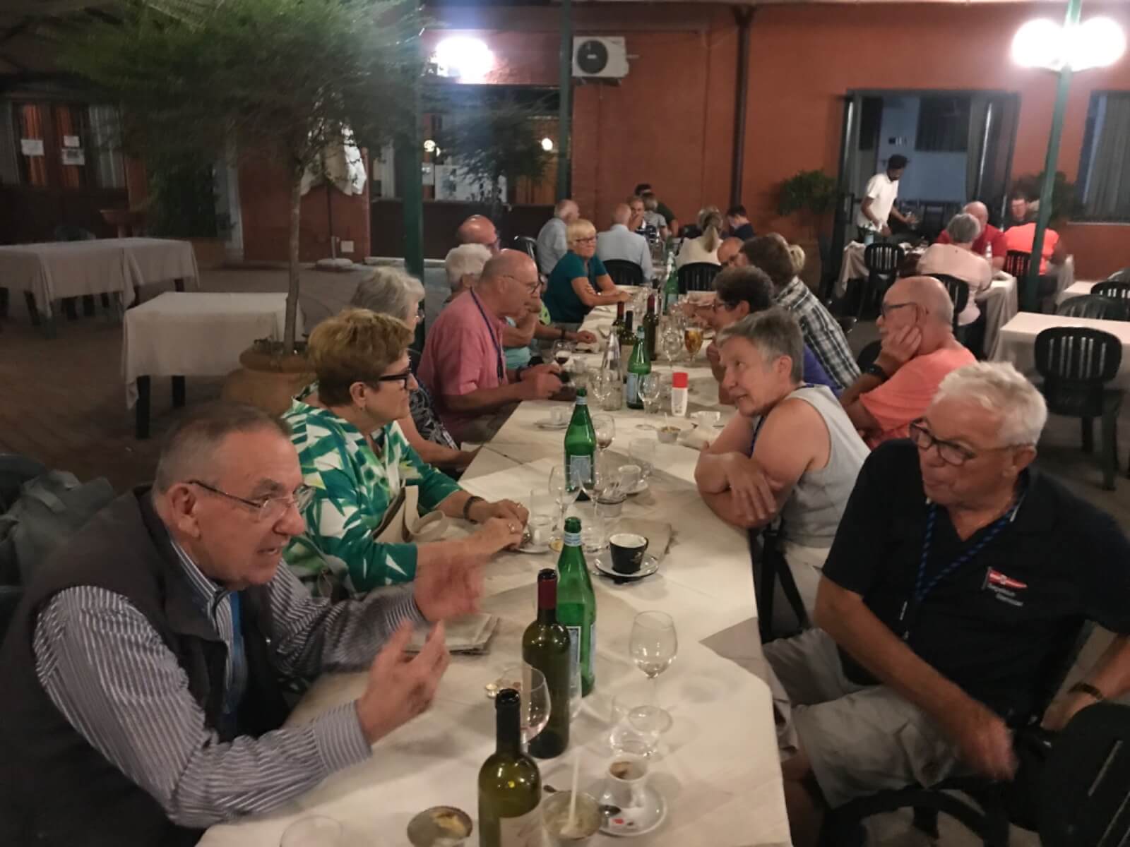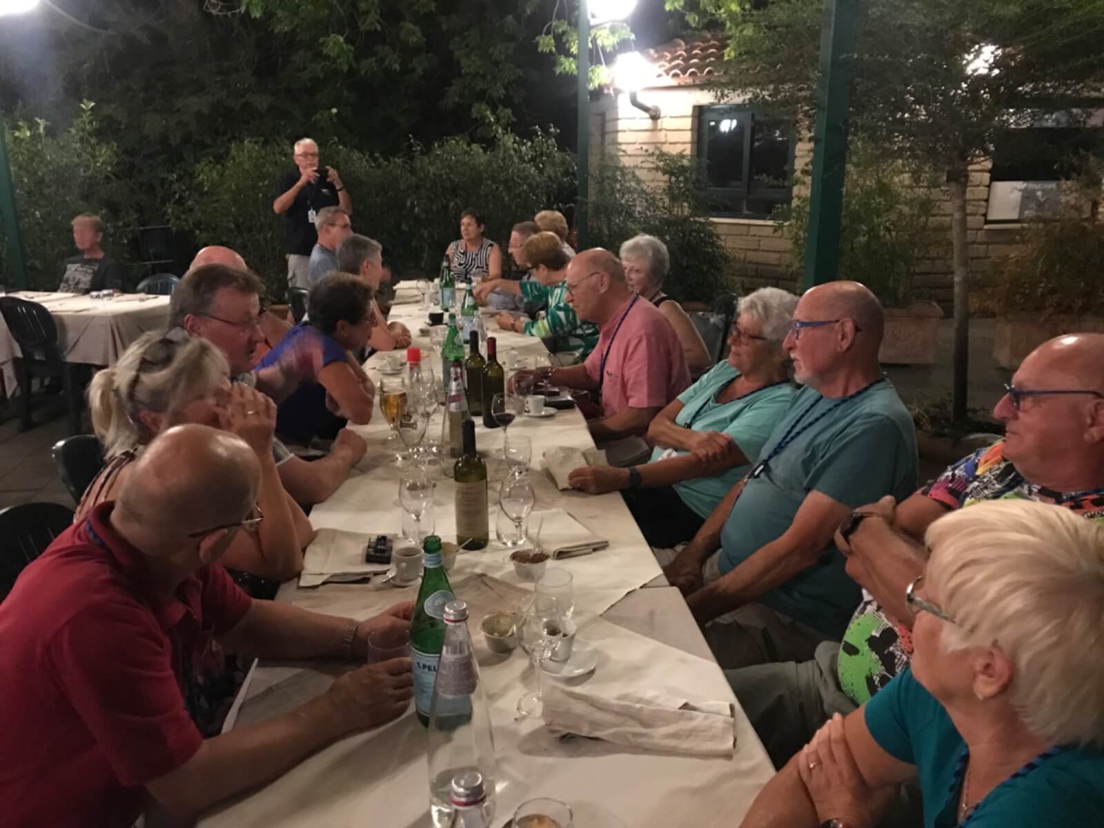 Heute sind die letzten 8 Teilnehmer unserer Gruppe in Rom eingetroffen. Nachmittags kam zum Glück etwas Wind auf und die 30 Grad im Schatten waren hier in Rom besser zu ertragen. Zur Begrüßung gab es einen Schluck Wein, Navis und Geräte für die Führungen wurden verteilt und alles für die Tour Wichtige erklärt. Wir alle 20 (Teilnehmer) sind gut drauf und freuen uns auf die schöne Tour und die vielen Eindrücke. Das folgende Begrüßungsessen war vom Feinsten: zweierlei Vorspeisen, Pasta und dann als Hauptgericht auf offenem Holzfeuer gegrilltes Fleisch mit köstlichen Pommes, zum Abschluss Tiramisu, was will man mehr. Dazu gute Weiß- und Rotweine, Wasser und Espresso. Ein typisch italienisches Abendessen, nachdem wir selig ins Bett gehen konnten. Der Kennenlernabend war ein voller Erfolg!