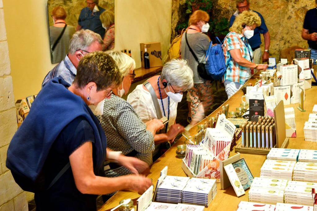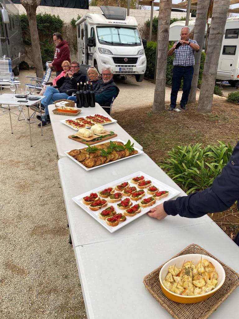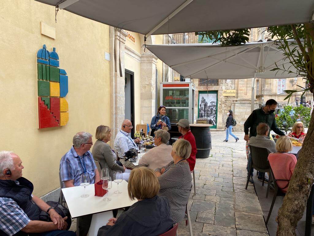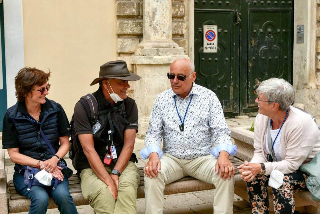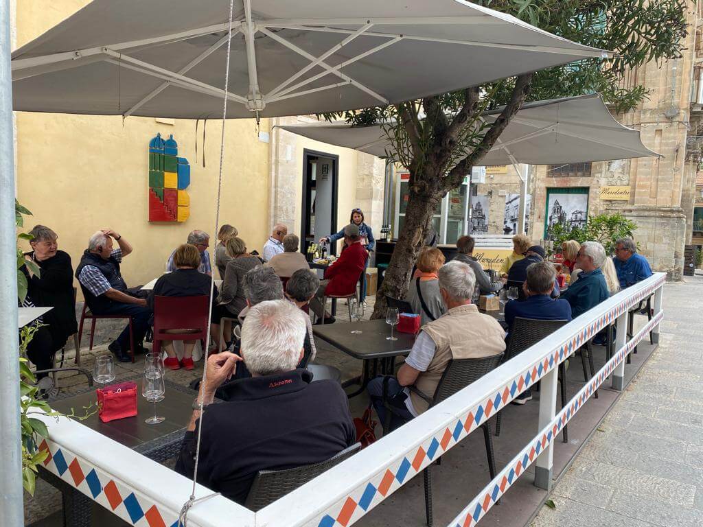 Leider zum letzten Mal holte uns unsere schon vertraute Stadtführerin Maria Lina um 9:00 Uhr ab und wir fuhren zunächst nach Ragusa, der Hauptstadt der gleichnamigen Provinz. Nach einem Spaziergang durch die hügelige Stadt war das erste Highlight eine Wein-, Wurst- und Käseverköstigung in einer Bar inmitten der Altstadt. Im Anschluss an die Fahrt zur Nachbarstadt Modica und der Mittagspause gab es eine zweite Verköstigung und zwar die von hier stammende berühmte Schokolade, die aber nicht unter Verwendung von Milch hergestellt wird. Der absolute Höhepunkt des Tages war aber die Einladung der Campingplatzverwaltung am Abend zu einem angeblichen Welcome Drink, der sich aber erfreulicherweise als komplettes Menü herausstellte mit typisch italienischen Vorspeisen, Pasta zum Hauptgericht, Dessert sowie Weiß- und Rotwein. Alles aus heimischer Herstellung, so dass viele auch die Möglichkeit zum Kauf nutzten.