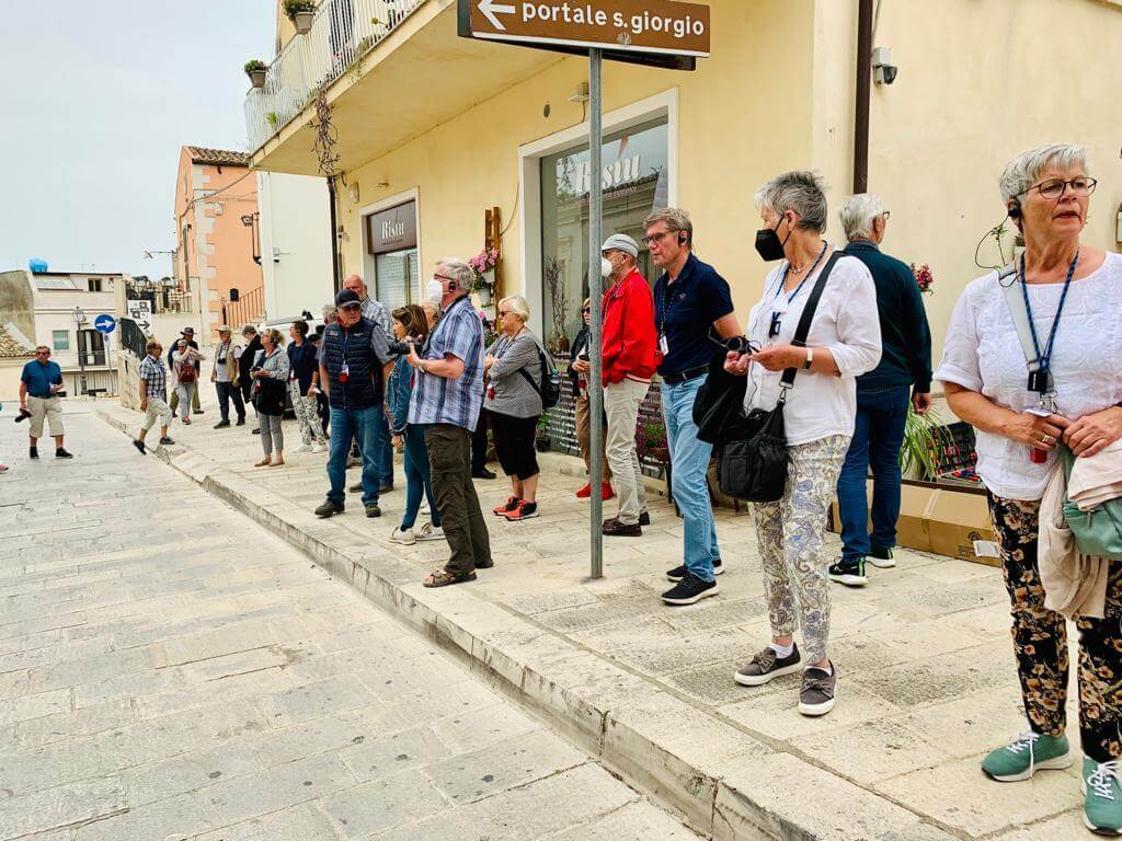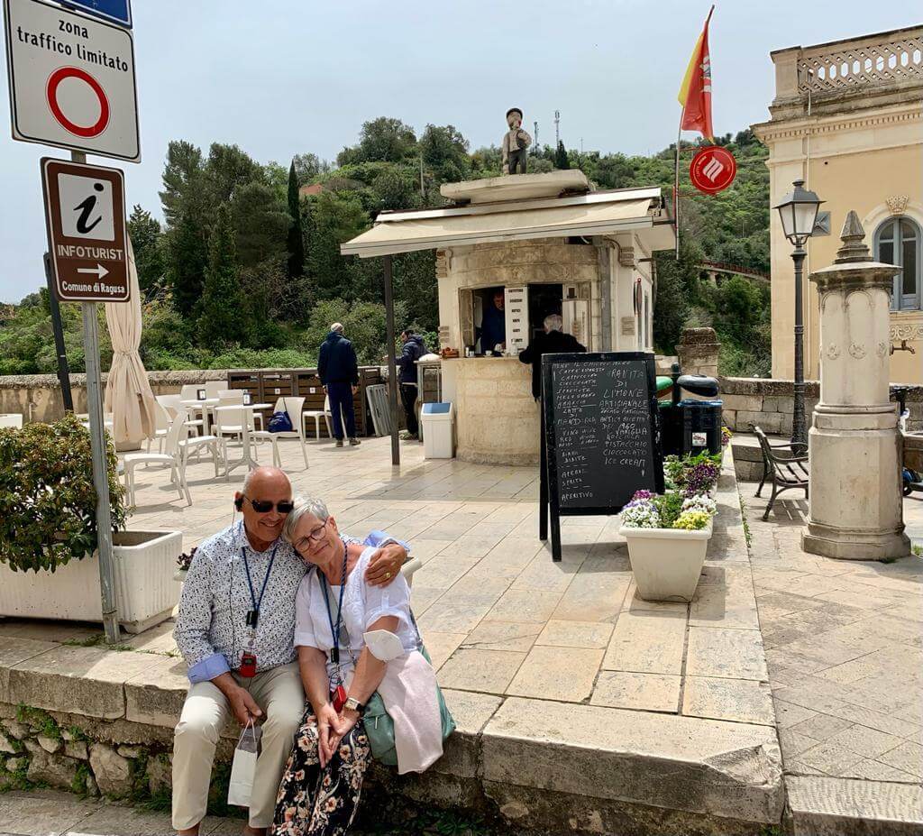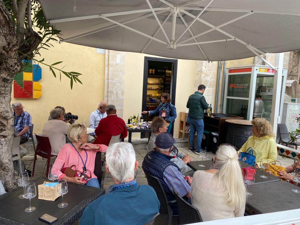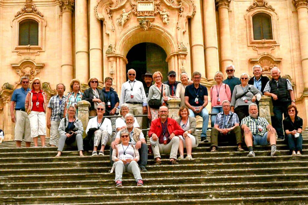 Leider zum letzten Mal holte uns unsere schon vertraute Stadtführerin Maria Lina um 9:00 Uhr ab und wir fuhren zunächst nach Ragusa, der Hauptstadt der gleichnamigen Provinz. Nach einem Spaziergang durch die hügelige Stadt war das erste Highlight eine Wein-, Wurst- und Käseverköstigung in einer Bar inmitten der Altstadt. Im Anschluss an die Fahrt zur Nachbarstadt Modica und der Mittagspause gab es eine zweite Verköstigung und zwar die von hier stammende berühmte Schokolade, die aber nicht unter Verwendung von Milch hergestellt wird. Der absolute Höhepunkt des Tages war aber die Einladung der Campingplatzverwaltung am Abend zu einem angeblichen Welcome Drink, der sich aber erfreulicherweise als komplettes Menü herausstellte mit typisch italienischen Vorspeisen, Pasta zum Hauptgericht, Dessert sowie Weiß- und Rotwein. Alles aus heimischer Herstellung, so dass viele auch die Möglichkeit zum Kauf nutzten.