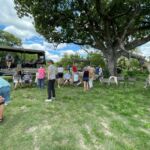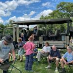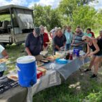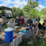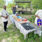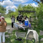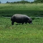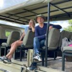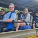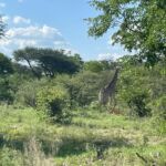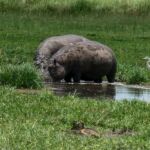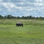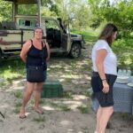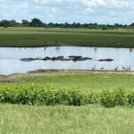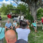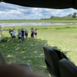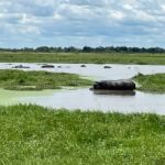 Zur Mittagspause parken die Safari Trucks unter schönen alten Bäumen und ziemlich nah an einem Wasserloch, in dem sich ziemlich viele Flusspferde tummeln. Wir hoffen, dass sie bleiben, wo sie sind. Wieder zaubern fleißige Hände ein Lunchbuffet hervor und wir genießen die Pause im Schatten der großen alten Bäume und haben immer ein Auge auf die Hippos.
