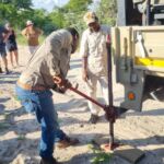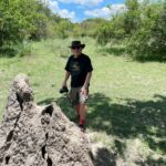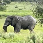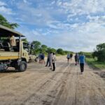 Auf dem Heimweg sehen wir unzählige Geier kreisen und fahren abseits des Fahrweges und finden einen toten Elefanten, der offenbar schon einige Tage dort liegt. Es riecht stark nach Verwesung. Bei der Fahrt mitten durch den Busch platzt plötzlich einer der Reifen. Wir fahren zurück auf den Fahrweg und der Reifen wird gewechselt.