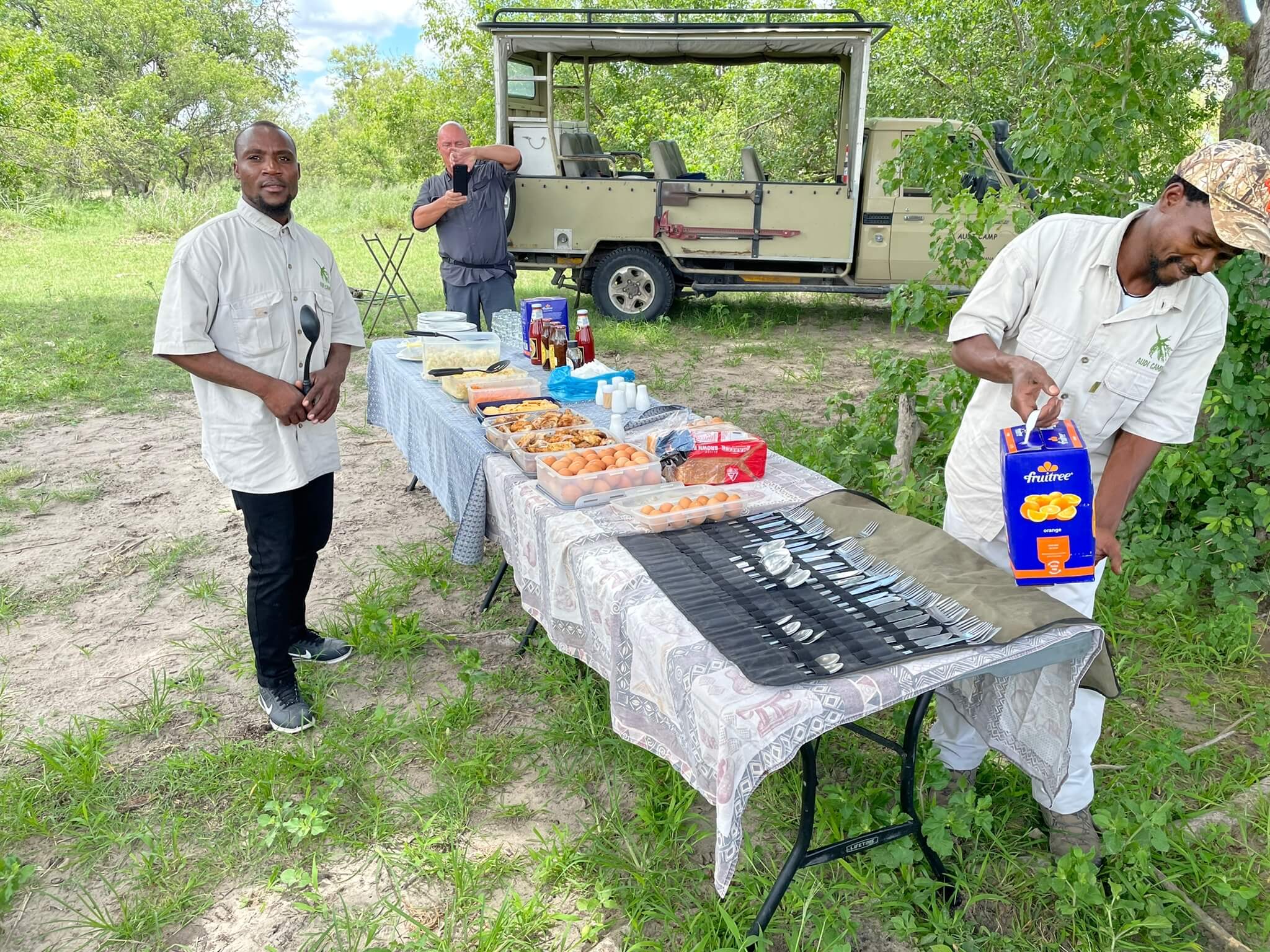 Bald sehen wir die ersten Tiere. Am Tor zum Park, es ist schon fast 10.00 Uhr, ist Frühstückspause. In Windeseile packen die Ranger ein Frühstückspicknick aus, welches sich sehen lassen kann. Kaffee, Tee, Müsli, alles da. Dann schaukeln wir weiter über die kleinen Pfade durch den Park.