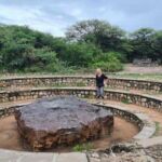 Eine lange Strecke liegt vor uns – 490km. Mittlerweile hat sich bei jedem die eigene Abfahrtszeit eingependelt. Es sind immer die gleichen, die früh unterwegs sind und es sind immer die gleichen, die als letzte den Platz verlassen. Heute treffen wir viele der Gruppe in Rundu wieder. Rundu ist eine mittelgroße Stadt, die wir nach knapp 200 km erreichen. Alle, die noch Probleme mit dem Handy Datenvolumen haben, versammeln sich hier, um das Problem bei MTC zu lösen. Zu unserer „Freude“ warten bereits etwa 100 Menschen in einer langen Schlange vor dem Geschäft. Wieder einmal ist Ausdauer und Ideenreichtum gefragt. Nach einigen Diskussionen entdecken wir einen ganz kleinen MTC Laden auf der anderen Straßenseite – eher eine Bude. Und -siehe da, uns kann geholfen werden. Außer uns ist keiner da. Die nette Dame lädt uns die Handys direkt auf – fertig! Der nächste Treffpunkt ist bei Roy‘s Rest Camp. Hier finden wir eine Sammlung alter, schöner Dinge, die sich in und um die Lodge herum befinden. Ein Kaffee, eine Kleinigkeit zu essen und wir setzen unsere Fahrt fort. Nun ist’s nicht mehr weit bis Grootfontein. Hier kann man einkaufen, tanken und bevor wir zur Lodge fahren, auch noch den riesigen Meteoriten sehen, der hier auf die Erde gekracht ist.