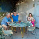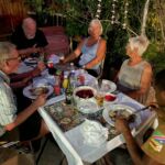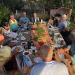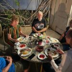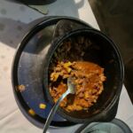 Henriette, die Wirtin von der Maltahöhe, hat zum Abend für die ganze Gruppe lecker gekocht. Es gibt verschiedene Eintöpfe, alle mit Kudu, verschiedene Beilagen und Dessert.