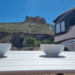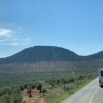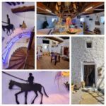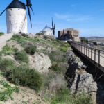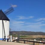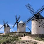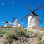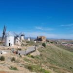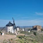 Heute kommen wir in die Region La Mancha von Kastillien La Mancha. Hier ließ der bekannte spanische Schriftsteller Miguel Cervantes seine berühmte Romanfigur Don Quijote entstehen. Mutig und liebestrunken nach seiner Dulcinea trat der edle Ritter von der traurigen Gestalt mit seinem Weggefahren Sancho Panza gegen Windmühlenflügeln an. Er glaubte, Dämonen bekämpfen zu müssen. Der skurrile Ritter glaubte feindliche Riesen vor sich zu haben. „Der Kampf gegen Windmühlenflügel“ wurde zum geflügelten Wort für Dinge oder Situationen, deren Lösung von vorneherein aussichtslos sind. Rechts und links der Straßen säumen Olivenhaine und Weinstöcke den Weg. Unsere Strecke heute bietet uns die Ansicht vieler Windmühlen. Keine ist mehr betriebsfähig, bis auf eine, die gerade restauriert wird. Es sind also Museumsstücke, aber sehr hübsch anzusehen, auch durch ihre Lage in der Landschaft. Das war das erste Ensemble, die Windmühlen von Campo de Criptana. Jetzt kommen die Mühlen von Consuegra. Vom Parkplatz muss man ein gutes Stück den Hügel hinauf marschieren, denn oben thront eine schöne Burg, attraktiv umgeben von den Mühlen. Und diese Mühle wird restauriert, damit sie wieder funktioniert!