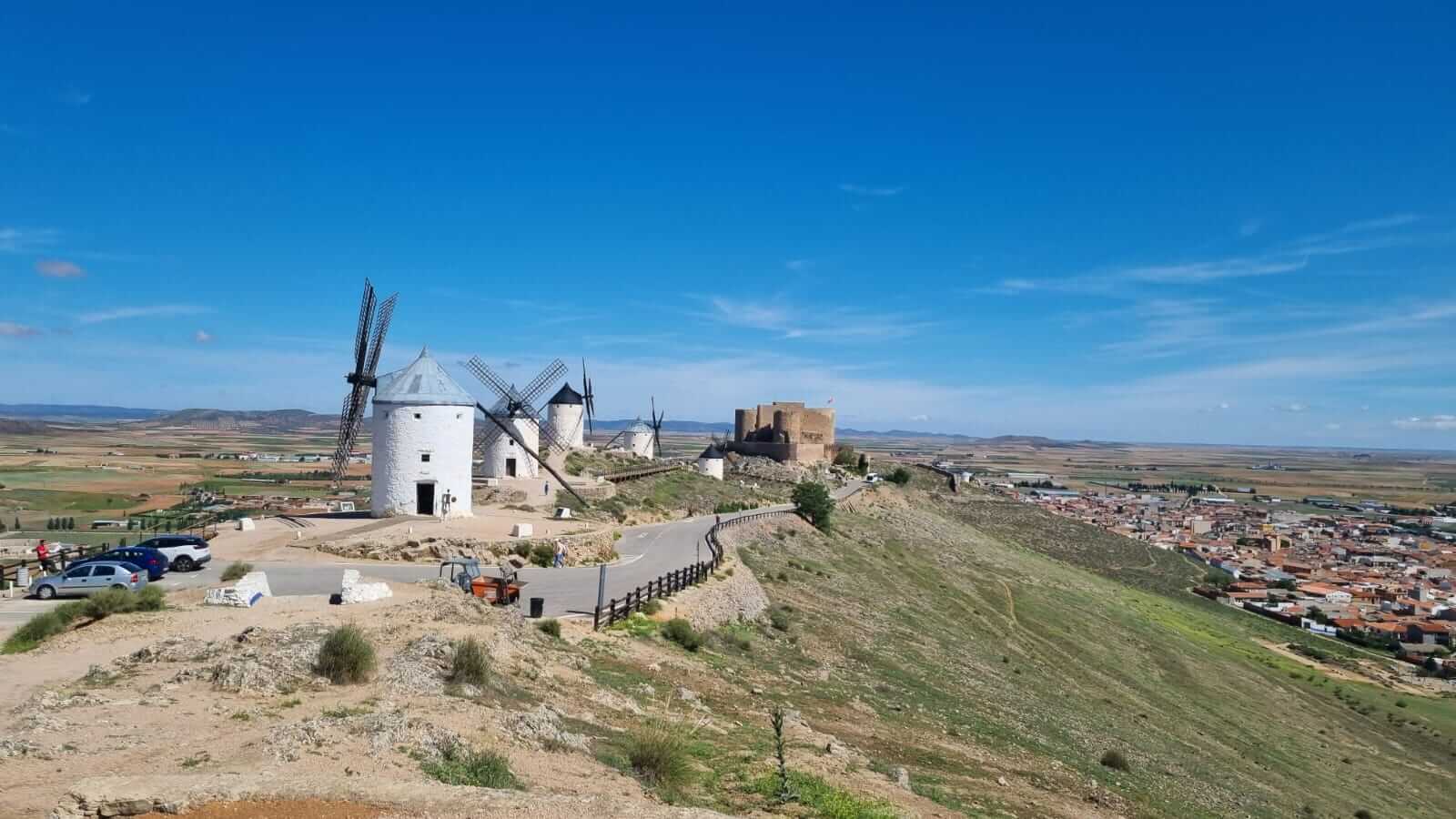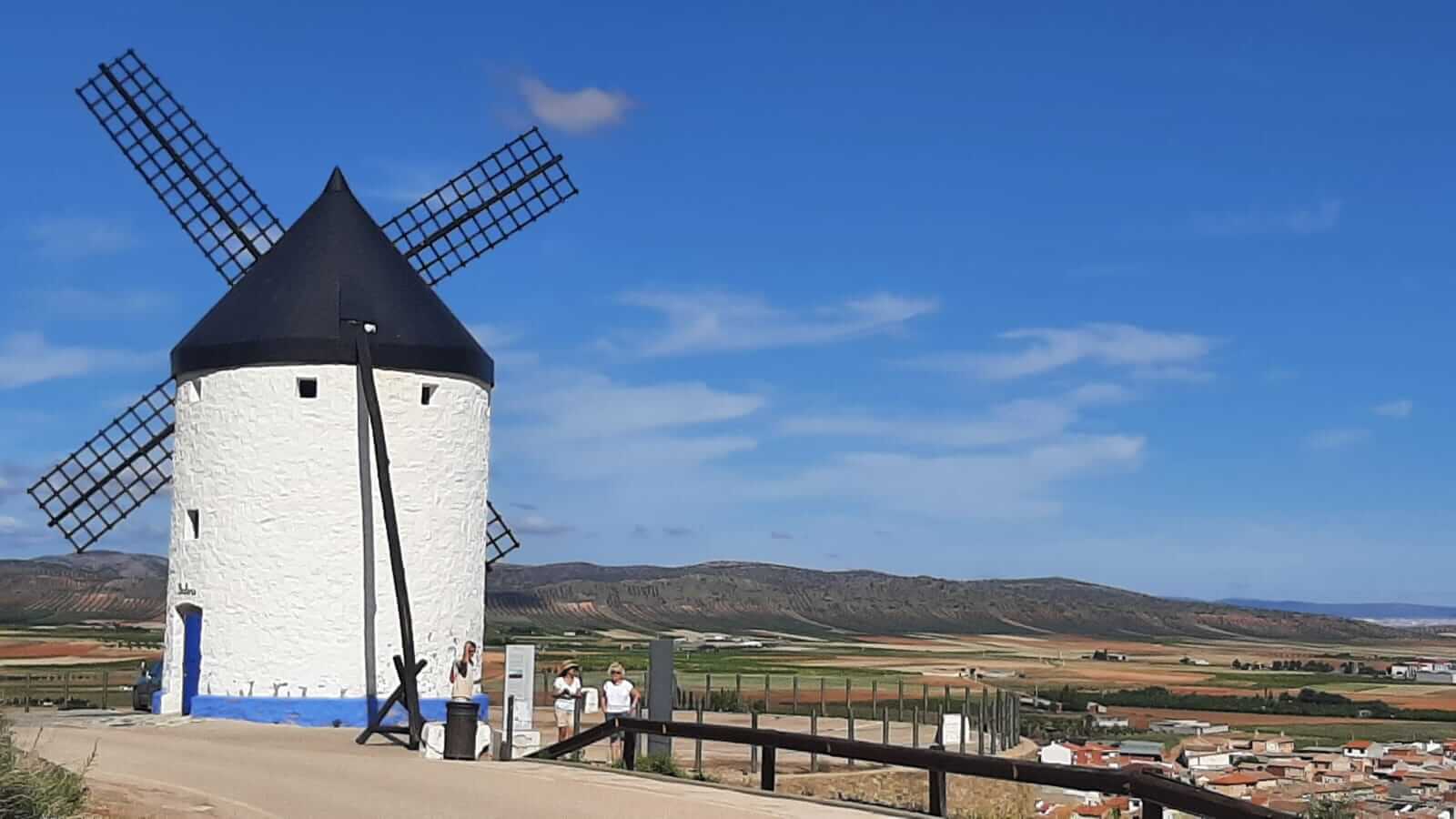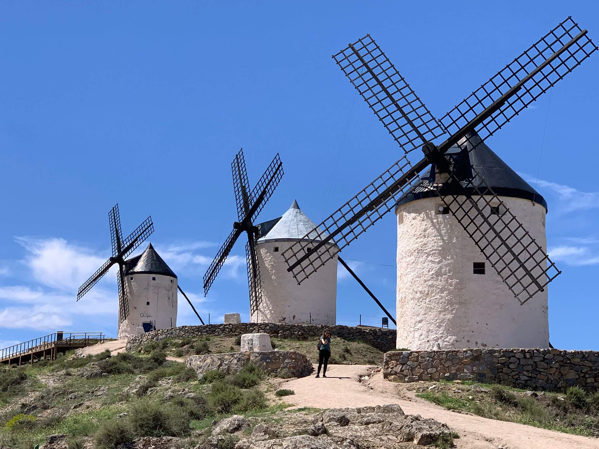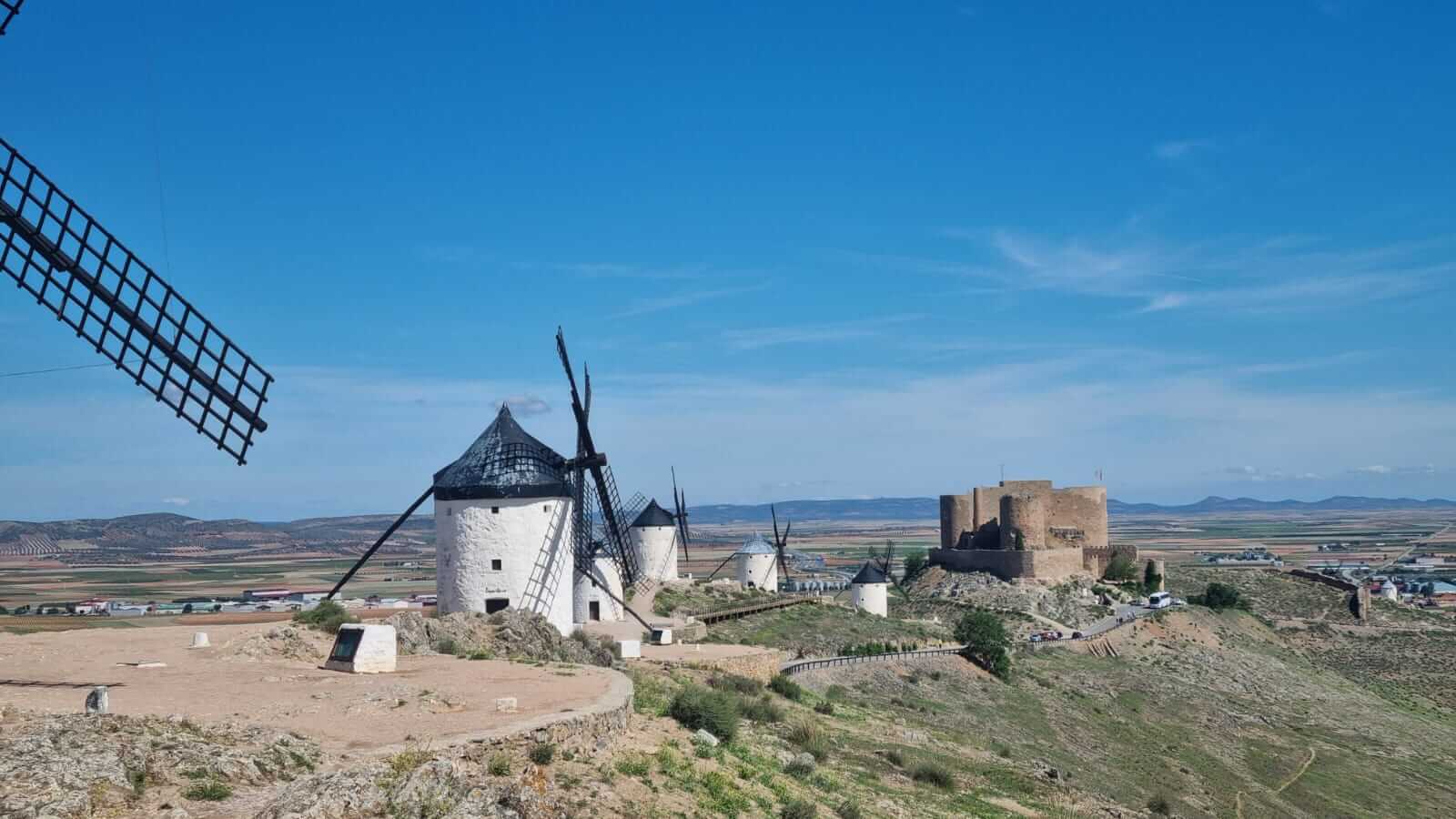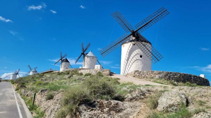 Heute kommen wir in die Region La Mancha von Kastillien La Mancha. Hier ließ der bekannte spanische Schriftsteller Miguel Cervantes seine berühmte Romanfigur Don Quijote entstehen. Mutig und liebestrunken nach seiner Dulcinea trat der edle Ritter von der traurigen Gestalt mit seinem Weggefahren Sancho Panza gegen Windmühlenflügeln an. Er glaubte, Dämonen bekämpfen zu müssen. Der skurrile Ritter glaubte feindliche Riesen vor sich zu haben. „Der Kampf gegen Windmühlenflügel“ wurde zum geflügelten Wort für Dinge oder Situationen, deren Lösung von vorneherein aussichtslos sind. Rechts und links der Straßen säumen Olivenhaine und Weinstöcke den Weg. Unsere Strecke heute bietet uns die Ansicht vieler Windmühlen. Keine ist mehr betriebsfähig, bis auf eine, die gerade restauriert wird. Es sind also Museumsstücke, aber sehr hübsch anzusehen, auch durch ihre Lage in der Landschaft. Das war das erste Ensemble, die Windmühlen von Campo de Criptana. Jetzt kommen die Mühlen von Consuegra. Vom Parkplatz muss man ein gutes Stück den Hügel hinauf marschieren, denn oben thront eine schöne Burg, attraktiv umgeben von den Mühlen. Und diese Mühle wird restauriert, damit sie wieder funktioniert!