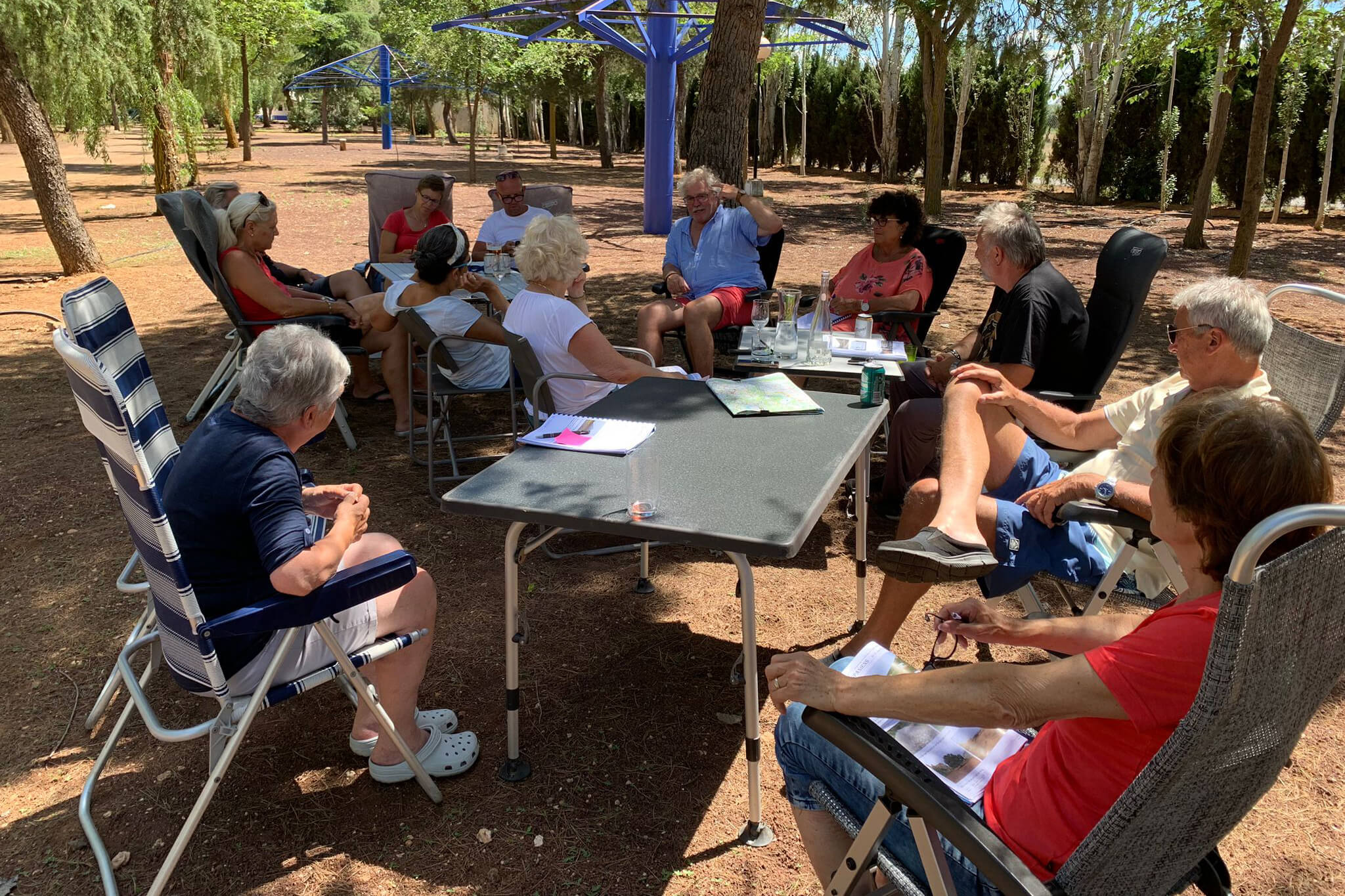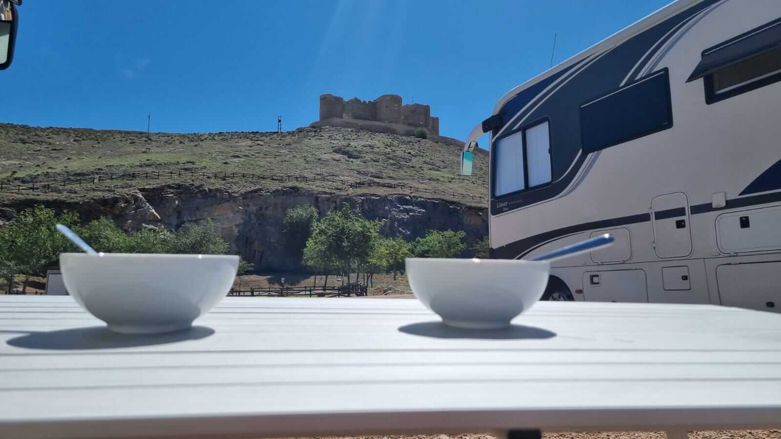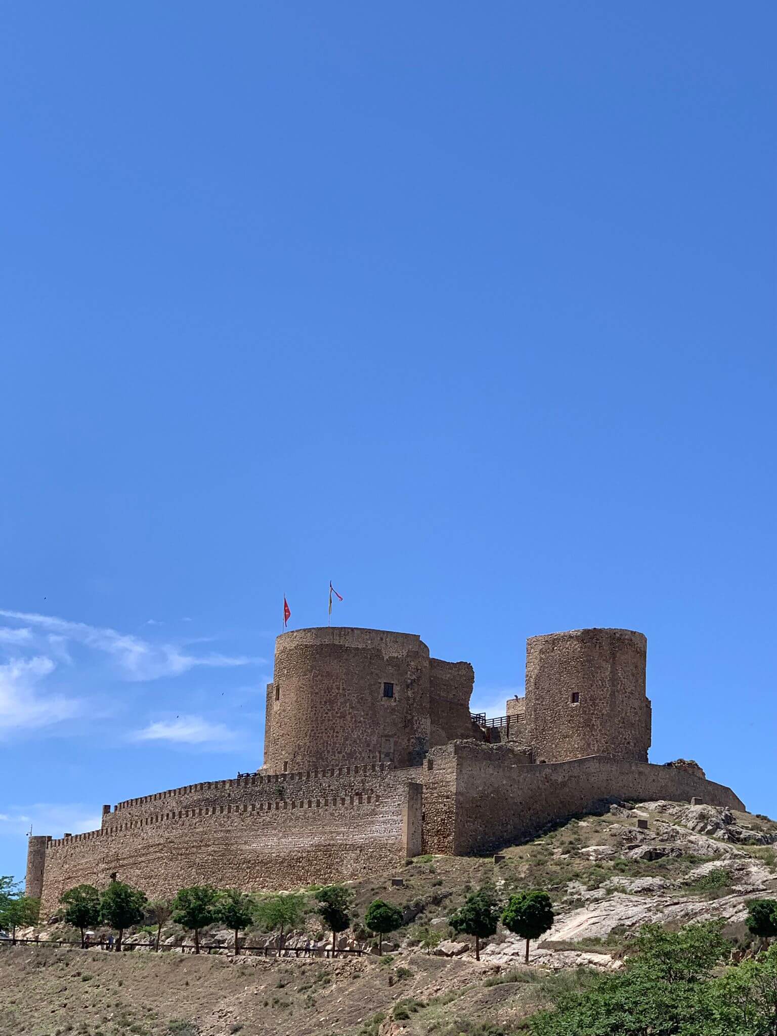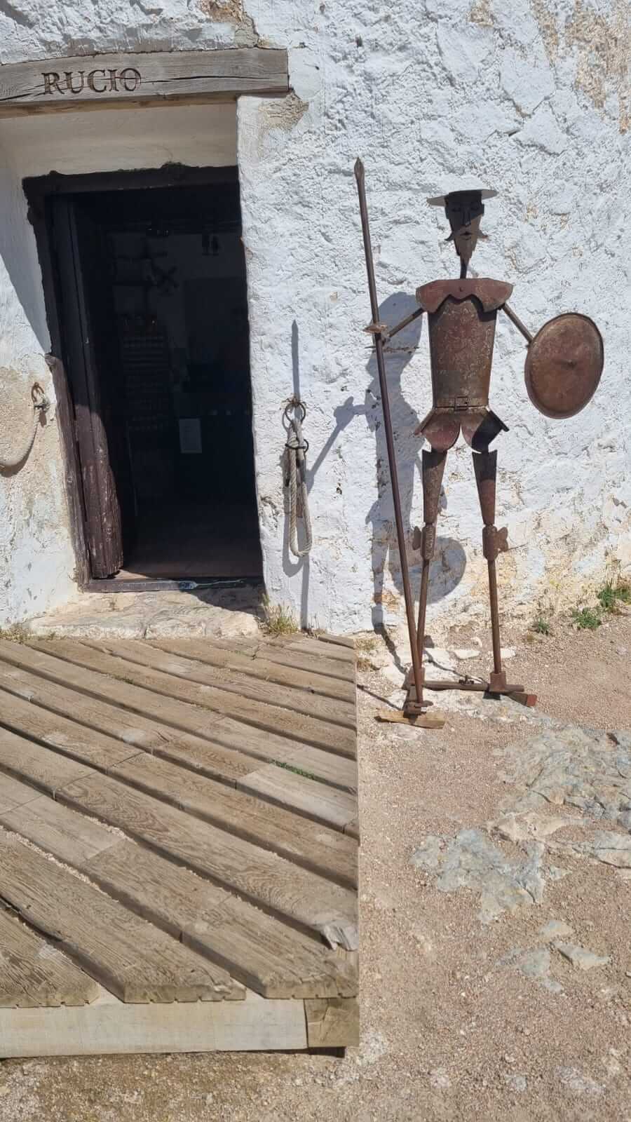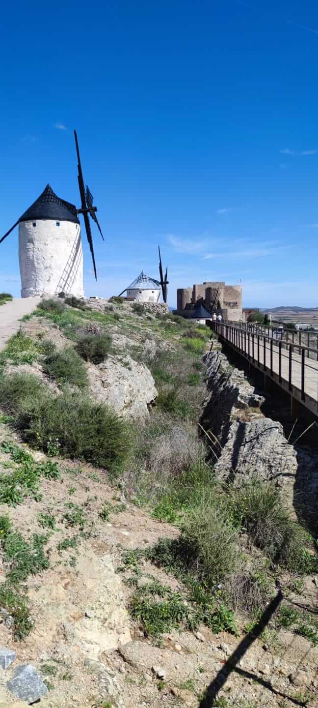 Heute kommen wir in die Region La Mancha von Kastillien La Mancha. Hier ließ der bekannte spanische Schriftsteller Miguel Cervantes seine berühmte Romanfigur Don Quijote entstehen. Mutig und liebestrunken nach seiner Dulcinea trat der edle Ritter von der traurigen Gestalt mit seinem Weggefahren Sancho Panza gegen Windmühlenflügeln an. Er glaubte, Dämonen bekämpfen zu müssen. Der skurrile Ritter glaubte feindliche Riesen vor sich zu haben. „Der Kampf gegen Windmühlenflügel“ wurde zum geflügelten Wort für Dinge oder Situationen, deren Lösung von vorneherein aussichtslos sind. Rechts und links der Straßen säumen Olivenhaine und Weinstöcke den Weg. Unsere Strecke heute bietet uns die Ansicht vieler Windmühlen. Keine ist mehr betriebsfähig, bis auf eine, die gerade restauriert wird. Es sind also Museumsstücke, aber sehr hübsch anzusehen, auch durch ihre Lage in der Landschaft. Das war das erste Ensemble, die Windmühlen von Campo de Criptana. Jetzt kommen die Mühlen von Consuegra. Vom Parkplatz muss man ein gutes Stück den Hügel hinauf marschieren, denn oben thront eine schöne Burg, attraktiv umgeben von den Mühlen. Und diese Mühle wird restauriert, damit sie wieder funktioniert!