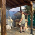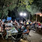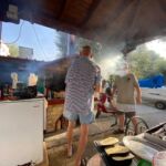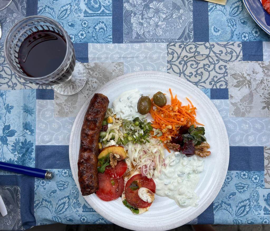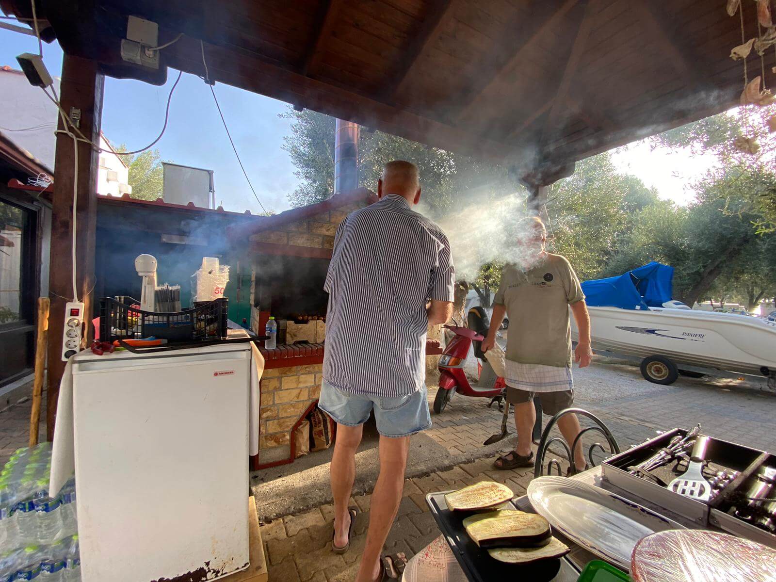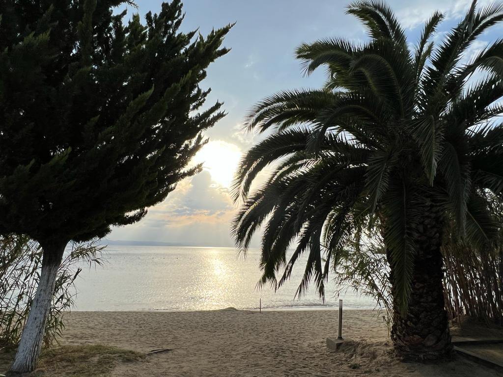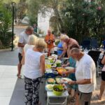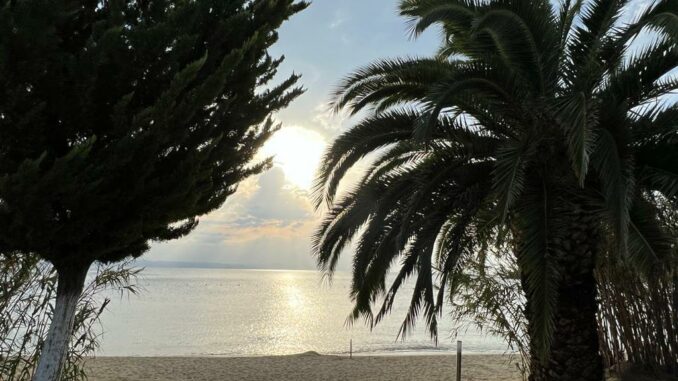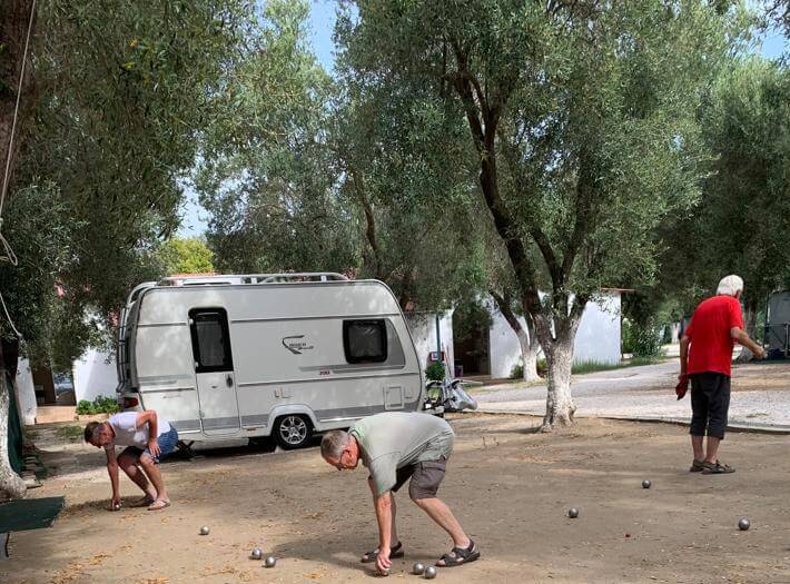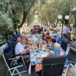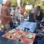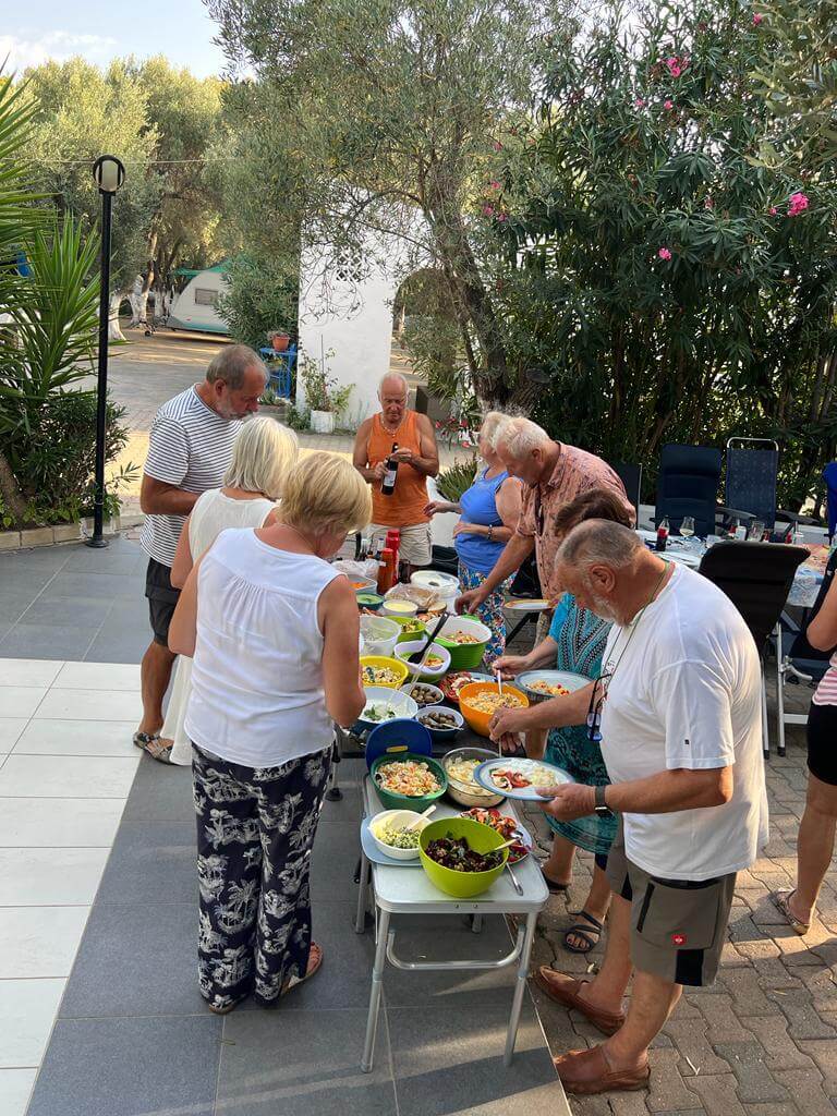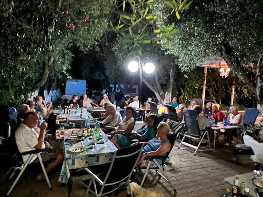 Der heutige Tag konnte persönlich gestaltet und verbracht werden – also ein Ruhetag. Mal ausschlafen, Wandern, Baden, Radfahren, Womo reinigen und und und – so gesehen war die Ruhe auch nicht unbedingt anwesend. Einige nutzten den Tag auch, um die Halbinsel zu erkunden. Der CP mit seinem Sandstrand verlockte mit der strahlenden Sonne zum Relaxen und viele zum Kurzbad. Auf dem Tagesprogramm stand jedoch auch die Vorbereitung unserer ersten Campertafel. Am späten Nachmittag begannen einige schon unseren Treffpunkt vorzubereiten. Die CP-Betreiber haben uns freundlicherweise die Außenterrasse ihres Restaurants mit der grandiosen Aussicht auf das Ägäische Meer und Kassandra zur Verfügung gestellt. Am frühen Abend versammelten sich alle zur Campertafel. Die griechischen Bauernbratwürste, die Lamm- und die Schweinesteaks fanden reißend Absatz und wurden als Alternative zur heimischen Bratwurst von allen gelobt. Die Campertafel bog sich von den vielen Speisen, die von allen beigesteuert wurden. Gemüsesalate, Obst, Brot, Kartoffelsalat, Tzatziki und vieles mehr, begleitet von interessanten Gesprächen und einigen Vorträgen und vor allem von Mundharmonikabeiträgen, die Eberhard wunderbar aus seinem Musikinstrument zauberte, führten dazu, dass alle den angenehmen Abend lobten. Mit den Hits aus den 70 und 80ern wurde die Party dann noch zum Tanzevent. Die wiederum tollen Abendtemperaturen sorgen für eine ausgelassene Stimmung bis in die Nacht. Leider geht es morgen schon weiter. Hier hätten wir es noch einige Tage ausgehalten.