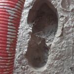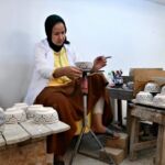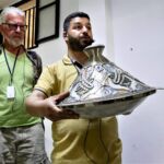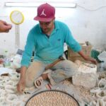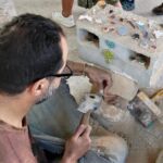 Im Töpferviertel testet eine Teilnehmerin mit ihrem Fußabdruck die Konsistenz des grauen Tons, der dort für viele Kunstwerke verwendet wird.
