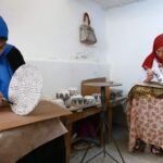 In einer Weberei sehen wir Maschinen, die mit Hand- und Fußarbeit betrieben werden und wunderschöne Stoffe aus Agaven-Seide als Ergebnis liefern.