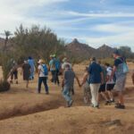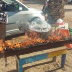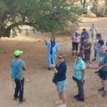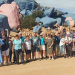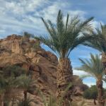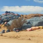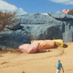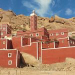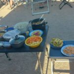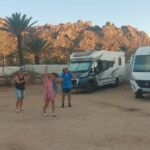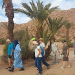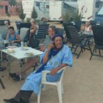 Der Tag beginnt und die Sonne lässt die roten Felsen um uns herum in den tollsten Farben erstrahlen. Fast alle wollen heute einen Ausflug in die Gegend um Tafraoute machen. Zaid begleitet die Gruppe und dann geht’s los. Auf dem Programm steht das Haus des Landwirtschaftsministers, die „blauen Steine“, und eine Oase. Zunächst besuchen wir einen kleinen Ort, dessen Lehmhäuser durch Unwetter unbewohnbar wurden. Die Bewohner fangen nun langsam an neue Häuser in Stein, mit Zement zu bauen, ein sehr interessanter Ausflug, der uns das besondere Land auf eine andere Art näher bringt. Ein belgischer Künstler hatte die Idee, Felsen im steinigen Gebirge mit blauer Farbe zu bemalen. Dazu schleppte er 20.000 Kilogramm blauer Farbe in die Steinwüste. Mitten in der Steinwüste finden wir das malerische Dorf Omesnat. Hier wohnt der marokkanische Finanzminister, der offensichtliche finanzielle Einfluss ist deutlich zu erkennen. Gegen Mittag sind alle wieder am Campingplatz hier mitten in der Steinwüste und genießen eine Mittagspause, bevor wir gegen 16.00 Uhr mit unserer Campertafel beginnen. Wir grillen Kefta und Hühnchen, und dazu selbst gemachte Salate und Leckereien, was eine schöne Abwechslung zum guten Essen hierzulande ist. Wir haben einen schönen gemeinsamen Abend. Nachdem die Sonne untergegangen ist, wird es schnell kühl und wir merken, dass wir in der Wüste sind.