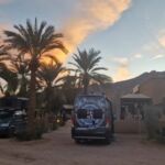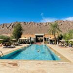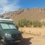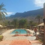 Heute ist ein reiner Fahrtag, aber auch der lässt sich hier in Marokko wunderbar genießen. Die Landschaft wird immer karger. Trotz des lebensfeindlichen Umfelds treffen wir immer wieder nicht nur auf Pflanzen und Tiere, sondern auch auf Menschen, die in dieser Region leben. Man fährt durch eine Mondlandschaft und plötzlich, hinter einer Kurve liegt ein sattgrüner Palmengarten vor uns. Sehr schön. Wir machen einen kleinen Abstecher mitten hinein in die Oase, überqueren einen kleinen Fluss und fahren auf der anderen Flussseite wieder hinauf. Wenig später entdecken wir weiter flussabwärts einen schönen Wasserfall. Gleich daneben ein kleines Hotel mit einem schön angelegten Garten. Hier gönnen wir uns einen Café, gegen Mittag bezieht die gesamte Gruppe das Camp unter Palmen. Ein wunderschöner Swimmingpool lädt hier dann auch zum „chillen“ ein.