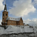 Nachdem wir den verschneiten Pass überquert haben, fahren wir entlang den Fjorden des Europäischen Eismeers und machen einen kurzen Stopp an der Lofoten-Kathedrale.