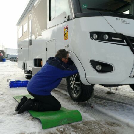 Wir kommen zu unserem Camp in Moskenes, es gibt einen Anstieg zu bewältigen und das geht heute nur mit Ketten.