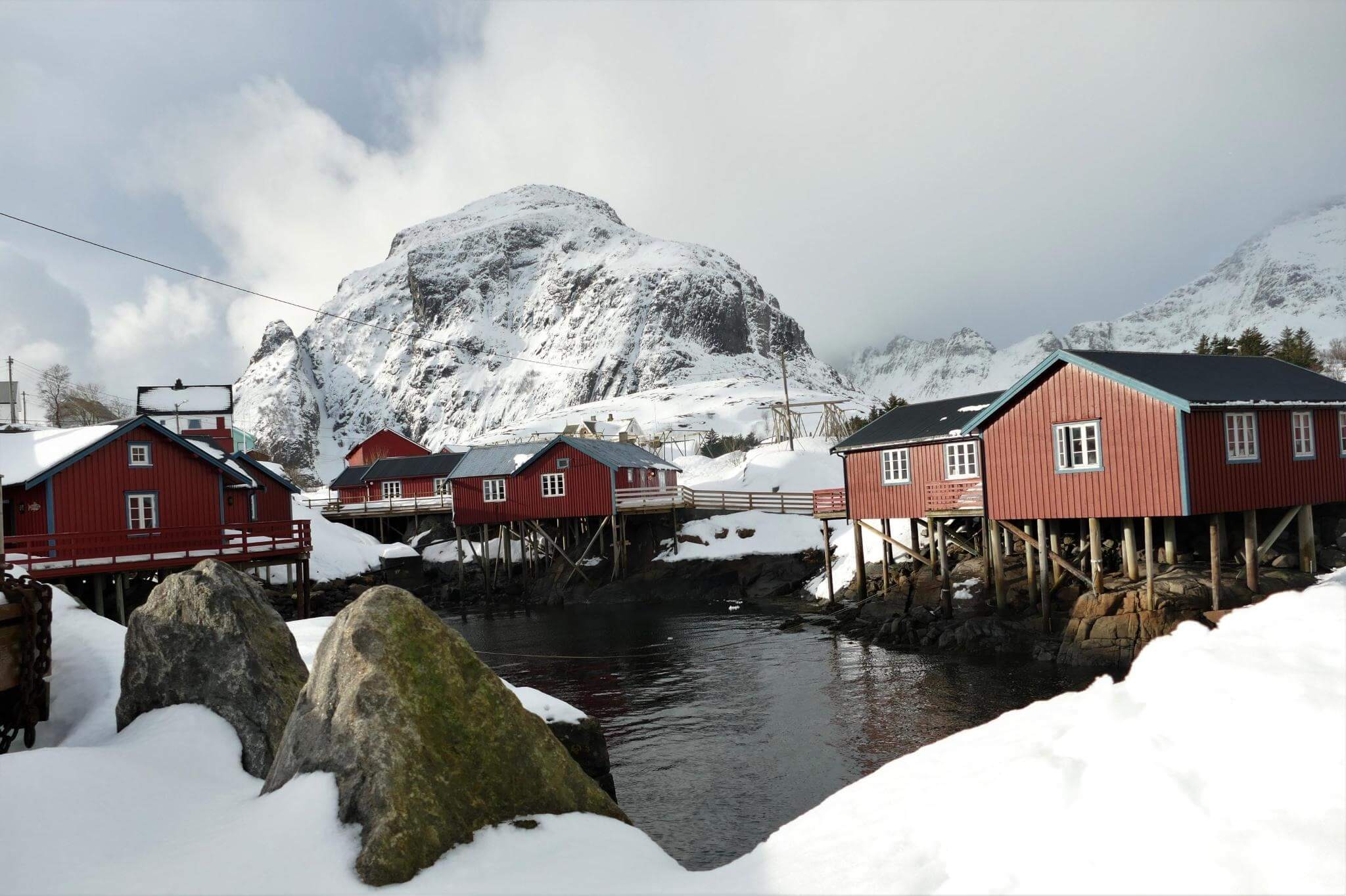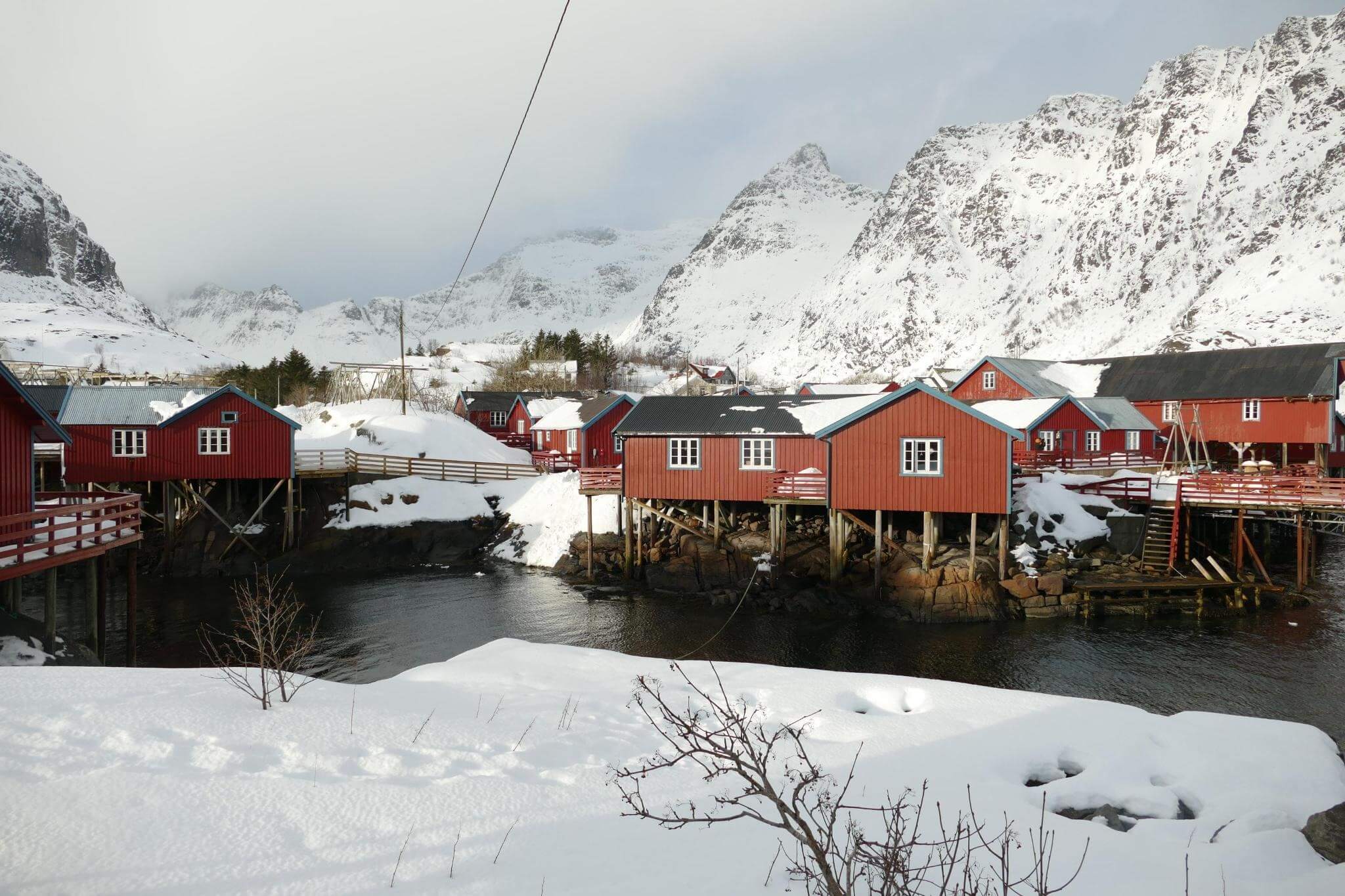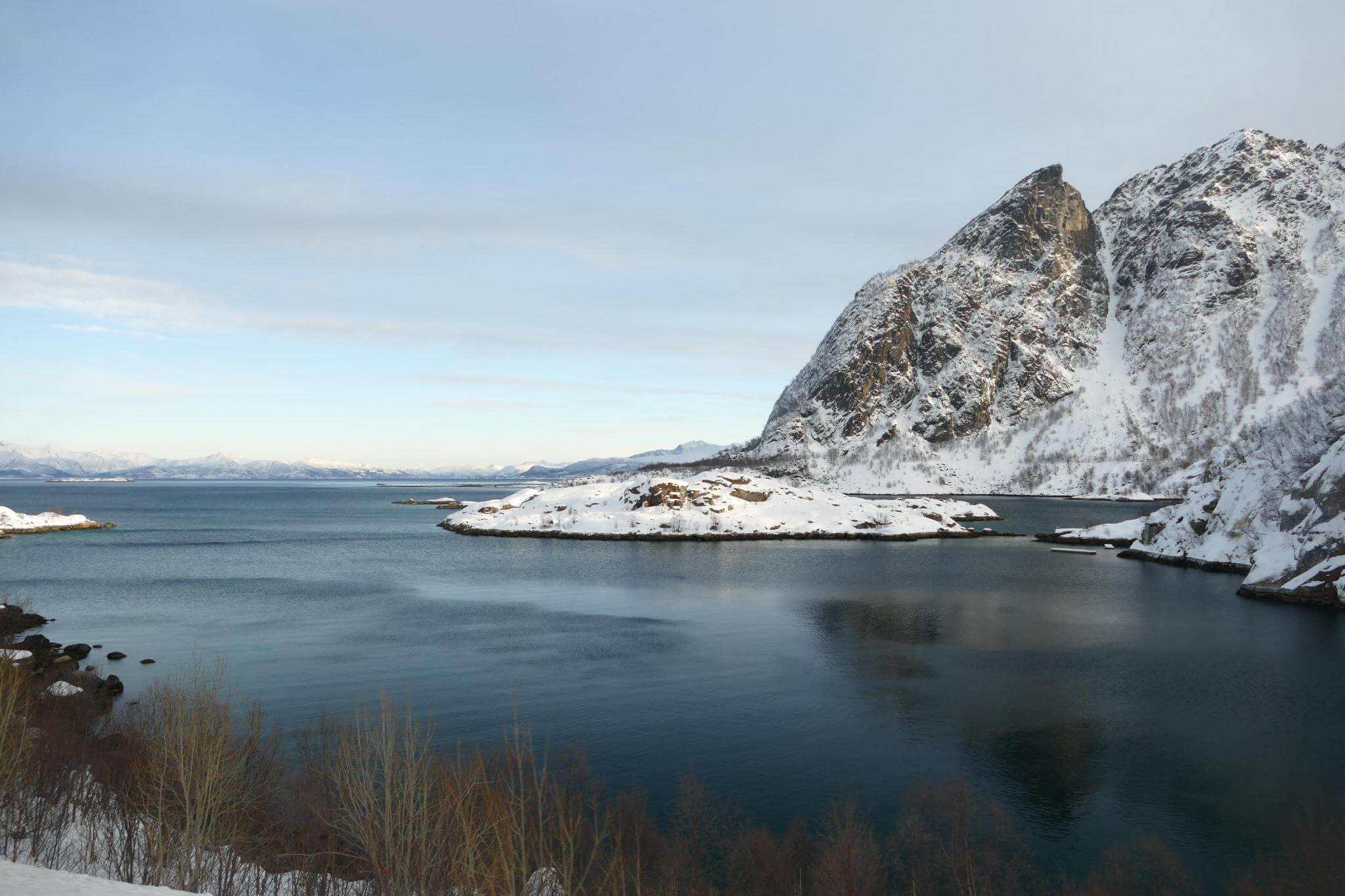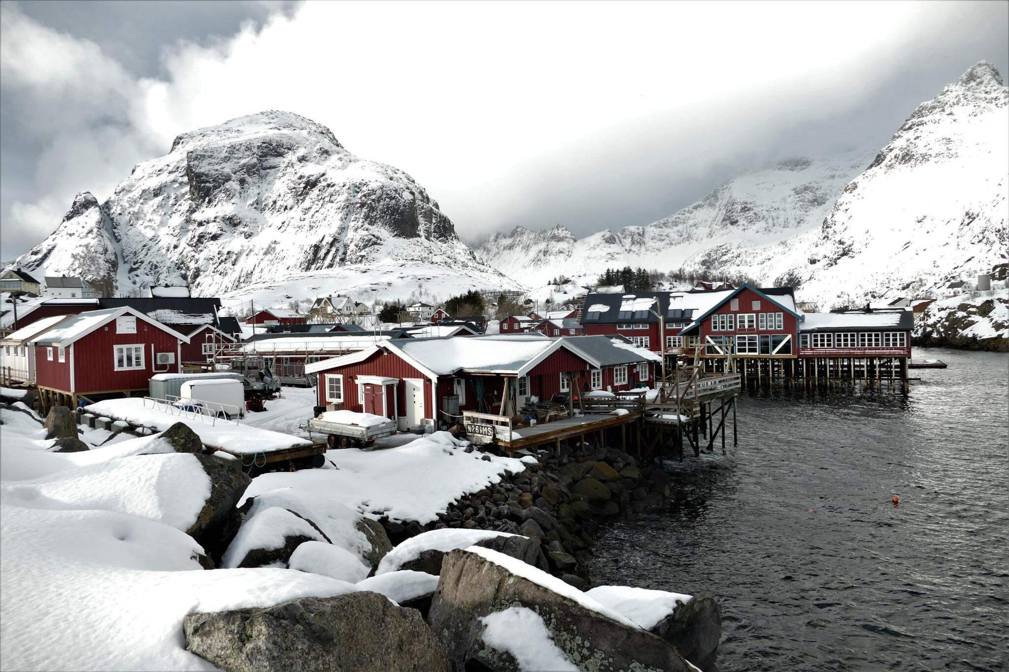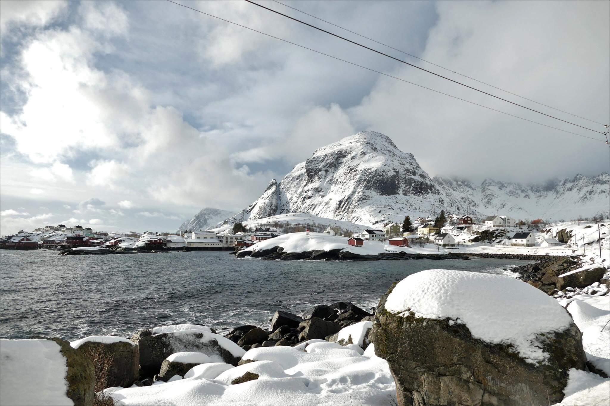Ausgeruht gehen wir auf die Strecke Richtung Moskenes. Über Nacht ist ordentlich Schnee gefallen und bei schnell wechselndem Wetter genießen wir die herrliche Lofotenlandschaft.