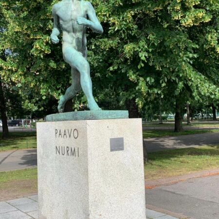 Davor steht das Bronzestandbild des berühmten Langstreckenläufers Paavo Nurmi, der 22 Weltrekorde aufgestellt hat.
