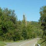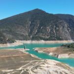 Unterwegs Blick auf einen „versunkenen Ort“ im Stausee, heute steht der Kirchturm wegen Trockenheit auf Land.