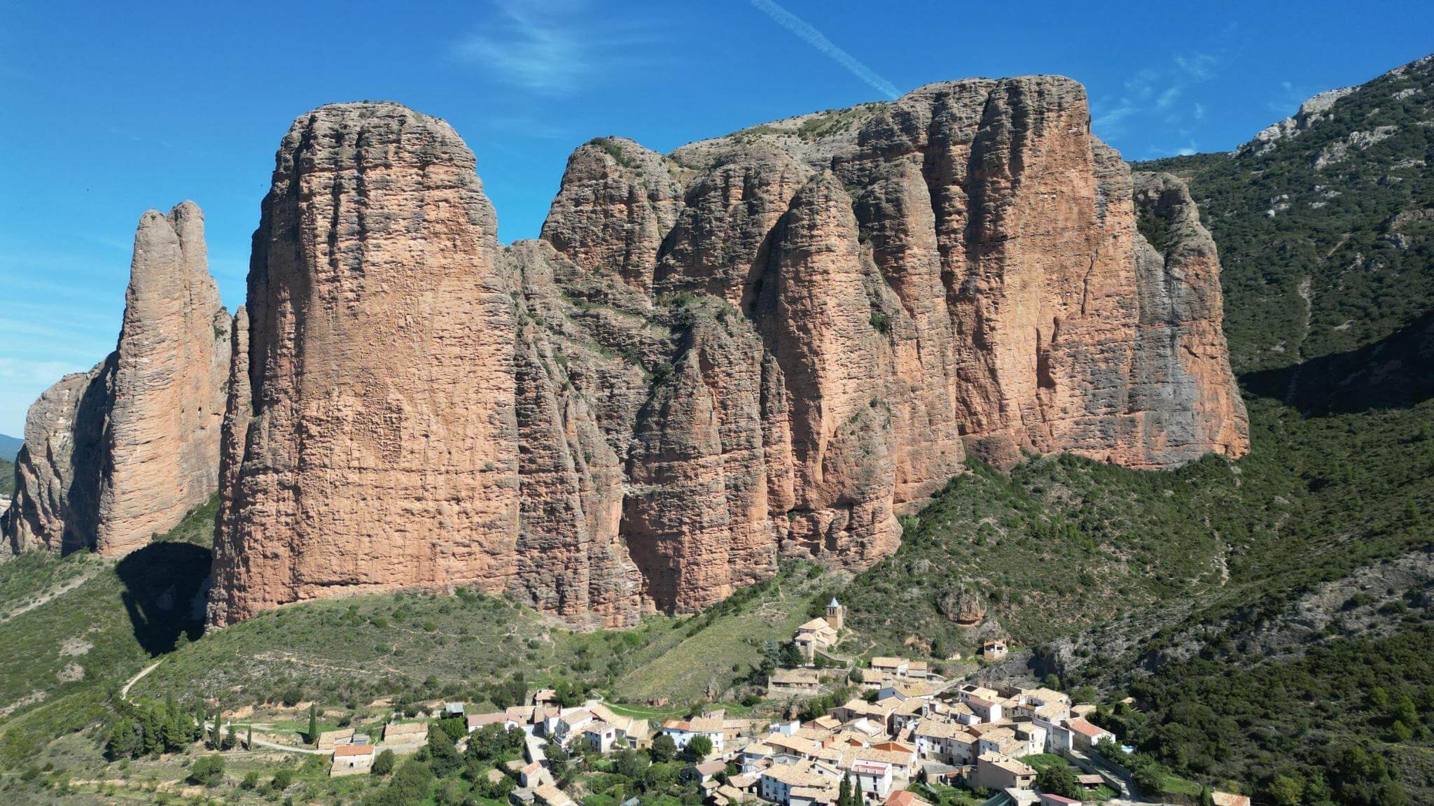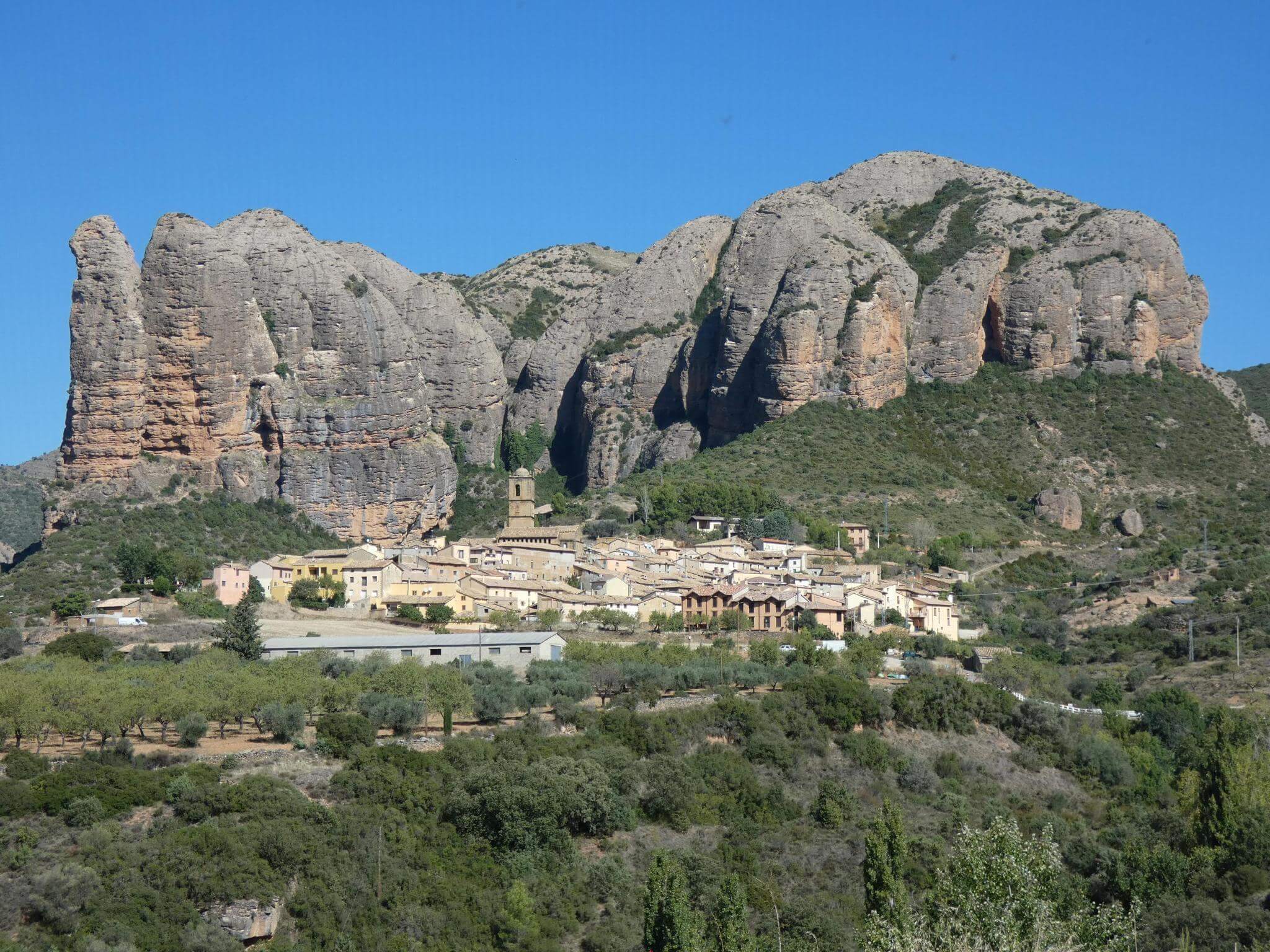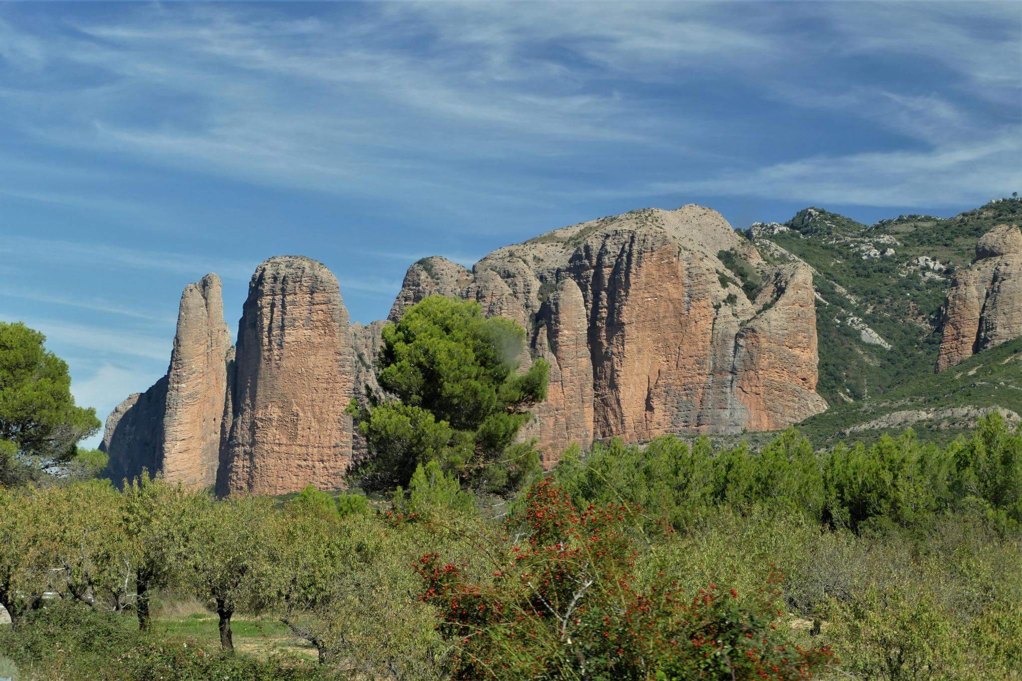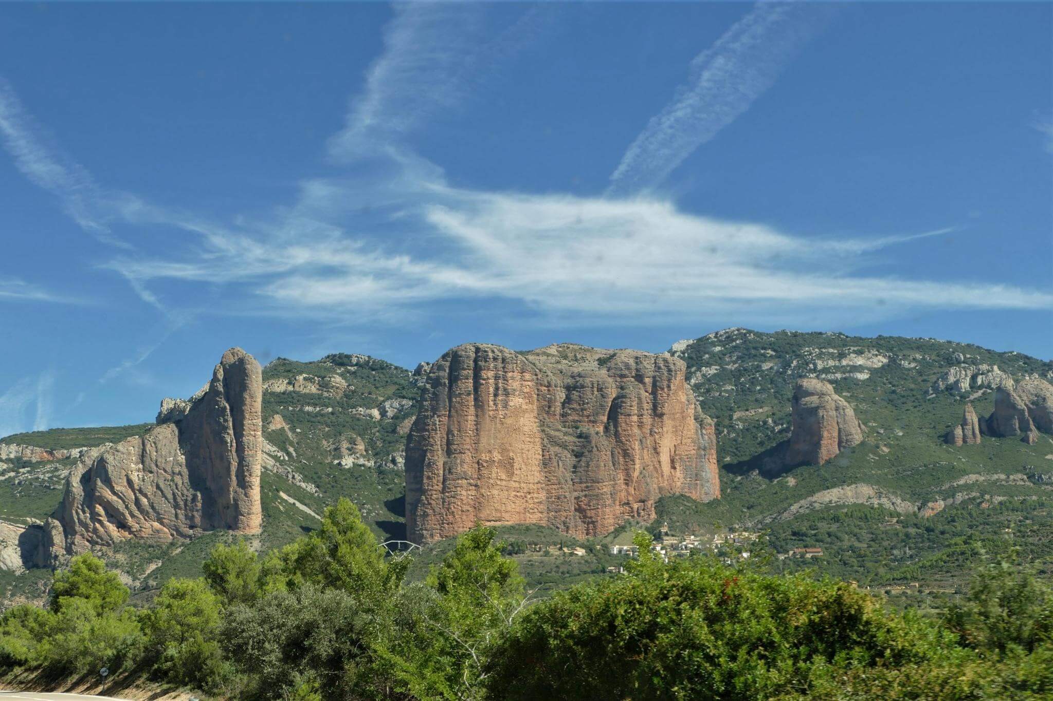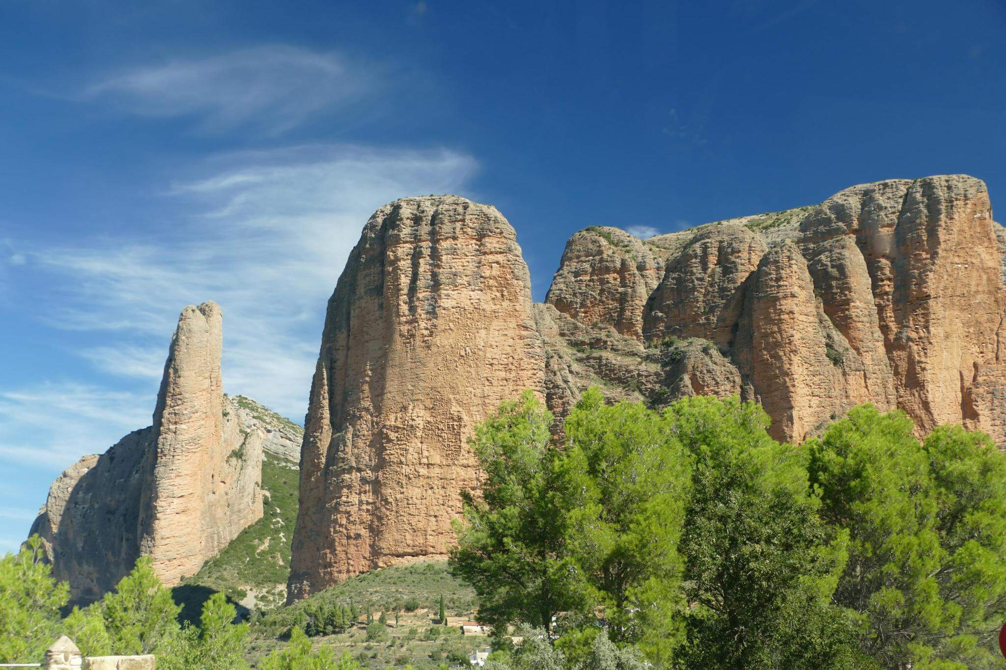 Durch ein schluchtenartiges Tal erreichen wir die Felsen Los Mallos, die europäische Antwort auf Australiens Ayers Rock.