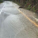 Offensichtlich hat es hier gerade stark geregnet; die Straße ist halbseitig überflutet und von den Seitenstraßen wurden Unmengen von Geröll und Kies auf die Fahrbahn gespült.