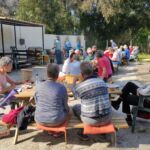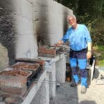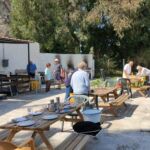 Wir ließen es heute etwas langsamer angehen. Der Bäcker kam um 8.30 Uhr und verwöhnte uns mit seinen wunderbaren Baguettes, Panini und Cornettos/Hörnchen. Nach dem Frühstück erklomm ein Teil der Gruppe den Berg oberhalb des Campingplatzes, auf dem ein bedeutendes Kloster liegt, andere gingen im Meer baden und bei wieder anderen stand zunächst der Waschtag an. Ab 15 Uhr bereiteten wir dann den Grillbereich vor, stellten die Tische auf und Tourleiter Michael heizte die Grills an. Das von ihm am Vortag eingelegte Fleisch wurde dann von ihm und als Ablösung von Uli gegrillt und wir genossen das Gegrillte zusammen mit gutem Brot und vielen von den Teilnehmern bereiteten Salaten bei Fassbier und Wein. Die Stimmung war prima. Jeder hat sich bei der Gestaltung der Campertafel eingebracht und erfreute sich an unserer ersten gemeinsamen Party. Weitere sollen nach Meinung aller folgen.