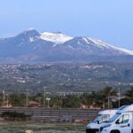 Heute stand laut Tourleiter Michael der schönste Fahrtag auf dem Programm. Zunächst ging es von Oliveri (auf Meereshöhe) auf 1125 Meter Höhe zum Mandrazzipass. Dort erwartete uns die erste Überraschung. Ein Erdrutsch hatte die Hälfte der Straße mitgenommen. Die Stelle war jedoch gut passierbar. Schlechter sah es weiter unten aus, wo kurz vor dem Abzweig zur SP1 die Straße erheblich mehr beschädigt war als weiter oben. Alle entschieden sich jedoch dafür, nicht umzudrehen und die Stelle vorsichtig zu passieren, was auch gelang. Danach folgte die Umrundung des Ätna auf der Westseite oder die kurze Route auf der Ostseite. Dort oben galt es das fruchtbare Land, Lavafelder, ein verschüttetes Haus und die „Brüste der Sophia Loren“ zu bewundern. Wir passierten die Talstation der Bergbahn, bevor es wieder bergabwärts Richtung Strand in Mascali ging. Gegen 18 Uhr trafen die letzten Teilnehmer ein. In etwa die Hälfte kehrte dann noch abschließend in dem guten Restaurant des Campingplatzes ein. Ein wunderschöner, aber auch aufregender Fahrtag ging damit zu Ende.