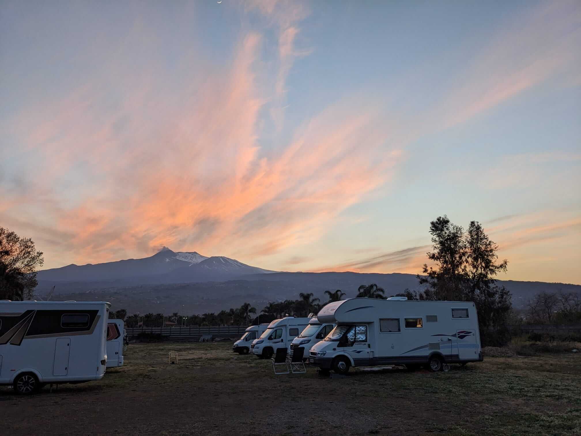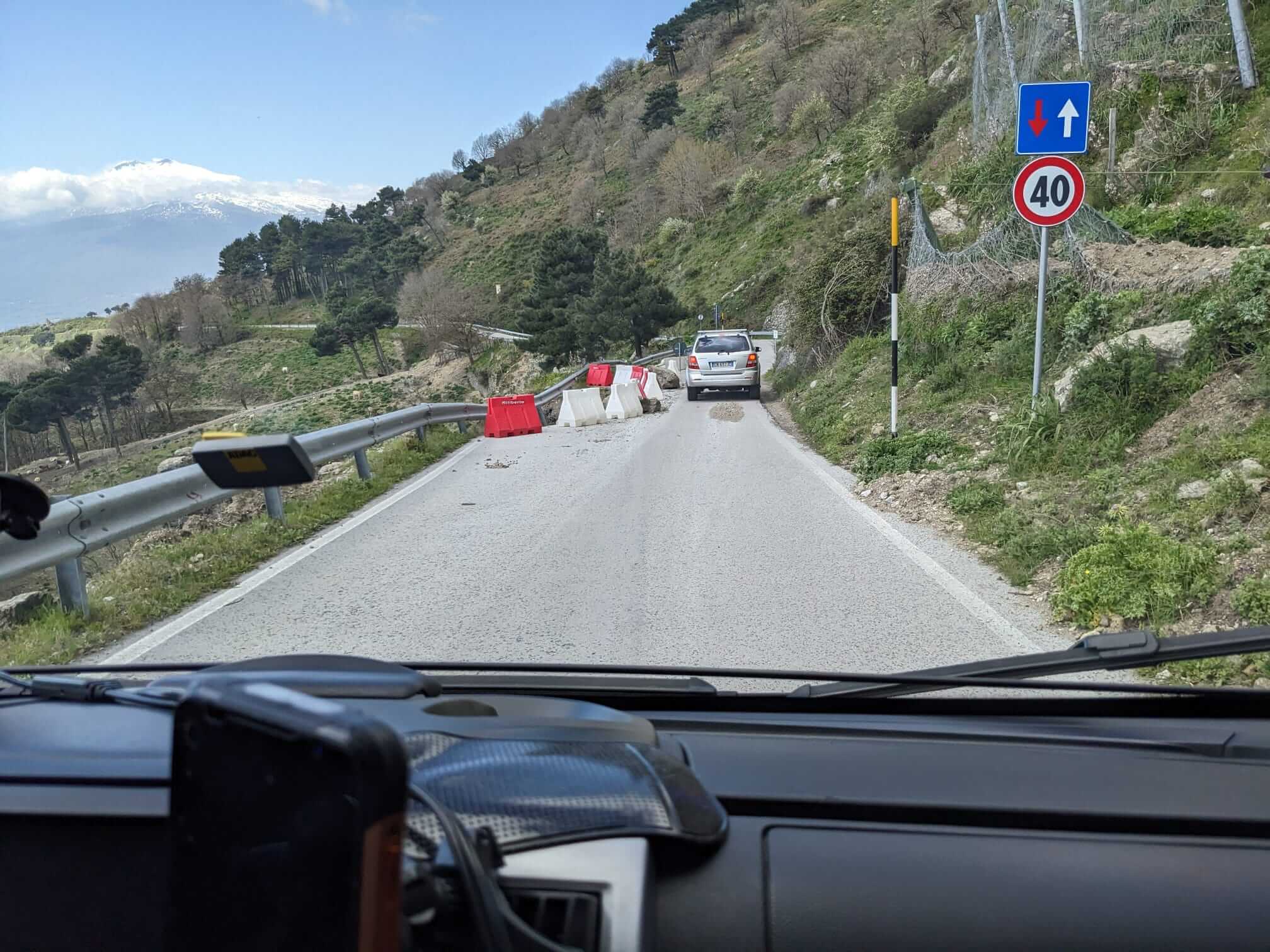 Heute stand laut Tourleiter Michael der schönste Fahrtag auf dem Programm. Zunächst ging es von Oliveri (auf Meereshöhe) auf 1125 Meter Höhe zum Mandrazzipass. Dort erwartete uns die erste Überraschung. Ein Erdrutsch hatte die Hälfte der Straße mitgenommen. Die Stelle war jedoch gut passierbar. Schlechter sah es weiter unten aus, wo kurz vor dem Abzweig zur SP1 die Straße erheblich mehr beschädigt war als weiter oben. Alle entschieden sich jedoch dafür, nicht umzudrehen und die Stelle vorsichtig zu passieren, was auch gelang. Danach folgte die Umrundung des Ätna auf der Westseite oder die kurze Route auf der Ostseite. Dort oben galt es das fruchtbare Land, Lavafelder, ein verschüttetes Haus und die „Brüste der Sophia Loren“ zu bewundern. Wir passierten die Talstation der Bergbahn, bevor es wieder bergabwärts Richtung Strand in Mascali ging. Gegen 18 Uhr trafen die letzten Teilnehmer ein. In etwa die Hälfte kehrte dann noch abschließend in dem guten Restaurant des Campingplatzes ein. Ein wunderschöner, aber auch aufregender Fahrtag ging damit zu Ende.