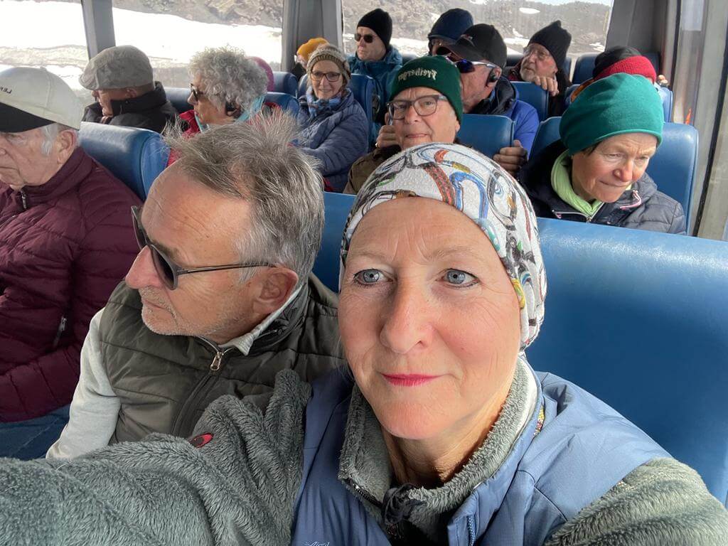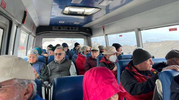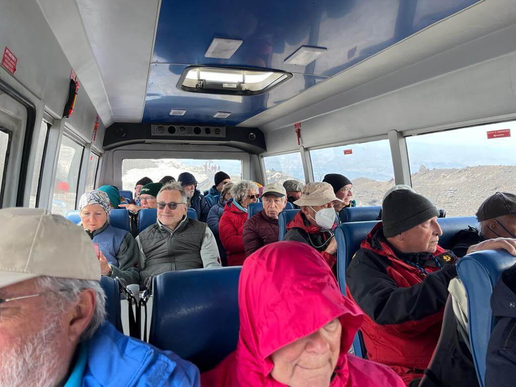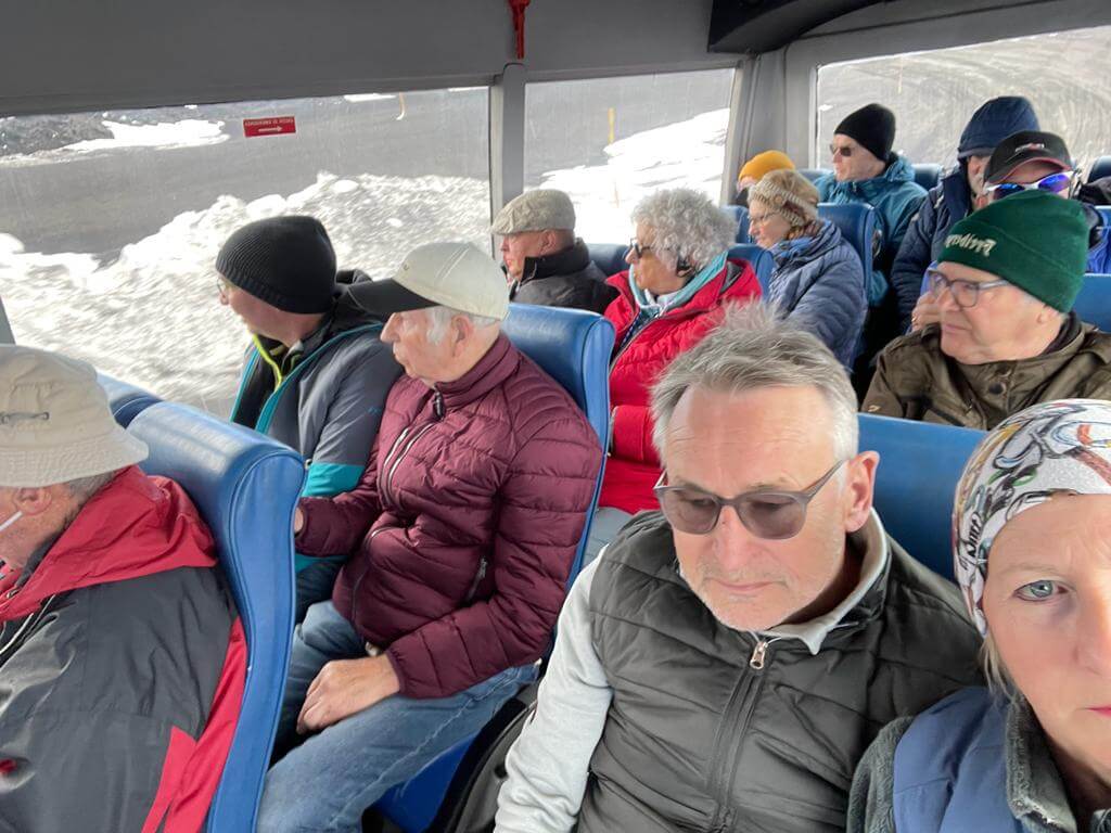 Um 8.40 Uhr holen uns bei bestem Wetter unser Busfahrer Salvatore und unsere Führerin Maria Lina am Campingplatz ab. Der Bus bringt uns in einer starken Stunde mit einem Fotostop unterwegs zur Talstation der Bergbahn, die auf den Ätna auf 2.500 Meter Höhe führt. Von dort aus geht es mit Unimogs weitere 250 Höhenmeter hinauf. Da wartet schon ein Führer auf uns. Maria Lina übersetzt uns seine Ausführungen. Wir wandern bei Starkwind und bei seinen Erläuterungen über eine „Mondlandschaft“ mit ihren verschiedenen Gesteinen bis an den Rand eines 5 x 7 km langen Kraters, der im Falle eines Ausbruchs des Ätna nach Süden die Lava auffangen und so eine Zeit zurückhalten würde. Nach der Rückkehr an die Busstation beginnt der Transfer zur Bergstation der Seilbahn, die uns unserem Bus näher bringt. In der dortigen Bar lösen wir die Gutscheine des Campingplatzes für Sandwich oder Pizza mit Getränk und Café ein. An der Talstation kaufen sich noch einige den guten Honig vom Ätna, den es in vielen Geschmacksrichtungen gibt, bevor uns der Bus zurück zum Campingplatz bringt. Alle sind sich darüber einig, dass der Ätnaausflug bei bestem Wetter nicht hätte besser sein können. Am Nachmittag heißt es ein wenig ausruhen. Abends trifft sich dann ein großer Teil der Gruppe wieder zum gemeinsamen Abendessen im vorzüglichen Restaurant des Campingplatzes.