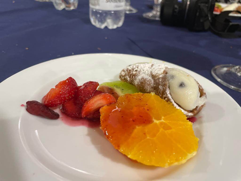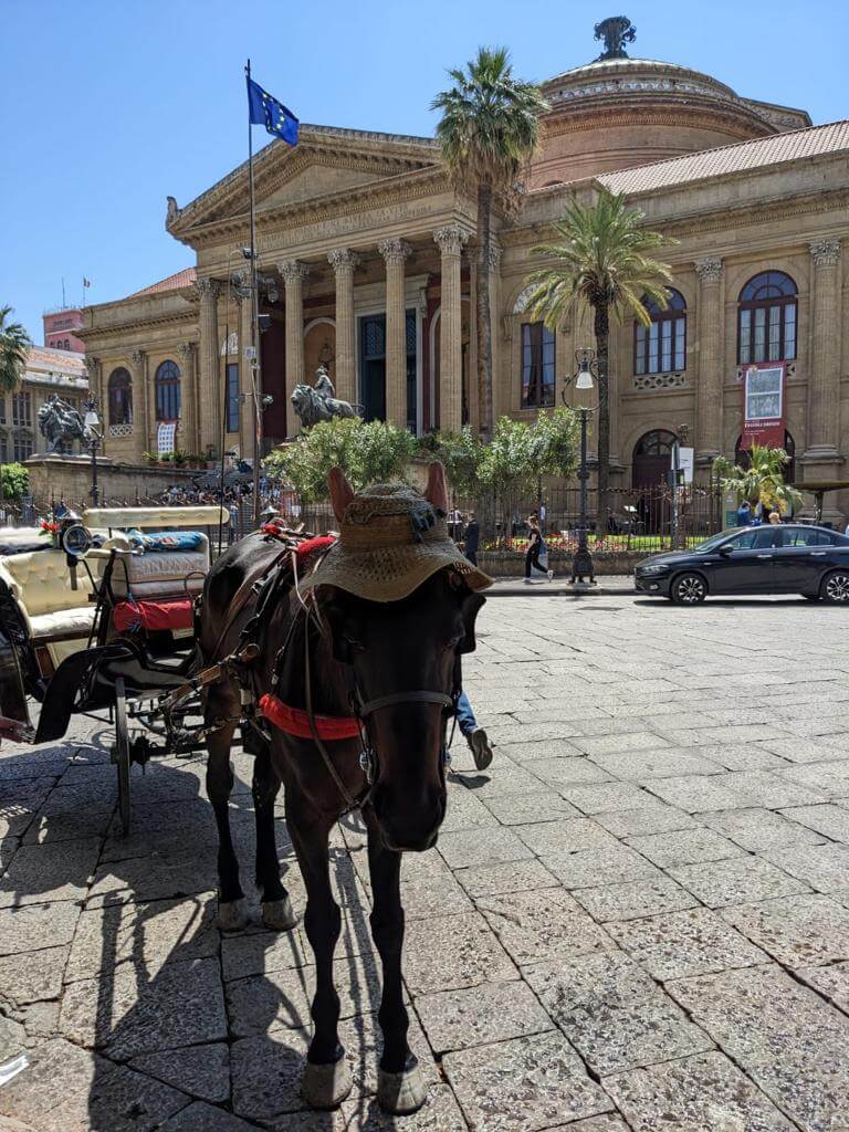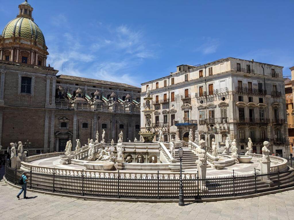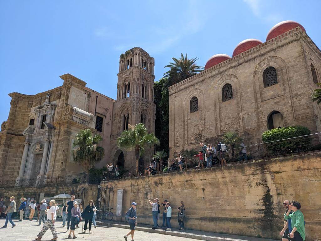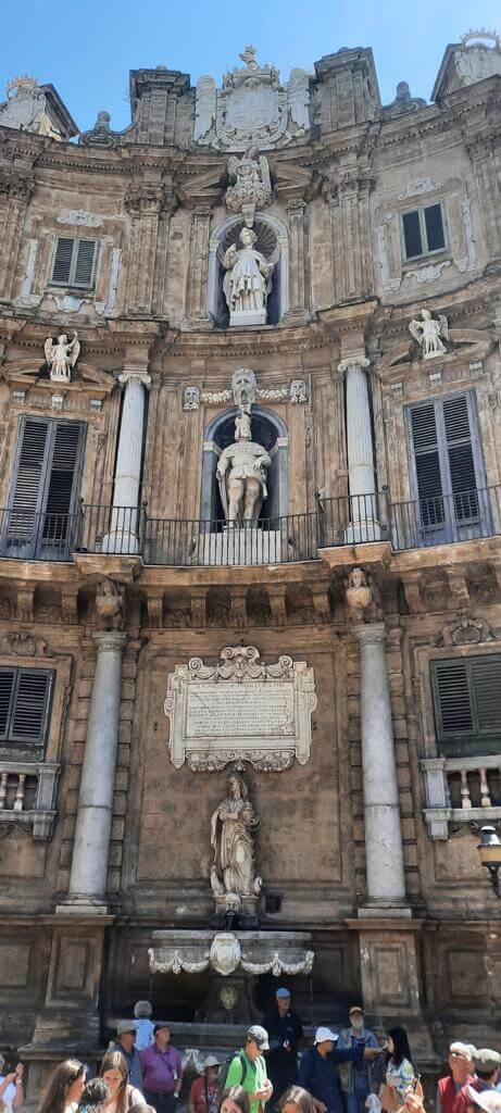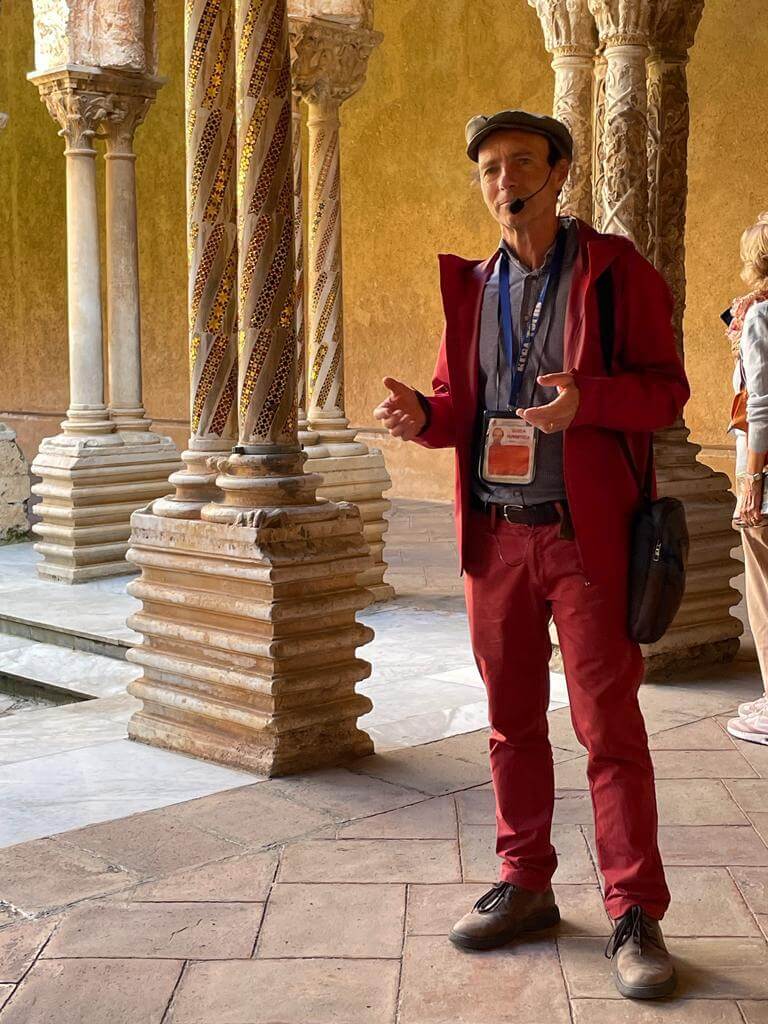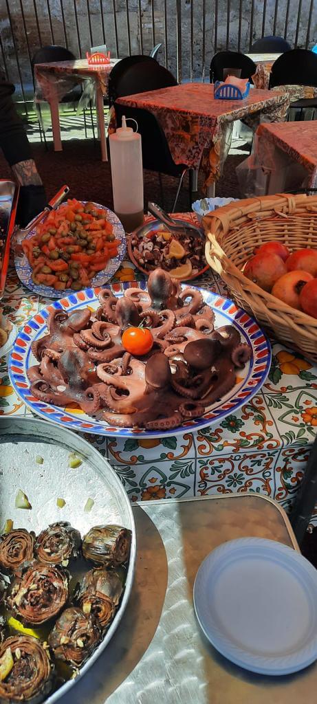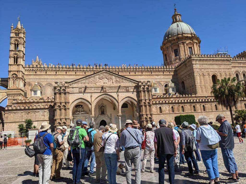 Heute holte uns der Bus leider mit Verspätung ab, denn in Palermo herrschte Verkehrschaos. Unser Führer Gino musste somit umso länger an der Piazza Independenza auf uns warten. Als Erstes galt es das Stadttor und das Parlamentsgebäude zu bewundern, während Gino uns in Palermos Geschichte einführte, die eng mit den Staufern verbunden ist. Weiter ging es zur Kathedrale, die mehrmals umgebaut wurde. Dort sind auch die Gräber der ehemaligen Herrscher zu finden. Dann tauchten wir in die Altstadt von Palermo ein und kamen zum Marktviertel, wo es allerhand zum Probieren und quasi alles zu kaufen gibt. Es folgten die drei wichtigsten Plätze der beeindruckenden Stadt, in der das Leben pulsiert. Anschließend machte ein großer Teil der Gruppe mit Gino noch einen Abstecher in den neueren Stadtteil, bevor die Führung am Opernhaus endete. Unsere Pause hatten wir uns redlich verdient. Danach stiegen wir wieder in den Bus, der uns nach Monreale brachte, wo wir den Königsdom zu besichtigten, der 6.300 Quadratmeter, mit Gold überzogene Mosaike aufzuweisen hat. Wir waren erschlagen von so viel Prunk. Anschließend schauten wir uns dann noch den angrenzenden Kreuzgang an, der auch besonders prachtvoll ist. Dann ging es zurück zum Campingplatz. Abends lud dann Gaby anlässlich ihres Geburtstages zu einem Glas Prosecco ein und nach der Fahrerbesprechung ging es zum opulenten Fischessen im benachbarten Restaurant. Alle waren von der Vielzahl der Vorspeisen, den Pastagängen und dem Schwertfisch begeistert. Ein schöner Abschluss für einen schönen Tag.