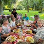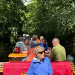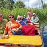 In der Nacht hat es nochmals geregnet, sodass der Platz nur langsam abtrocknet. Aber das Wetter wird besser, der Himmel reißt nach und nach auf. Den Vormittag haben wir zur freien Verfügung. Jetzt gilt es Dinge trocknen, einkaufen, Wasser auffüllen etc. Um 13 Uhr starten wir mit Mike, unserem Bootsführer, zu einer mehrstündigen Kahnfahrt auf der Spree und ihren Seitenarmen. Unterwegs legen wir an einem schönen Gasthaus mit Kiosk eine Pause ein, um uns nach dem anstrengenden Staken des Spreewaldkahns zu stärken. Wir fahren durch die schöne Natur des Spreewaldes und genießen das schöne Wetter. Bei unserer Fahrt müssen wir einige manuell bediente Schleusen durchfahren. Viele Paddelbootfahrer sind ebenfalls unterwegs und entspannen bei ihrer Aktivität in der Natur. Nach unserer Rückkehr sitzen wir in der Sonne oder relaxen anderweitig, bis es zum von Kuga organisiertem Abendessen geht. Kurz vor 19 Uhr laufen wir gemeinsam in das schön gelegene Gasthaus Burglehn neben dem Campingplatz. Dort werden wir mit einer typischen Mahlzeit des Spreewaldes verwöhnt. Nach diesem schmackhaften Essen verbringen wir noch einen schönen gemeinsamen Abend im Restaurant. Zurück am Campingplatz sitzen einige Reiseteilnehmer bei gutem Wein noch lange zusammen.