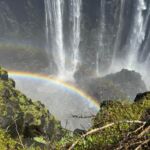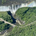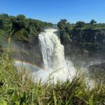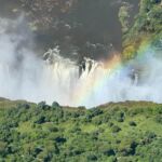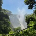 Heute steht ein absolutes Highlight unserer Tour auf dem Programm. Wir fahren nach Zimbabwe, um die Victoria-Fälle zu besichtigen. Die Einreise nach Zimbabwe ist zeitaufwendig, weil in jeden Pass ein Visum eingeklebt werden muss. Nach einer kurzen Fahrt sehen wir schon den riesigen Wassersprühnebel über den Fällen. In einer Breite von 1.708 m stürzt sich der Sambesi bis zu 110 m in die Tiefe. Von der kaum mehr als 50 m entfernten anderen Seite der Schlucht hat man eine traumhafte Aussicht auf dieses Naturspektakel. Nach dieser Besichtigung von einem Fußweg entlang der Schlucht geht es für einige mit einem Helikopter in die Luft. Bei dem Rundflug über den Fall bekommt man erst richtig die riesige Dimension dieses Wasserfalls mit. Auf der Rückfahrt sind sich alle einig, dass sich der Besuch sehr gelohnt hat.