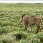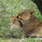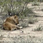 Im Etosha NP ist auf dem Weg von einem zu anderen Camp Pirschfahrt angesagt. D. h., mit geringer Geschwindigkeit werden auf den Schotterpisten die Wasserlöcher und die tiefen Bodenrillen bewältigt und dabei wird links und rechts des Weges alles nach Tieren, Vögeln und sonstigen sich bewegenden Lebewesen abgesucht. Der Erfolg spricht für sich. Heute ist ein Löwentag. Auf dem Weg zu Camp Halali haben uns vermutlich alle Löwen des NP die Ehre erwiesen, sich ablichten zu lassen. Mit den vielen Löwenfotos könnten wir eine eigene Ausstellung gestalten. Für den Abend haben wir im Restaurant des Camps einen Tisch bestellt und das vorzügliche Essen der Küche des Camps Halali genossen.