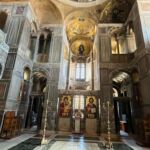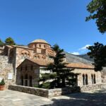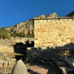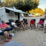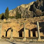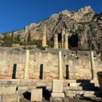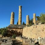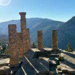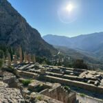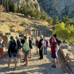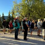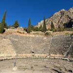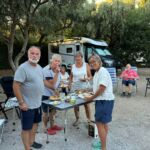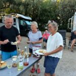 Noch vor Sonnenaufgang starten wir zu den archäologischen Ausgrabungsstätten von Delphi. So können wir die Erläuterungen unseres Guides Penny noch in Ruhe verfolgen. Auch finden wir vor dem großen Ansturm noch genügend Plätze für unsere Wohnmobile. Noch vor unserer Führung stehen wir am Hang vor dem 2457 Meter hohen Parnassgebirge und genießen den Ausblick auf den Golf von Korinth, die Berge des Peloponnes und die Ebene von Amfissa mit ihren unzähligen Olivenbäumen. In der Antike kamen viele Pilger nach Delphi, um den Orakelspruch der Pythia zu erhalten und Apollon zu ehren. Dann beginnt unsere Führung und wir erfahren viele interessante Details zur Geschichte von Delphi und dem dortigen Leben in der Antike. Wir hören auch, dass für die Menschen damals Delphi als Mittelpunkt (Nabel) der Welt galt. Nach der Führung besuchen wir noch das kleine Museum nebenan, wo es weitere eindrucksvolle Ausstellungsstücke zu bestaunen gibt. Ohne einen Orakelspruch zu erhalten, setzen wir unsere Fahrt Richtung Athen fort. Nach wenigen Kilometern verlassen wir die Hauptstraße und biegen nach rechts zum Kloster Osious Loukas ab. Dieses kleine Kloster ist zum einen sehr schön gelegen und zum anderen allemal einen Besuch wert. Besonders die Klosterkirche beeindruckt mit ihren vielen Mosaiken aus dem 11. Jahrhundert. Seit 1990 gehört die Anlage zum UNESCO-Weltkulturerbe. Ein Klosterladen mit kleinem Café lädt zu einer Pause ein. Mit einem guten Cappuccino lässt sich der grandiose Ausblick noch besser genießen. Beeindruckend ist auch, dass das Kloster bei den großen Waldbränden in dieser Region geschützt werden konnte. Viele Hubschrauberflüge waren dafür notwendig. Um das Kloster herum sind die Brandfolgen noch sehr gut sichtbar. Weiter geht unsere Fahrt auf schmalen Straßen durch kleine Dörfer und unberührte Natur. Nachdem wir den höchsten Punkt mit ca. 1000 m ü. NN passiert haben, geht es langsam abwärts, Athen entgegen. Leider können wir das Kloster Dafni kurz vor Athen heute wegen des Ruhetages nicht besichtigen. Nachdem alle Reiseteilnehmer den Campingplatz erreicht haben, treffen wir uns um 18 Uhr zu einer kurzen Abstimmung für den Ablauf am morgigen Tag. Danach sitzen wir noch länger gemütlich beisammen. Die Reiseleitung hat etwas Brot, Tzatziki und andere Aufstriche besorgt. Wein vom Vortag ist auch noch übrig. Als dieser ausgetrunken ist, sorgt Nati für Nachschub.