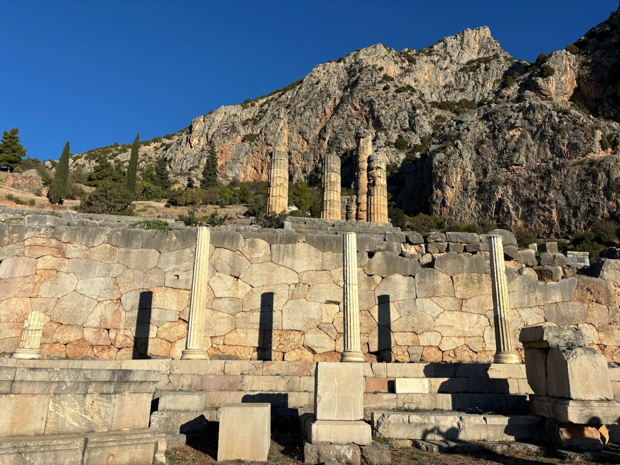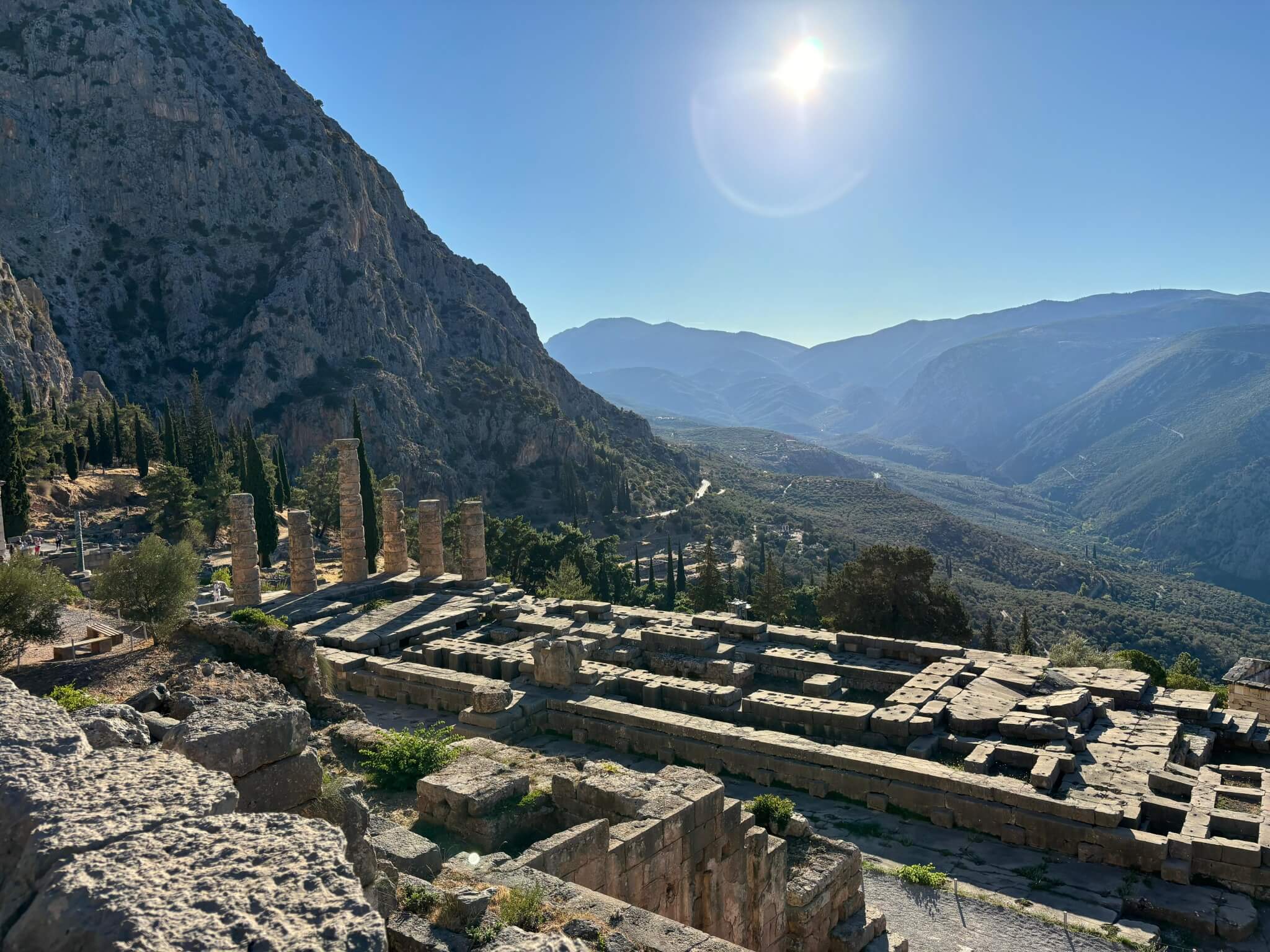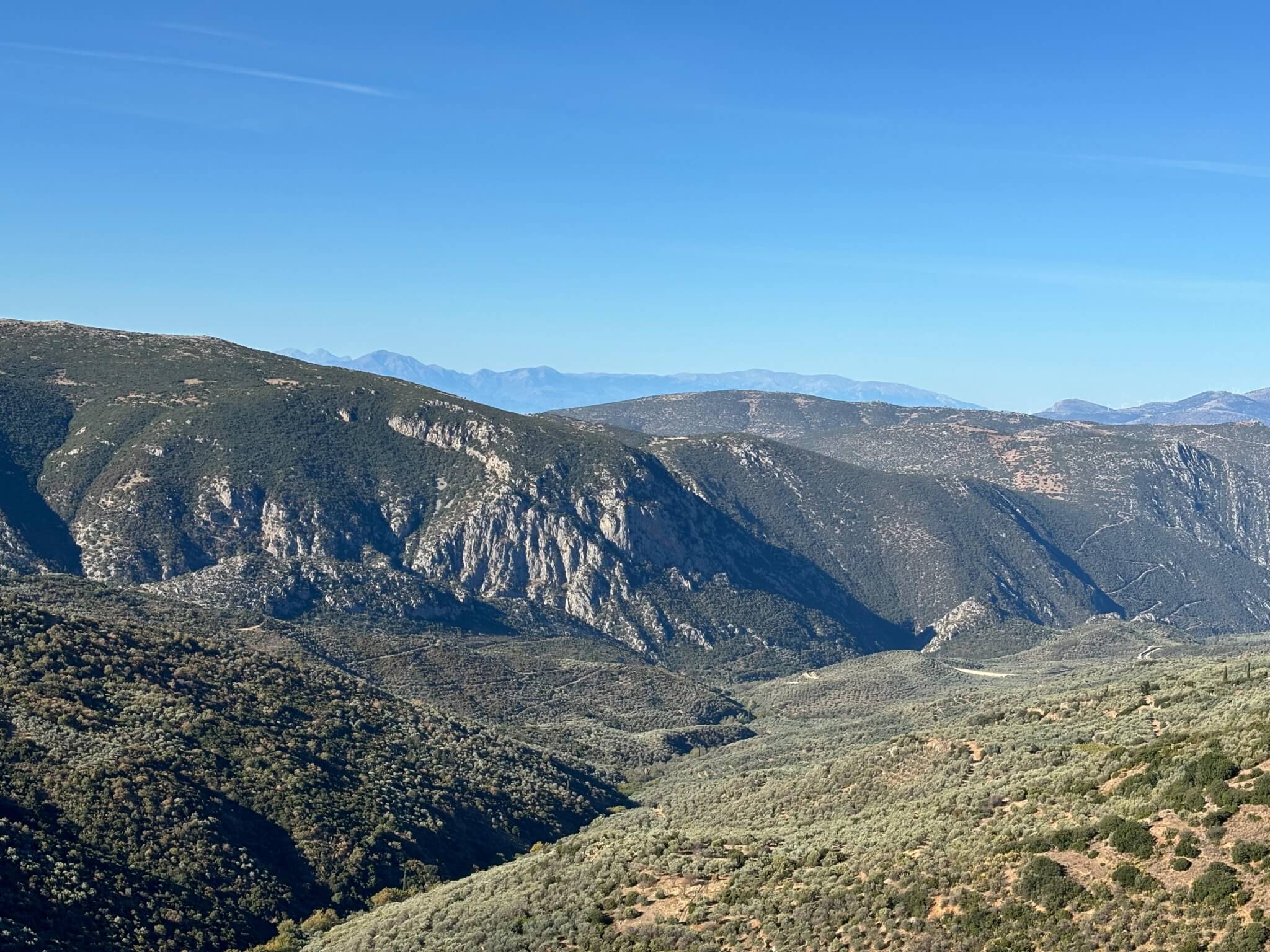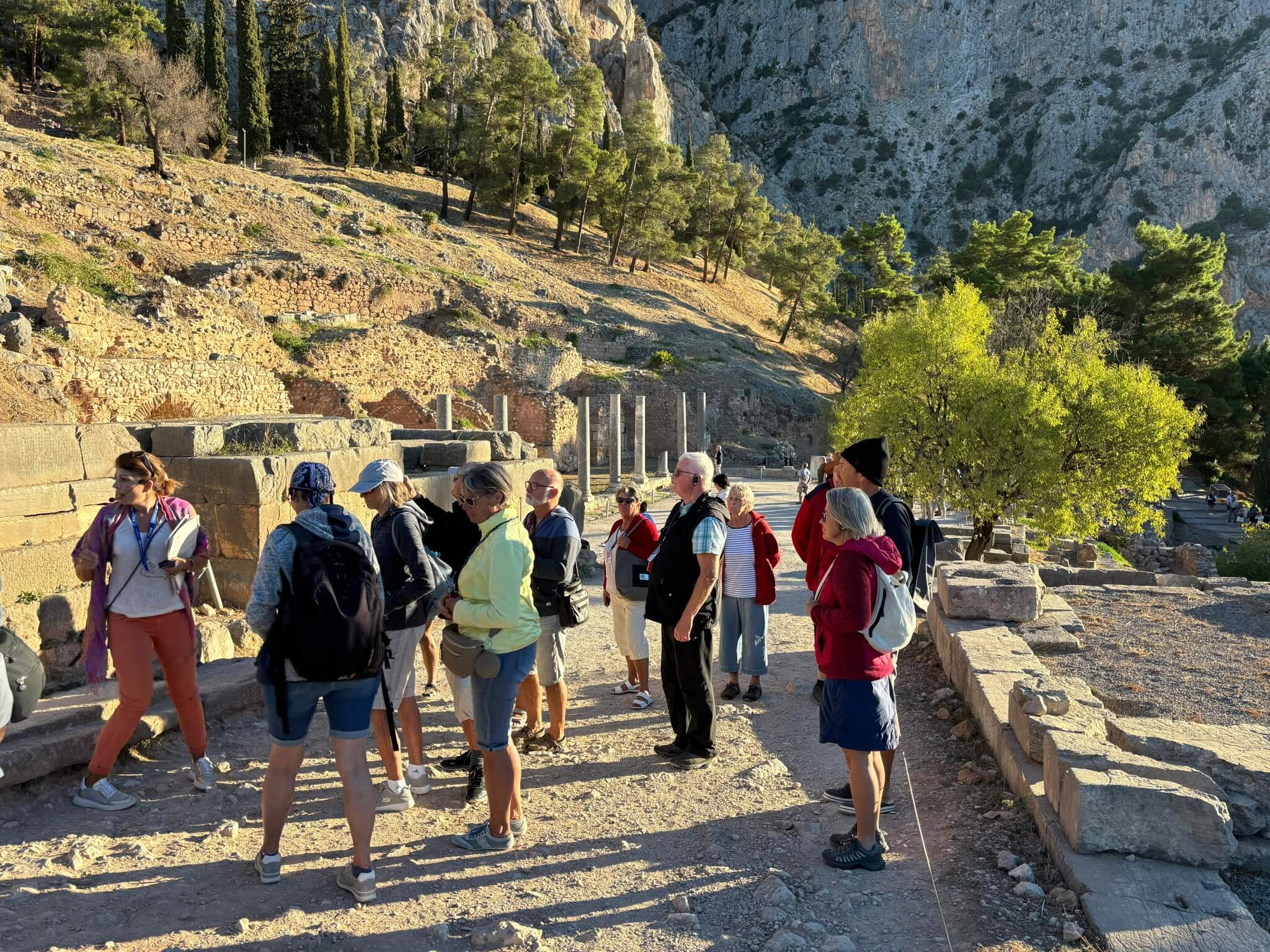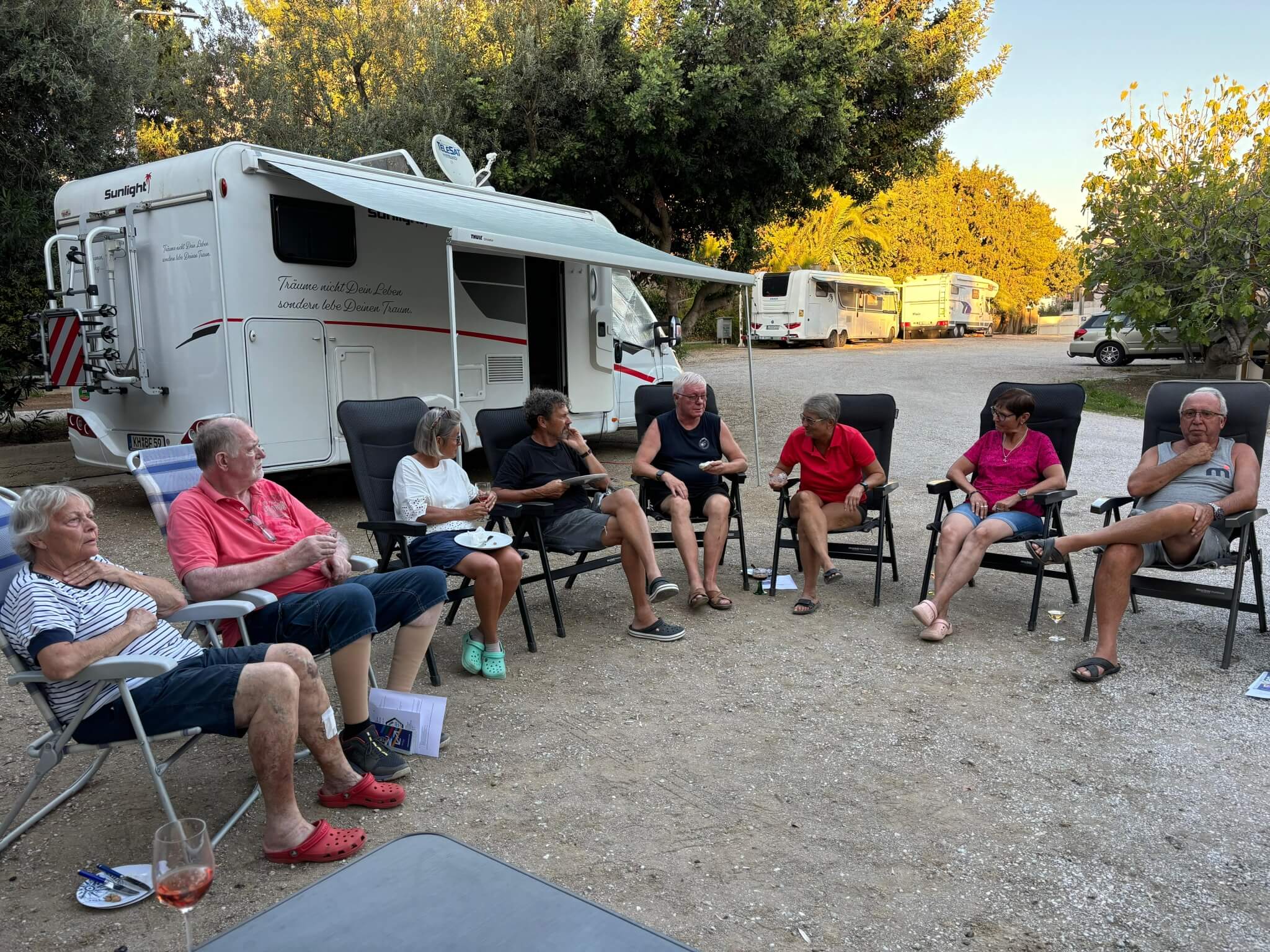 Noch vor Sonnenaufgang starten wir zu den archäologischen Ausgrabungsstätten von Delphi. So können wir die Erläuterungen unseres Guides Penny noch in Ruhe verfolgen. Auch finden wir vor dem großen Ansturm noch genügend Plätze für unsere Wohnmobile. Noch vor unserer Führung stehen wir am Hang vor dem 2457 Meter hohen Parnassgebirge und genießen den Ausblick auf den Golf von Korinth, die Berge des Peloponnes und die Ebene von Amfissa mit ihren unzähligen Olivenbäumen. In der Antike kamen viele Pilger nach Delphi, um den Orakelspruch der Pythia zu erhalten und Apollon zu ehren. Dann beginnt unsere Führung und wir erfahren viele interessante Details zur Geschichte von Delphi und dem dortigen Leben in der Antike. Wir hören auch, dass für die Menschen damals Delphi als Mittelpunkt (Nabel) der Welt galt. Nach der Führung besuchen wir noch das kleine Museum nebenan, wo es weitere eindrucksvolle Ausstellungsstücke zu bestaunen gibt. Ohne einen Orakelspruch zu erhalten, setzen wir unsere Fahrt Richtung Athen fort. Nach wenigen Kilometern verlassen wir die Hauptstraße und biegen nach rechts zum Kloster Osious Loukas ab. Dieses kleine Kloster ist zum einen sehr schön gelegen und zum anderen allemal einen Besuch wert. Besonders die Klosterkirche beeindruckt mit ihren vielen Mosaiken aus dem 11. Jahrhundert. Seit 1990 gehört die Anlage zum UNESCO-Weltkulturerbe. Ein Klosterladen mit kleinem Café lädt zu einer Pause ein. Mit einem guten Cappuccino lässt sich der grandiose Ausblick noch besser genießen. Beeindruckend ist auch, dass das Kloster bei den großen Waldbränden in dieser Region geschützt werden konnte. Viele Hubschrauberflüge waren dafür notwendig. Um das Kloster herum sind die Brandfolgen noch sehr gut sichtbar. Weiter geht unsere Fahrt auf schmalen Straßen durch kleine Dörfer und unberührte Natur. Nachdem wir den höchsten Punkt mit ca. 1000 m ü. NN passiert haben, geht es langsam abwärts, Athen entgegen. Leider können wir das Kloster Dafni kurz vor Athen heute wegen des Ruhetages nicht besichtigen. Nachdem alle Reiseteilnehmer den Campingplatz erreicht haben, treffen wir uns um 18 Uhr zu einer kurzen Abstimmung für den Ablauf am morgigen Tag. Danach sitzen wir noch länger gemütlich beisammen. Die Reiseleitung hat etwas Brot, Tzatziki und andere Aufstriche besorgt. Wein vom Vortag ist auch noch übrig. Als dieser ausgetrunken ist, sorgt Nati für Nachschub.
