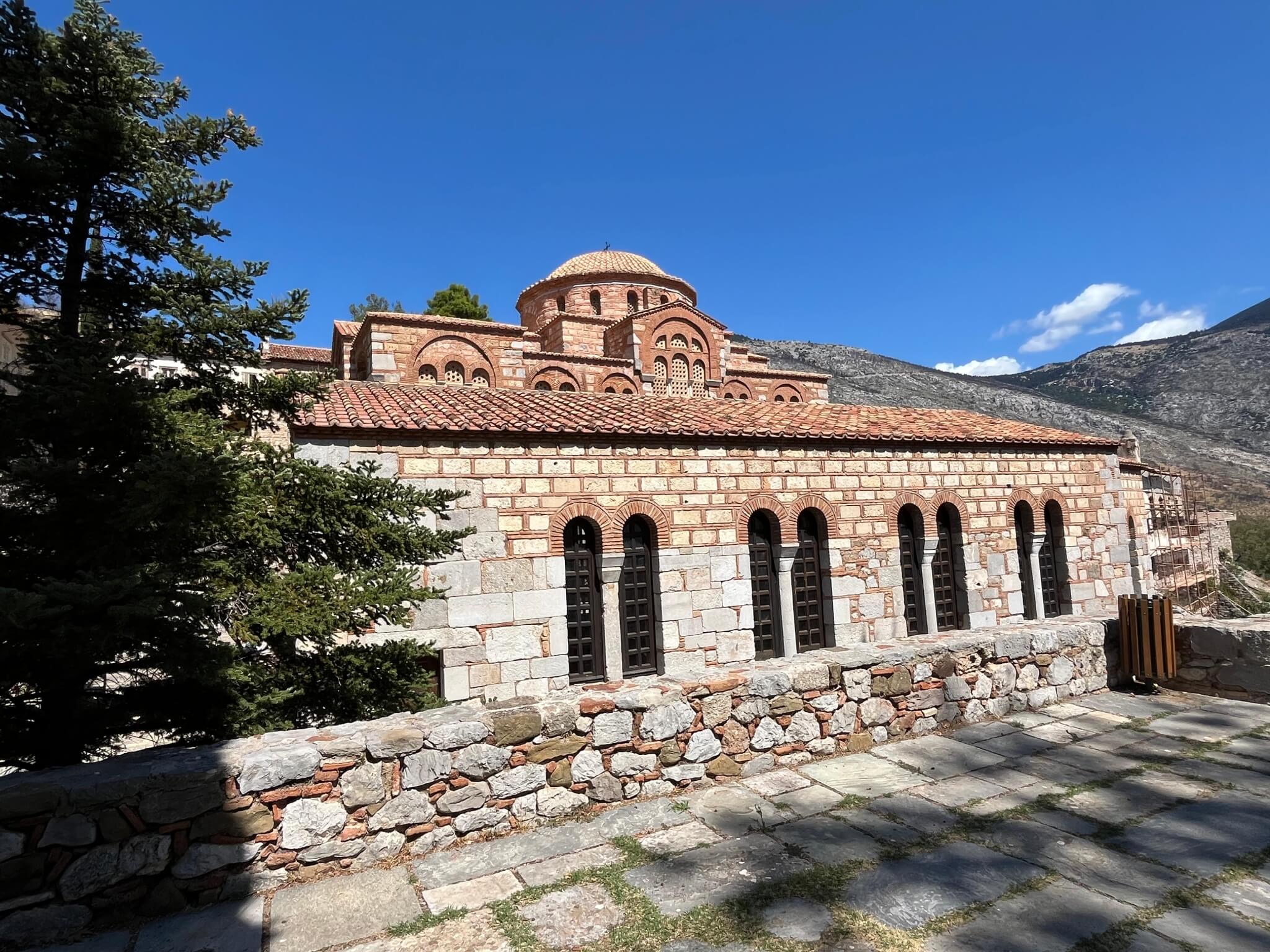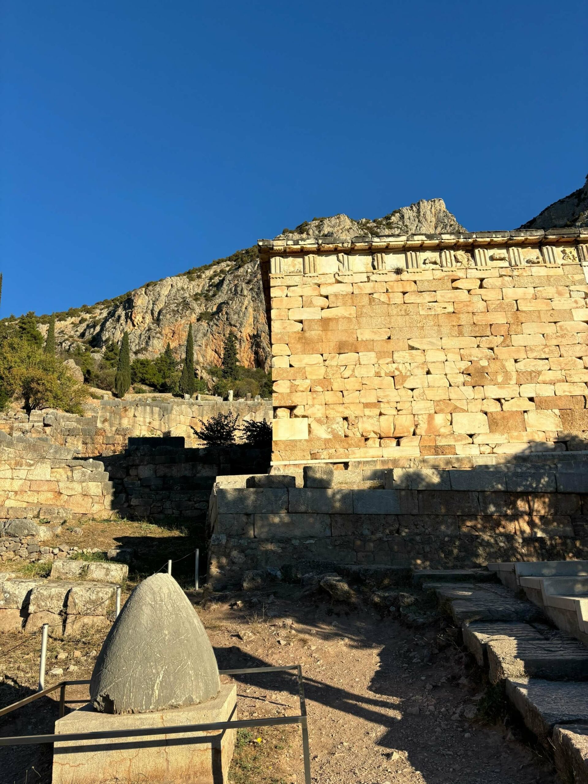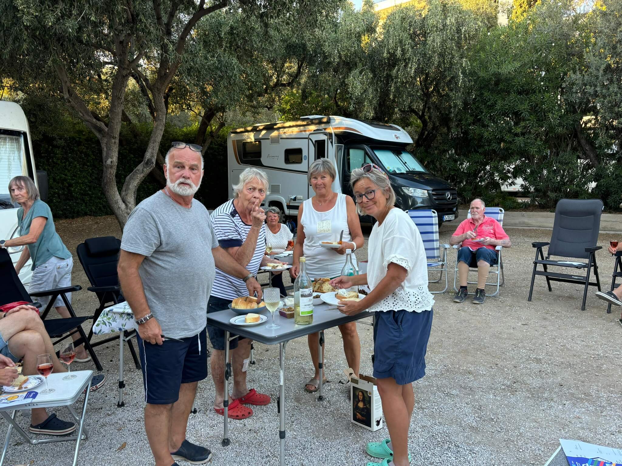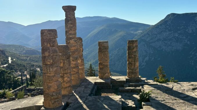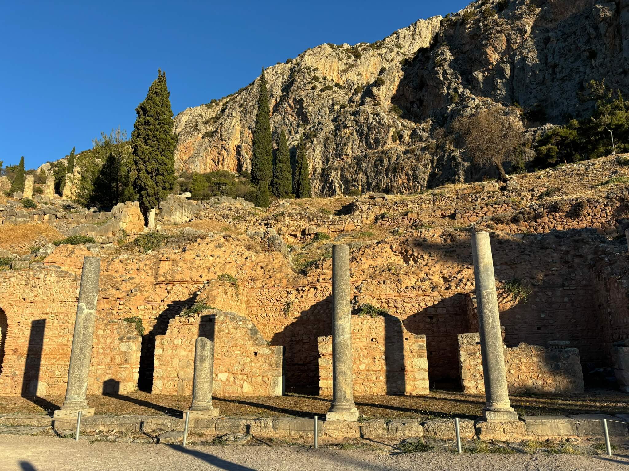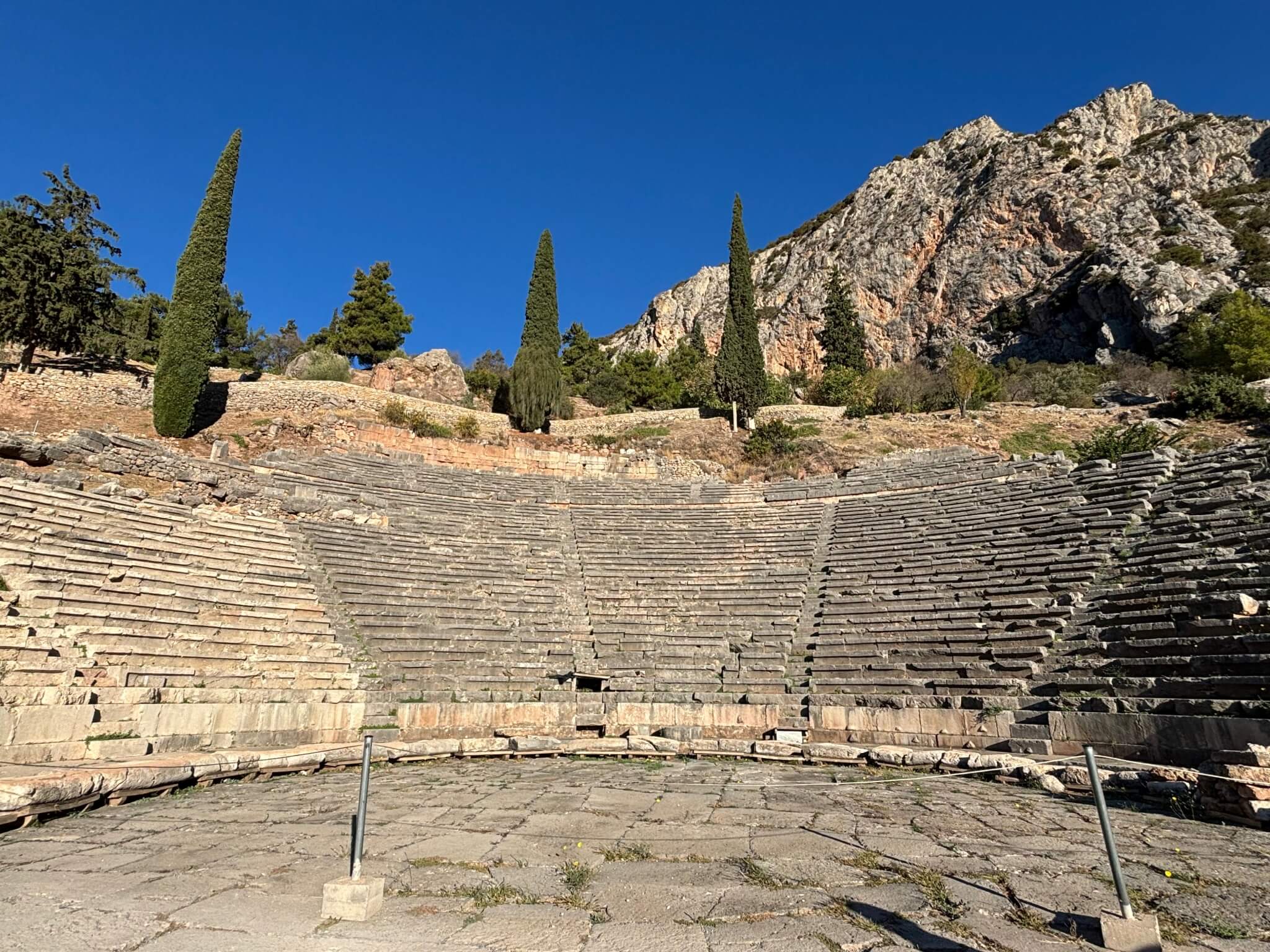 Noch vor Sonnenaufgang starten wir zu den archäologischen Ausgrabungsstätten von Delphi. So können wir die Erläuterungen unseres Guides Penny noch in Ruhe verfolgen. Auch finden wir vor dem großen Ansturm noch genügend Plätze für unsere Wohnmobile. Noch vor unserer Führung stehen wir am Hang vor dem 2457 Meter hohen Parnassgebirge und genießen den Ausblick auf den Golf von Korinth, die Berge des Peloponnes und die Ebene von Amfissa mit ihren unzähligen Olivenbäumen. In der Antike kamen viele Pilger nach Delphi, um den Orakelspruch der Pythia zu erhalten und Apollon zu ehren. Dann beginnt unsere Führung und wir erfahren viele interessante Details zur Geschichte von Delphi und dem dortigen Leben in der Antike. Wir hören auch, dass für die Menschen damals Delphi als Mittelpunkt (Nabel) der Welt galt. Nach der Führung besuchen wir noch das kleine Museum nebenan, wo es weitere eindrucksvolle Ausstellungsstücke zu bestaunen gibt. Ohne einen Orakelspruch zu erhalten, setzen wir unsere Fahrt Richtung Athen fort. Nach wenigen Kilometern verlassen wir die Hauptstraße und biegen nach rechts zum Kloster Osious Loukas ab. Dieses kleine Kloster ist zum einen sehr schön gelegen und zum anderen allemal einen Besuch wert. Besonders die Klosterkirche beeindruckt mit ihren vielen Mosaiken aus dem 11. Jahrhundert. Seit 1990 gehört die Anlage zum UNESCO-Weltkulturerbe. Ein Klosterladen mit kleinem Café lädt zu einer Pause ein. Mit einem guten Cappuccino lässt sich der grandiose Ausblick noch besser genießen. Beeindruckend ist auch, dass das Kloster bei den großen Waldbränden in dieser Region geschützt werden konnte. Viele Hubschrauberflüge waren dafür notwendig. Um das Kloster herum sind die Brandfolgen noch sehr gut sichtbar. Weiter geht unsere Fahrt auf schmalen Straßen durch kleine Dörfer und unberührte Natur. Nachdem wir den höchsten Punkt mit ca. 1000 m ü. NN passiert haben, geht es langsam abwärts, Athen entgegen. Leider können wir das Kloster Dafni kurz vor Athen heute wegen des Ruhetages nicht besichtigen. Nachdem alle Reiseteilnehmer den Campingplatz erreicht haben, treffen wir uns um 18 Uhr zu einer kurzen Abstimmung für den Ablauf am morgigen Tag. Danach sitzen wir noch länger gemütlich beisammen. Die Reiseleitung hat etwas Brot, Tzatziki und andere Aufstriche besorgt. Wein vom Vortag ist auch noch übrig. Als dieser ausgetrunken ist, sorgt Nati für Nachschub.