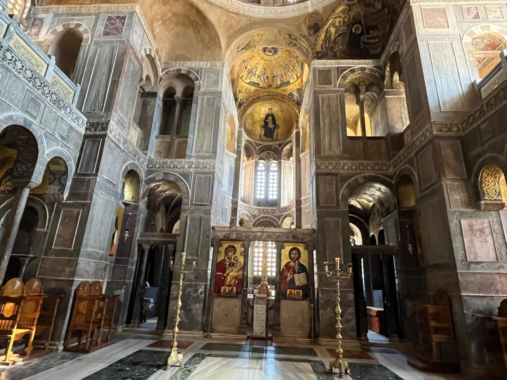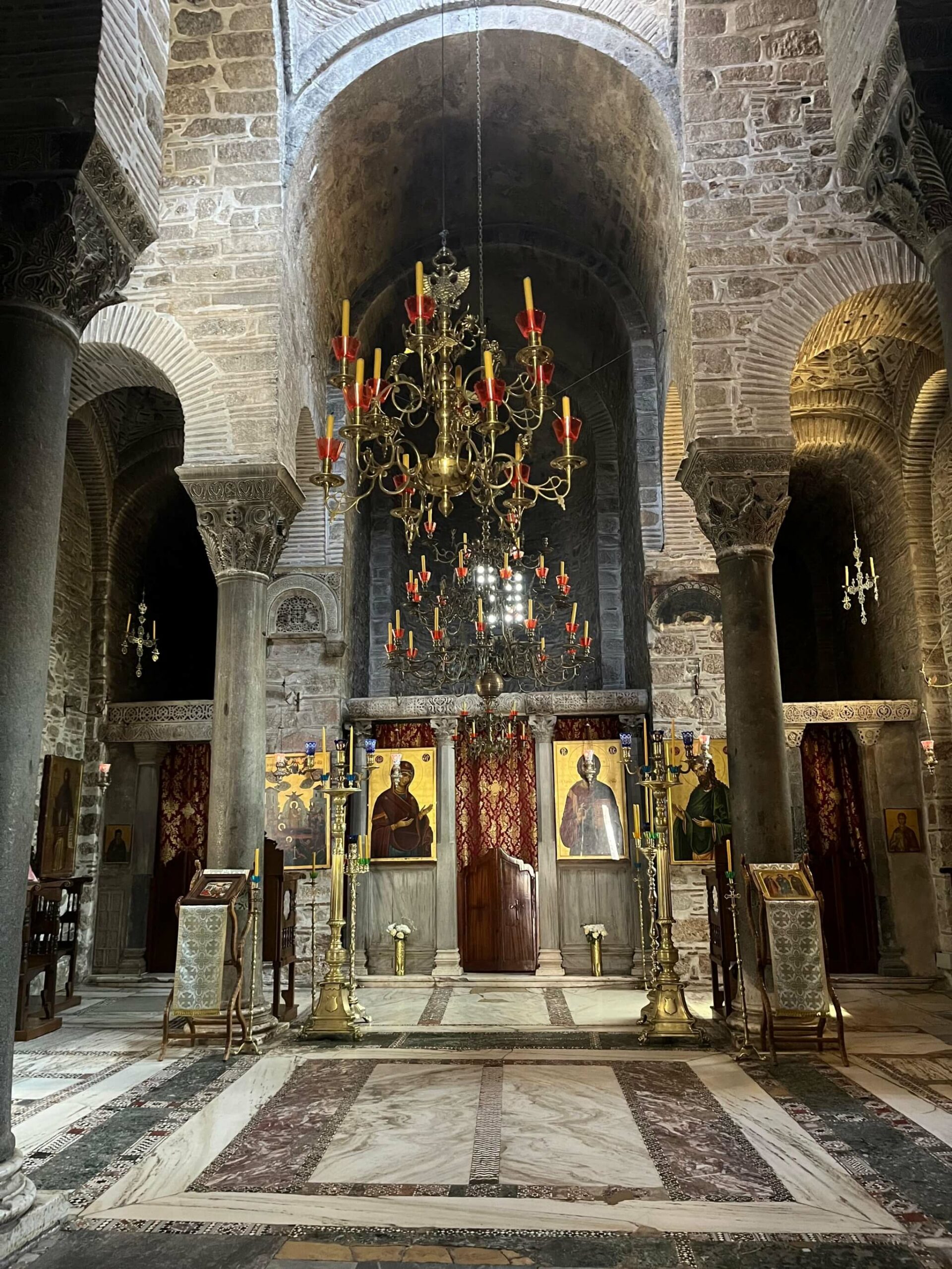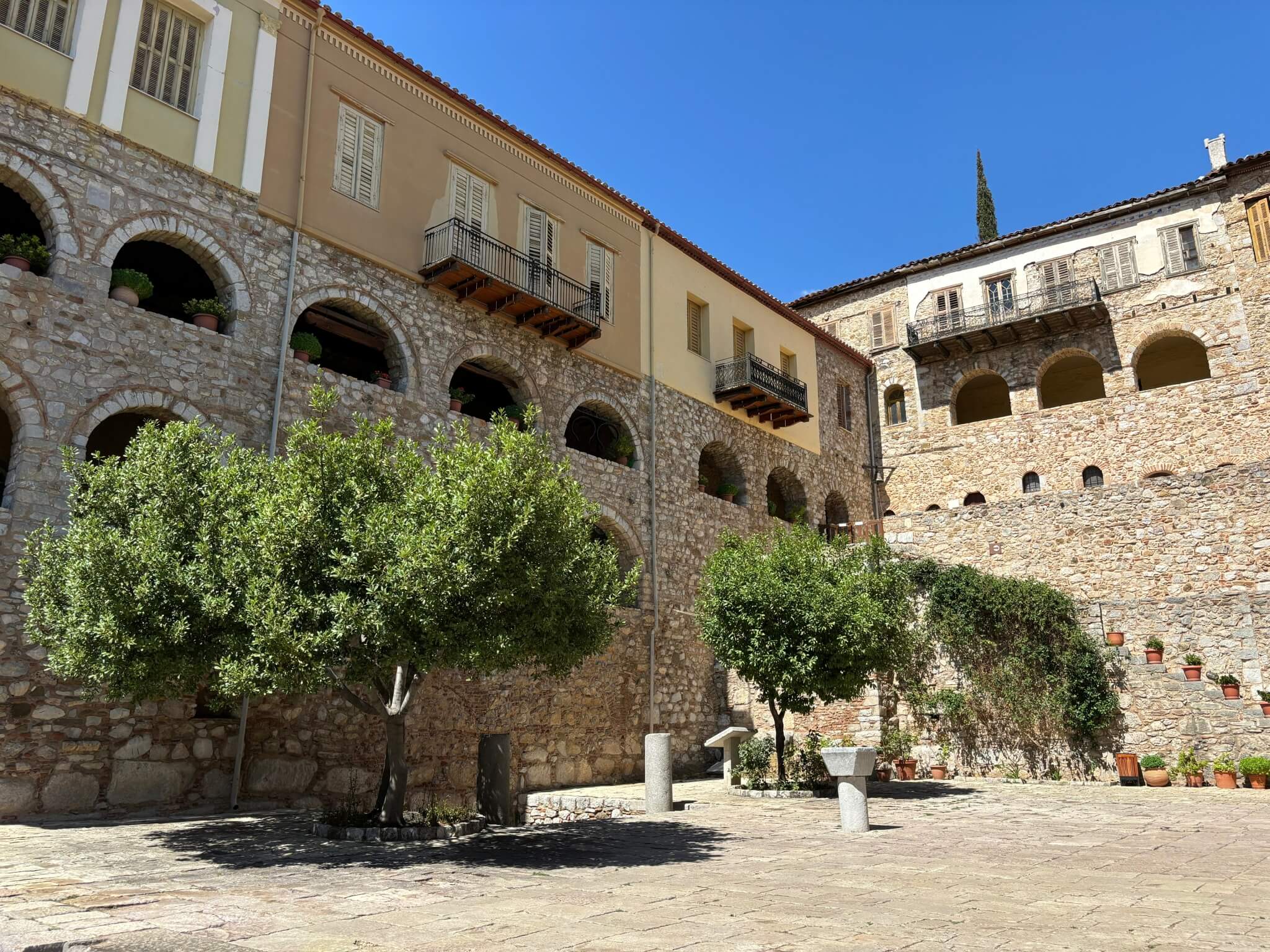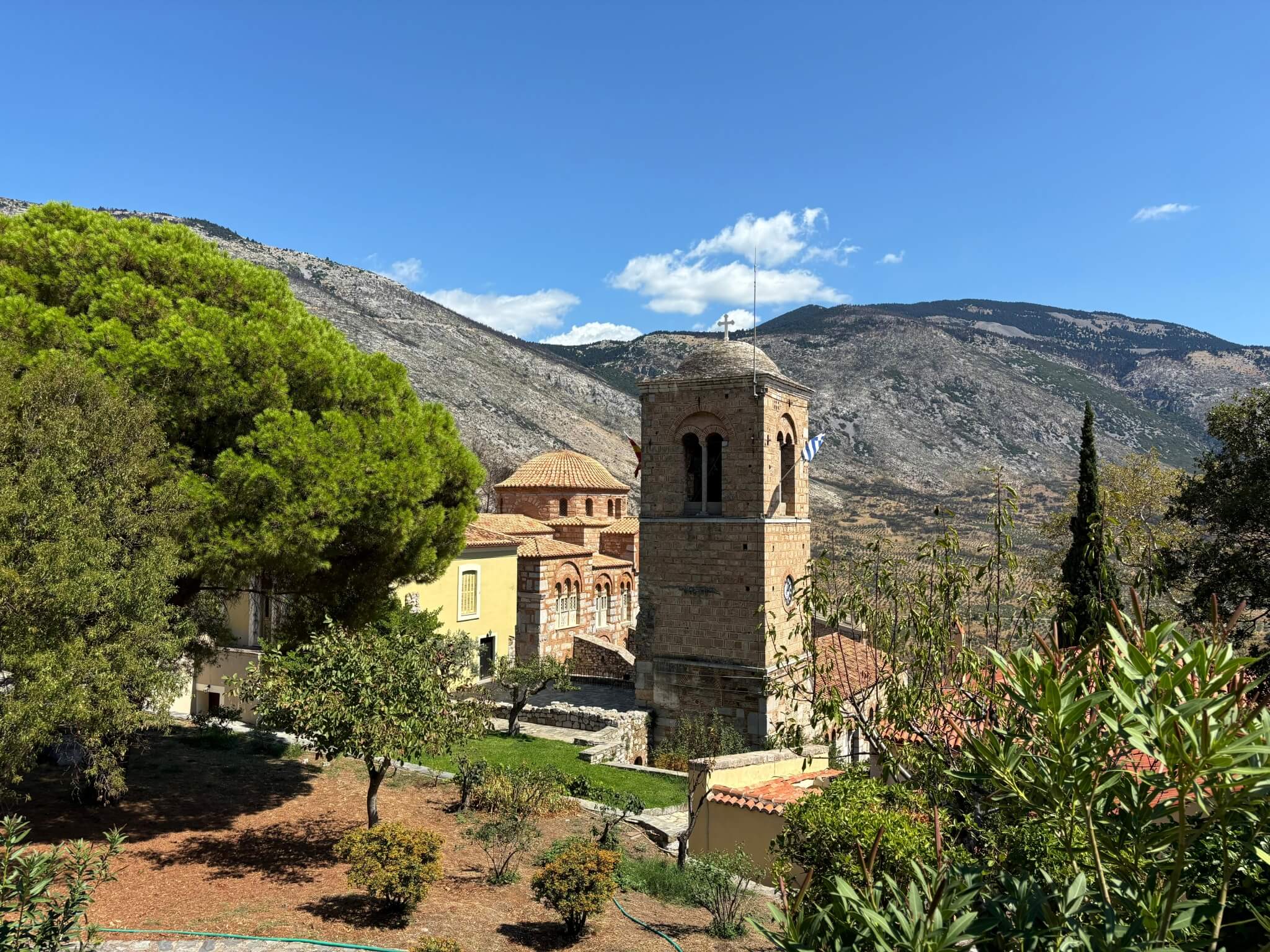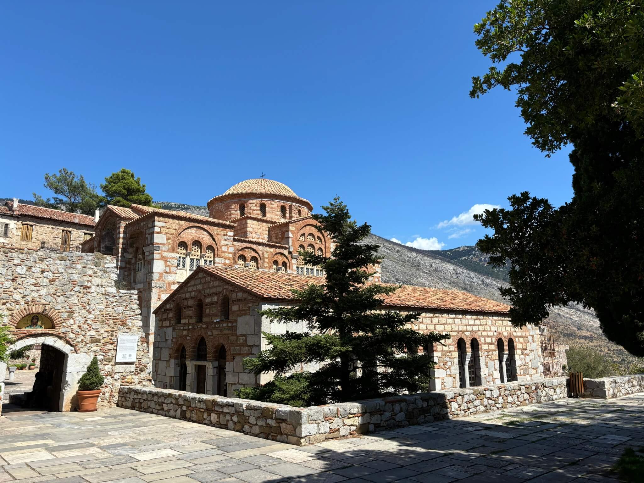 Noch vor Sonnenaufgang starten wir zu den archäologischen Ausgrabungsstätten von Delphi. So können wir die Erläuterungen unseres Guides Penny noch in Ruhe verfolgen. Auch finden wir vor dem großen Ansturm noch genügend Plätze für unsere Wohnmobile. Noch vor unserer Führung stehen wir am Hang vor dem 2457 Meter hohen Parnassgebirge und genießen den Ausblick auf den Golf von Korinth, die Berge des Peloponnes und die Ebene von Amfissa mit ihren unzähligen Olivenbäumen. In der Antike kamen viele Pilger nach Delphi, um den Orakelspruch der Pythia zu erhalten und Apollon zu ehren. Dann beginnt unsere Führung und wir erfahren viele interessante Details zur Geschichte von Delphi und dem dortigen Leben in der Antike. Wir hören auch, dass für die Menschen damals Delphi als Mittelpunkt (Nabel) der Welt galt. Nach der Führung besuchen wir noch das kleine Museum nebenan, wo es weitere eindrucksvolle Ausstellungsstücke zu bestaunen gibt. Ohne einen Orakelspruch zu erhalten, setzen wir unsere Fahrt Richtung Athen fort. Nach wenigen Kilometern verlassen wir die Hauptstraße und biegen nach rechts zum Kloster Osious Loukas ab. Dieses kleine Kloster ist zum einen sehr schön gelegen und zum anderen allemal einen Besuch wert. Besonders die Klosterkirche beeindruckt mit ihren vielen Mosaiken aus dem 11. Jahrhundert. Seit 1990 gehört die Anlage zum UNESCO-Weltkulturerbe. Ein Klosterladen mit kleinem Café lädt zu einer Pause ein. Mit einem guten Cappuccino lässt sich der grandiose Ausblick noch besser genießen. Beeindruckend ist auch, dass das Kloster bei den großen Waldbränden in dieser Region geschützt werden konnte. Viele Hubschrauberflüge waren dafür notwendig. Um das Kloster herum sind die Brandfolgen noch sehr gut sichtbar. Weiter geht unsere Fahrt auf schmalen Straßen durch kleine Dörfer und unberührte Natur. Nachdem wir den höchsten Punkt mit ca. 1000 m ü. NN passiert haben, geht es langsam abwärts, Athen entgegen. Leider können wir das Kloster Dafni kurz vor Athen heute wegen des Ruhetages nicht besichtigen. Nachdem alle Reiseteilnehmer den Campingplatz erreicht haben, treffen wir uns um 18 Uhr zu einer kurzen Abstimmung für den Ablauf am morgigen Tag. Danach sitzen wir noch länger gemütlich beisammen. Die Reiseleitung hat etwas Brot, Tzatziki und andere Aufstriche besorgt. Wein vom Vortag ist auch noch übrig. Als dieser ausgetrunken ist, sorgt Nati für Nachschub.