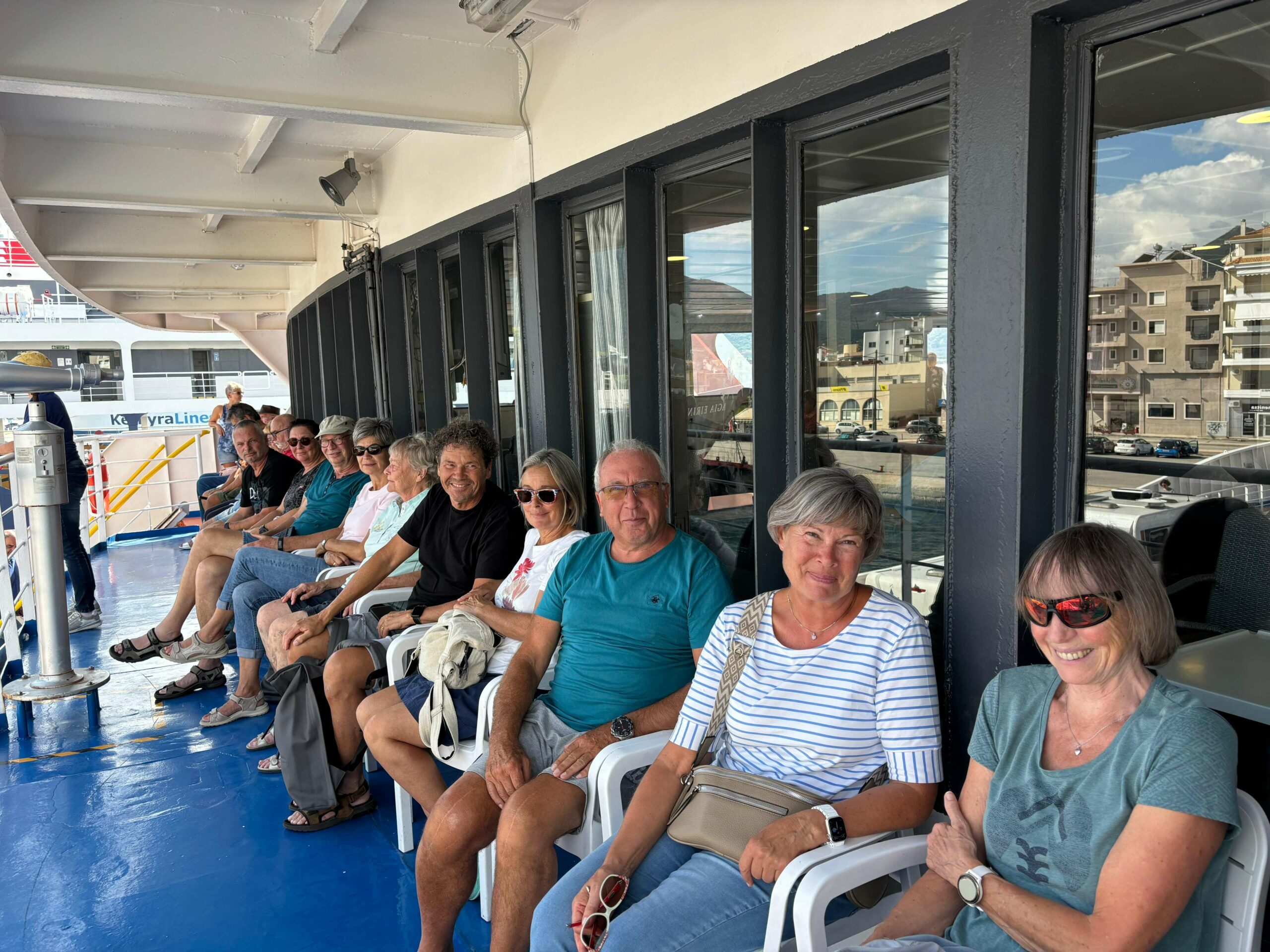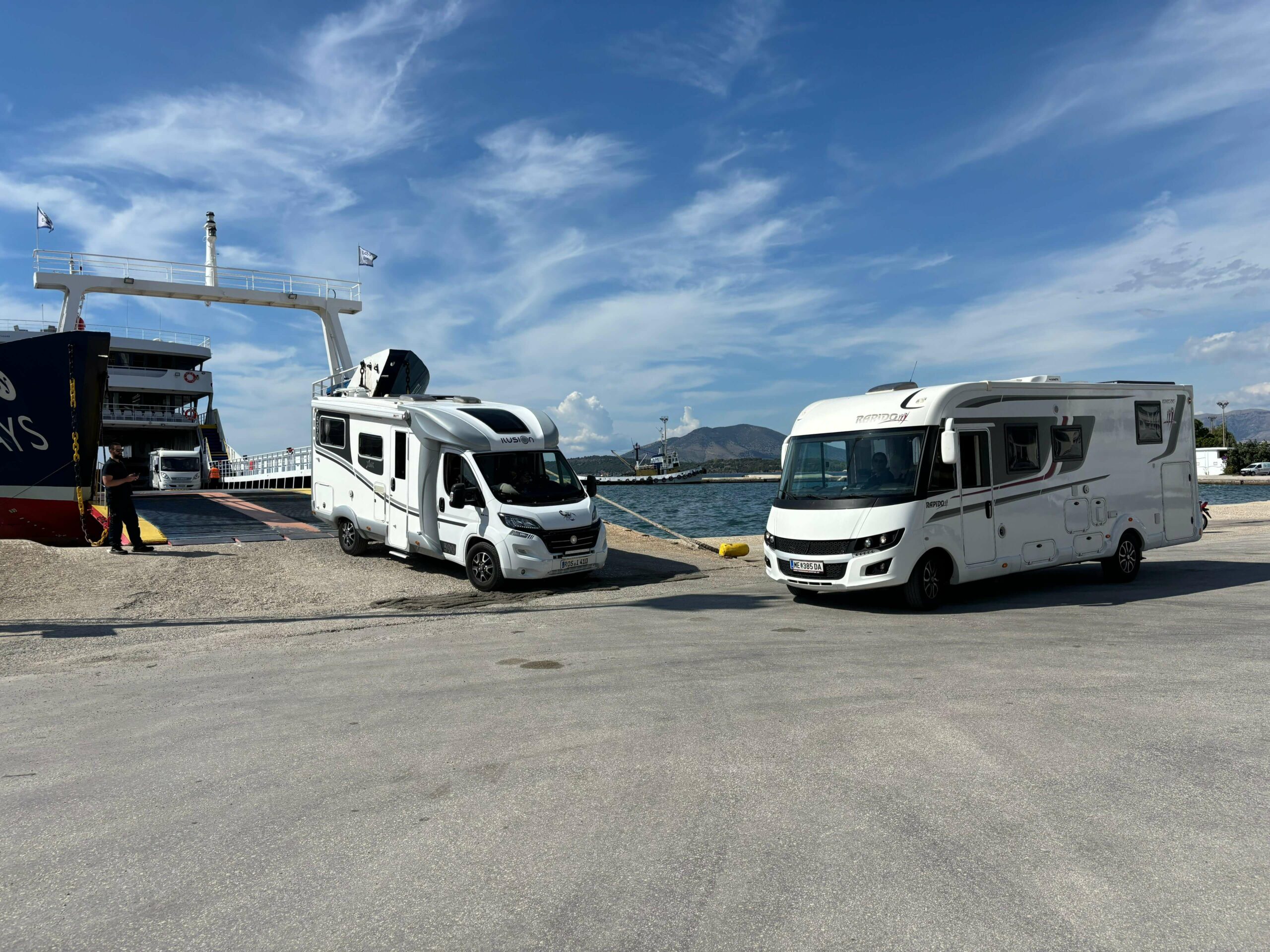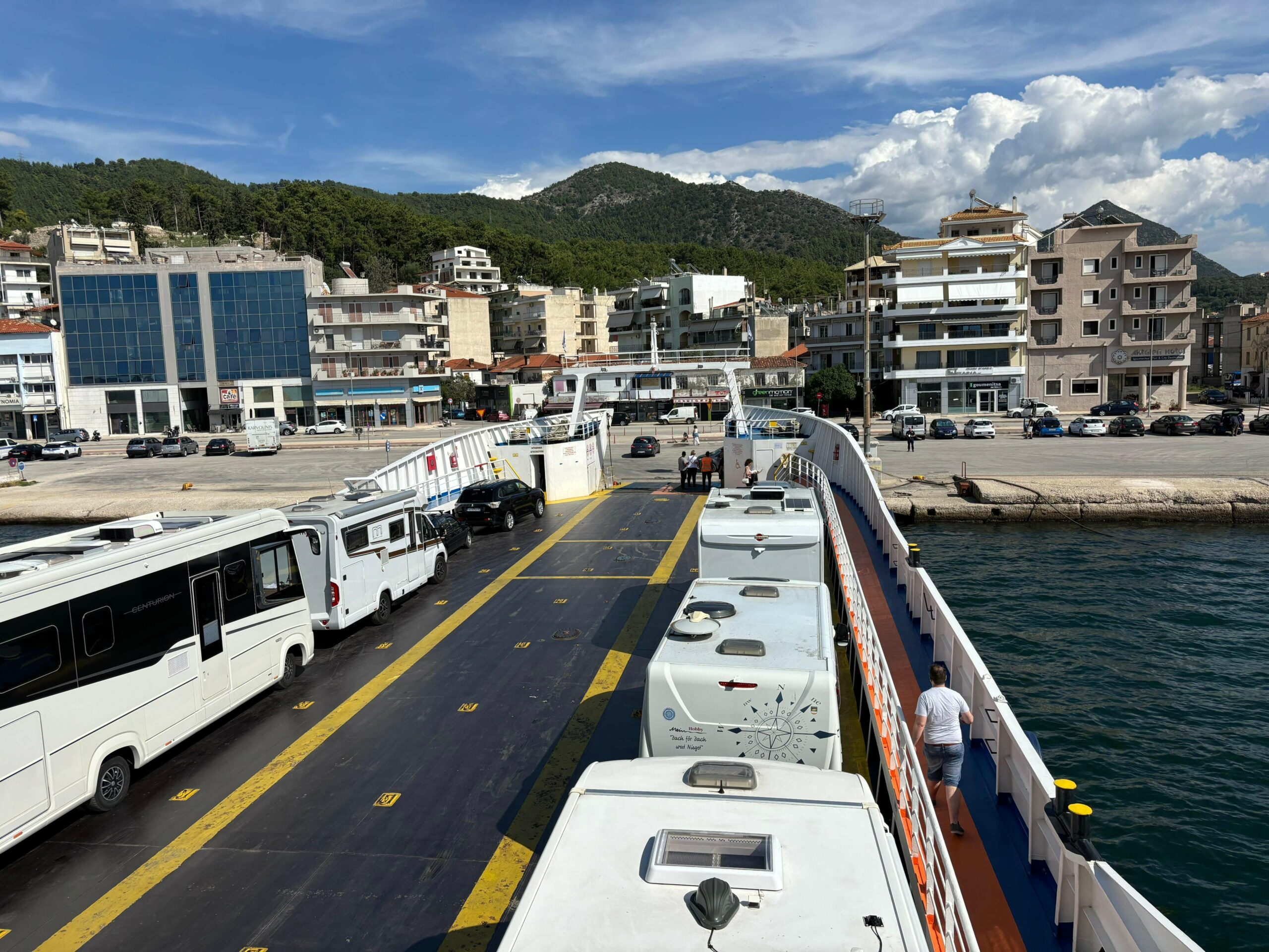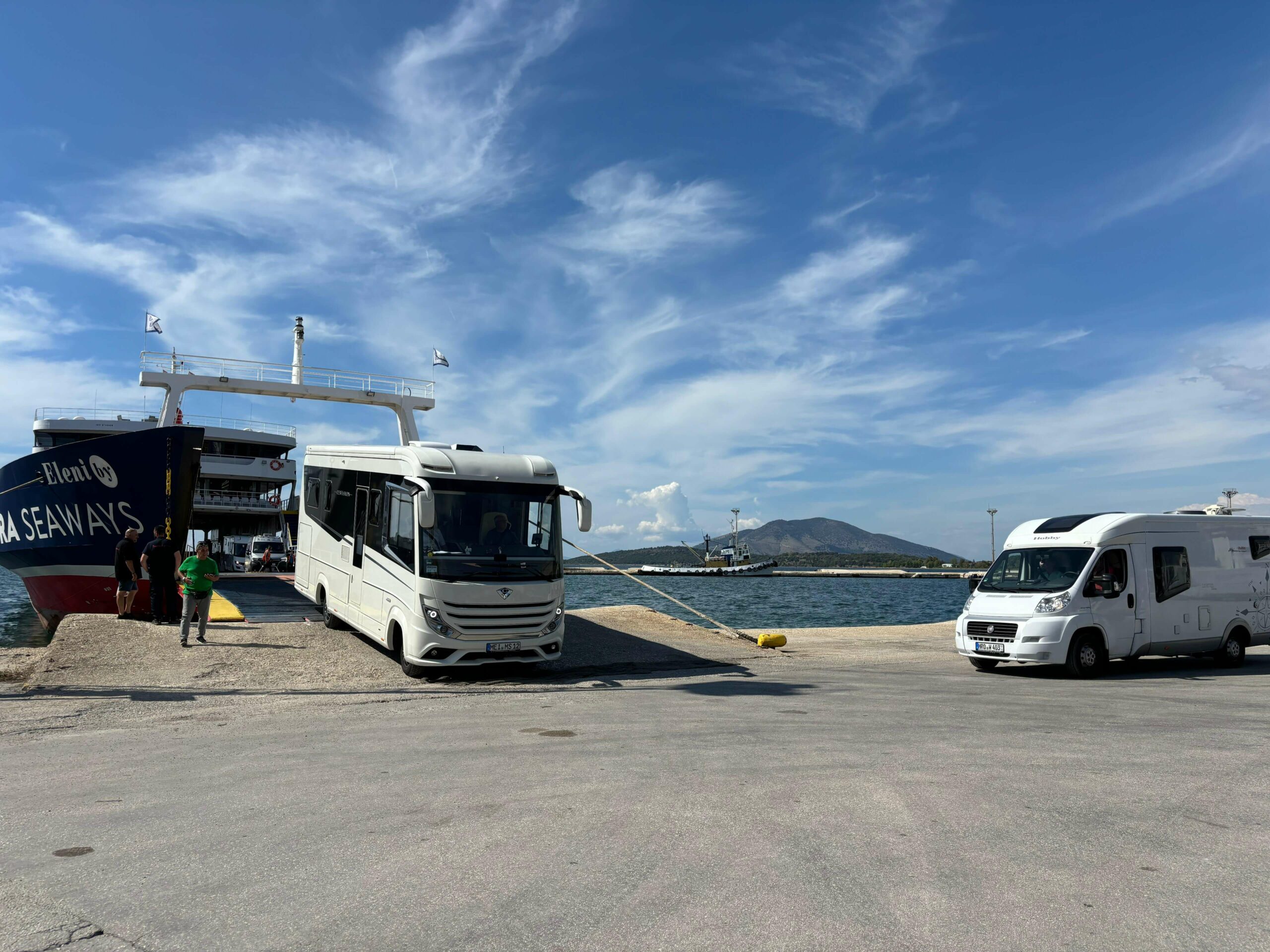 Nach einer ruhigen Überfahrt durch Adria und Mittelmeer erreichen wir bei bestem Wetter gegen Mittag Igoumenitsa. Hier wechseln wir kurz vom internationalen in den nationalen Hafen. Um 15:30 Uhr geht es mit der Fähre zu unserem Ziel für die nächsten zwei Tage, nach Korfu. Nach kurzer Fahrt erreichen wir gut gelaunt gegen 17 Uhr die Insel und nehmen die Fahrt zu unserem ersten Campingplatz in Angriff. Nachdem alle ihren Platz gefunden und sich eingerichtet haben, treffen wir uns zu unserer ersten gemeinsamen Besprechung. Mit einem Gläschen Sekt stoßen wir auf eine gute und unfallfreie Rundreise an. Nach einer kurzen Vorstellungsrunde besprechen wir die notwendigen organisatorischen Dinge der Tour und das Programm für die nächsten zwei Tage auf Korfu. Am Abend gehen einige in eines der vielen Restaurants am Strand oder am Campingplatz zum Abendessen. Andere gehen schnell auf eine Runde schwimmen ins Mittelmeer oder entspannen im Wohnmobil.