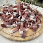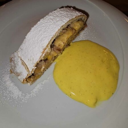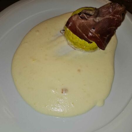 und danach noch einmal ein sehr leckeres Vier-Gänge-Menü. Als 1. Gang: Zarter Spargelkuchen, Casolet Käse-Creme und geschmorter Speck.