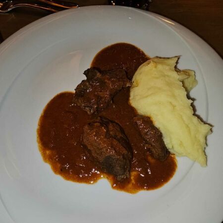 Als 3. Gang: Hirschgulasch und Kartoffelpüree.