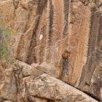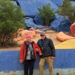 Dann fahren wir nach einer Pause weiter und sehen das Haus des 1. Ministers Marokkos, danach die „Blauen Steine“. Ein belgischer Künstler hat in den 1980er Jahren 20.000 kg blauer Farbe hierher gebracht und Felsen angestrichen. War Cannabis schuld oder ist es wirklich Kunst, das mag jeder für sich selbst entscheiden. Auf jeden Fall sind die Steine ein Besuchermagnet. Auch wissen wir jetzt, wo und wie Skorpione zu finden sind. Wir sehen noch eine ca. 2.500 Jahre alte Felszeichnung, dann geht es zurück zum Camp.