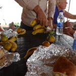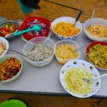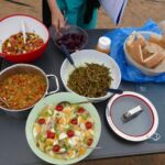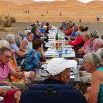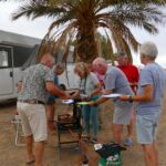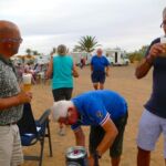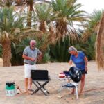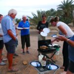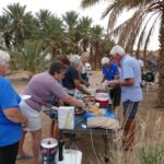 Zurück von unserem kurzweiligen Ausflug gibt es eine Campertafel in der Sahara. Fleißige Hände haben ein tolles Salatbuffet zusammengestellt. Die Grills laufen auf Hochtouren und Getränke stehen von verschiedenen Spendern auch zur Verfügung.