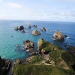 Den Nugget Point haben wir nach wenigen Kilometern erreicht und legen vom Parkplatz die letzten 850m zum Leuchtturm zu Fuß zurück. Ein Spaziergang zum Genießen. Rechts und links fallen die Wände steil zum Meer hinunter, vertikale Felsformationen steigen aus dem Meer.