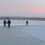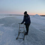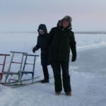 Auf dem zugefrorenen See am Camp versuchen sich einige im Schlittenscating …