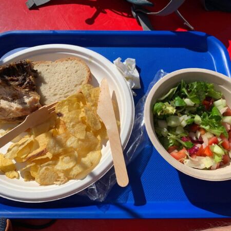 Danach stärken wir uns auf dem Schiff mit gegrillten Hähnchen, Salat, Chips und Wein, bevor wir langsam zurücktuckern.